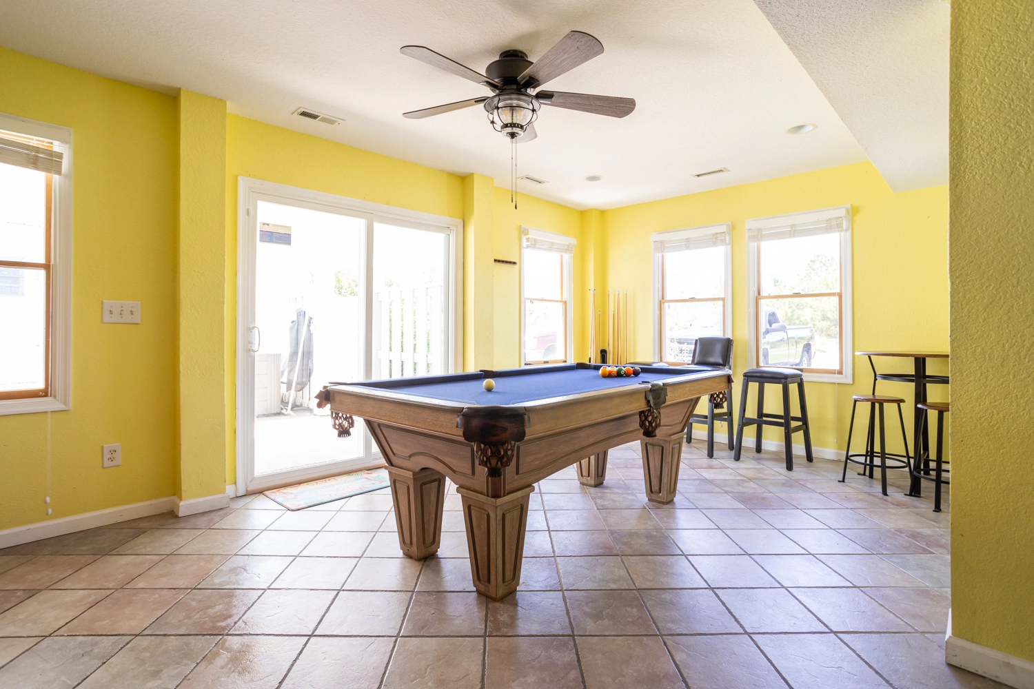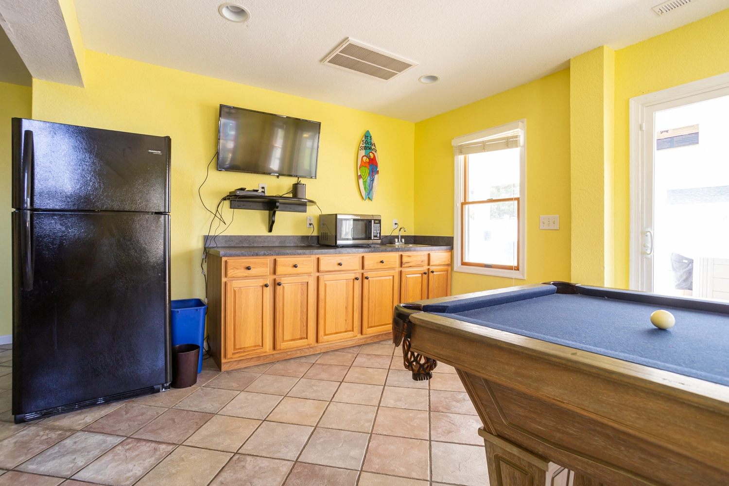 Rec room with pool table and wet bar with refrigerator and microwave; laundry.