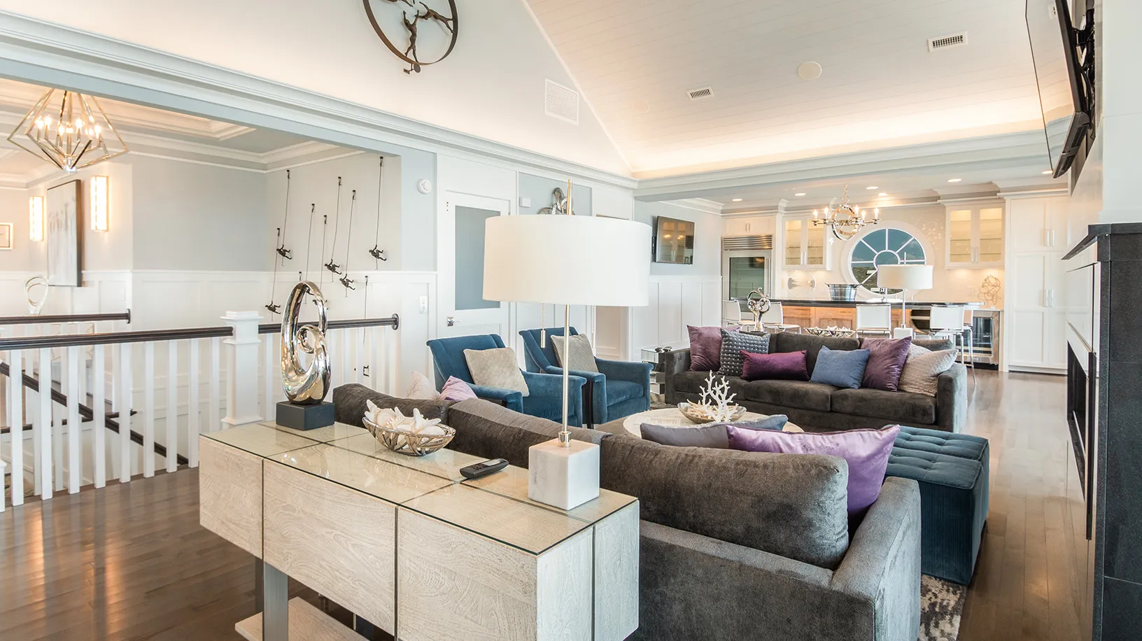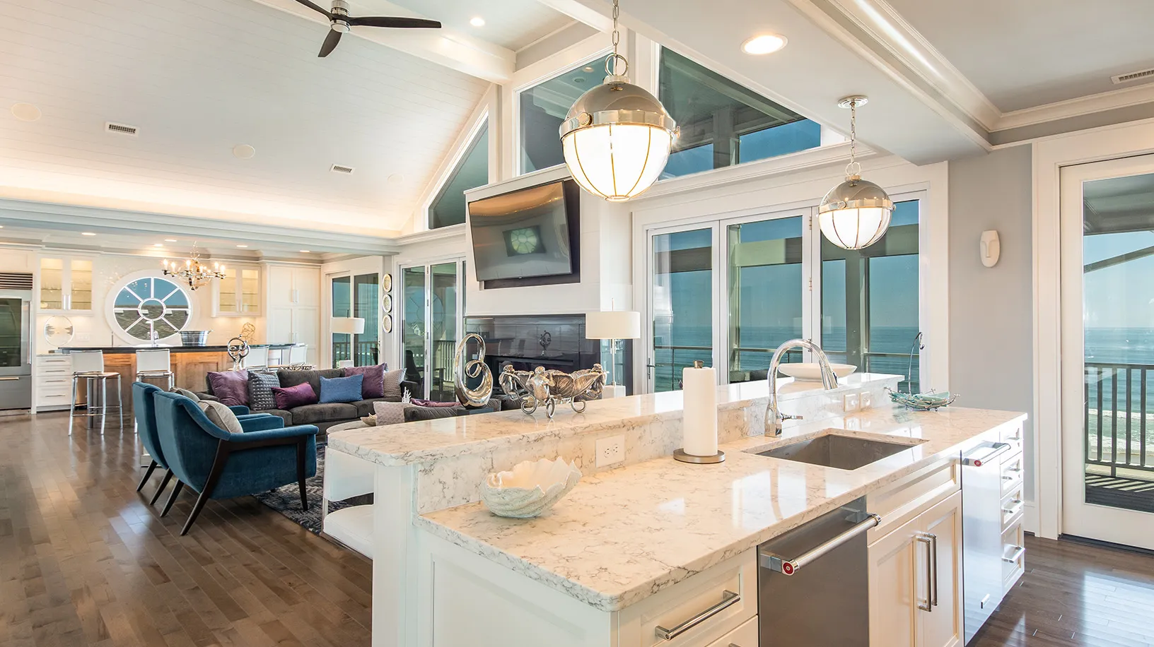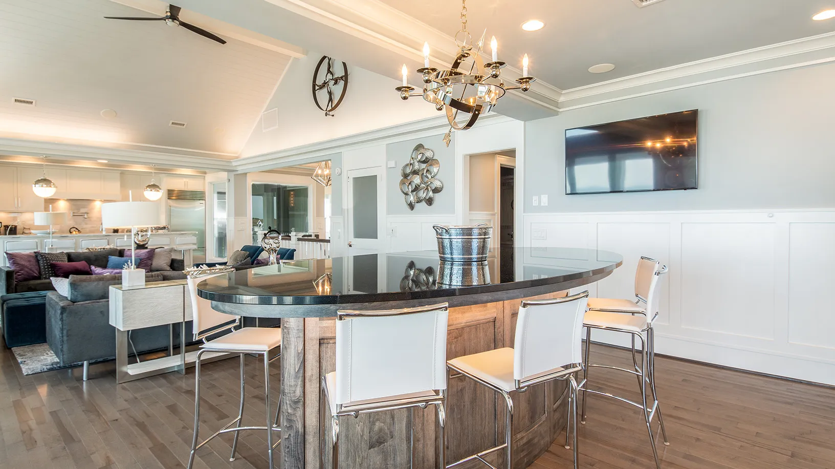 Great room; kitchen; dining area; pub bar; screened porch.