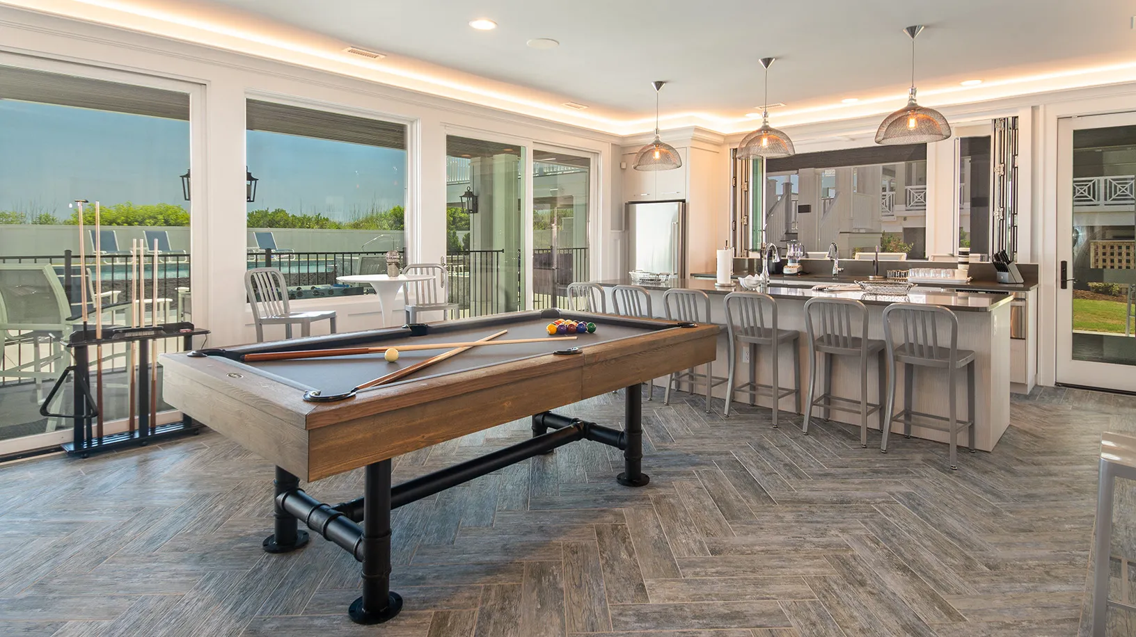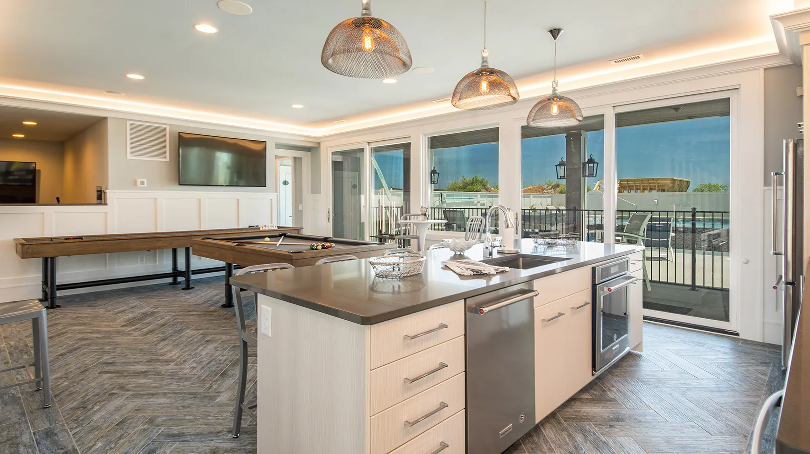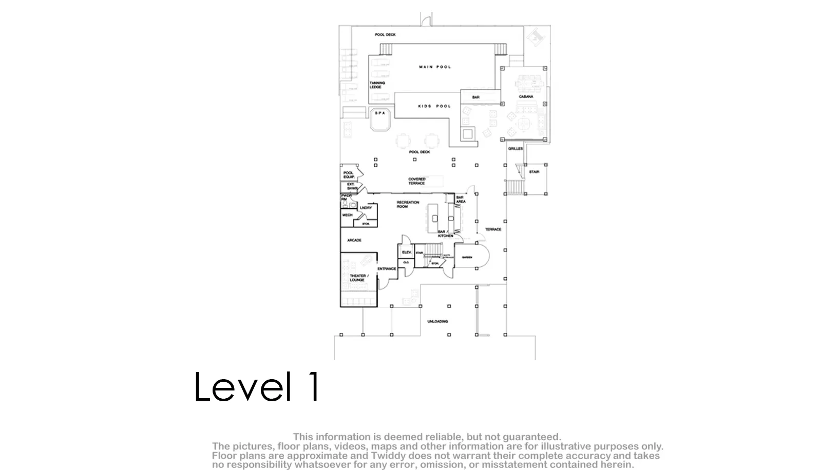 Theater room; rec room with pool table and arcade; kitchen with indoor/outdoor bar; laundry.