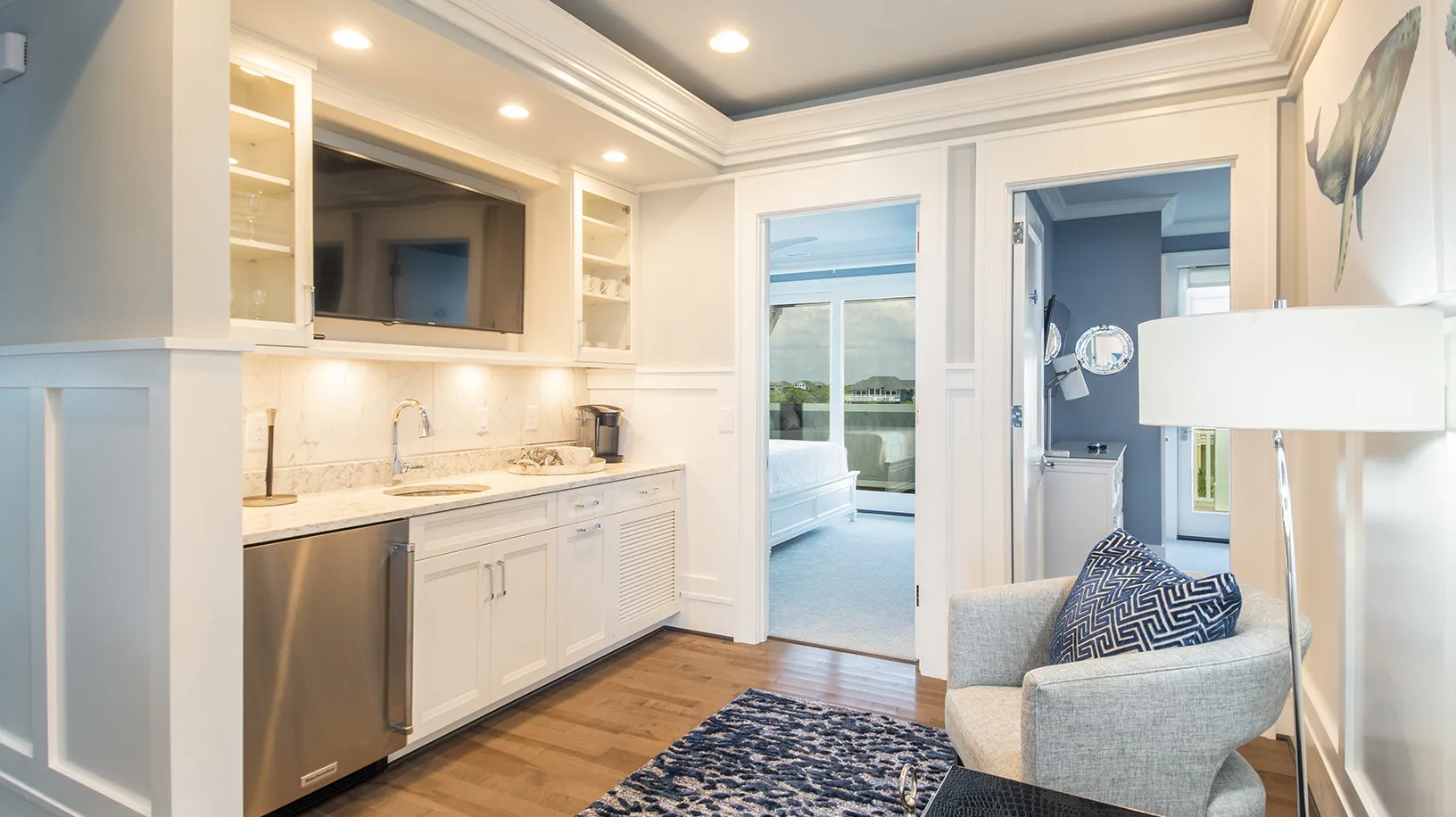 Sitting area with wet bar.