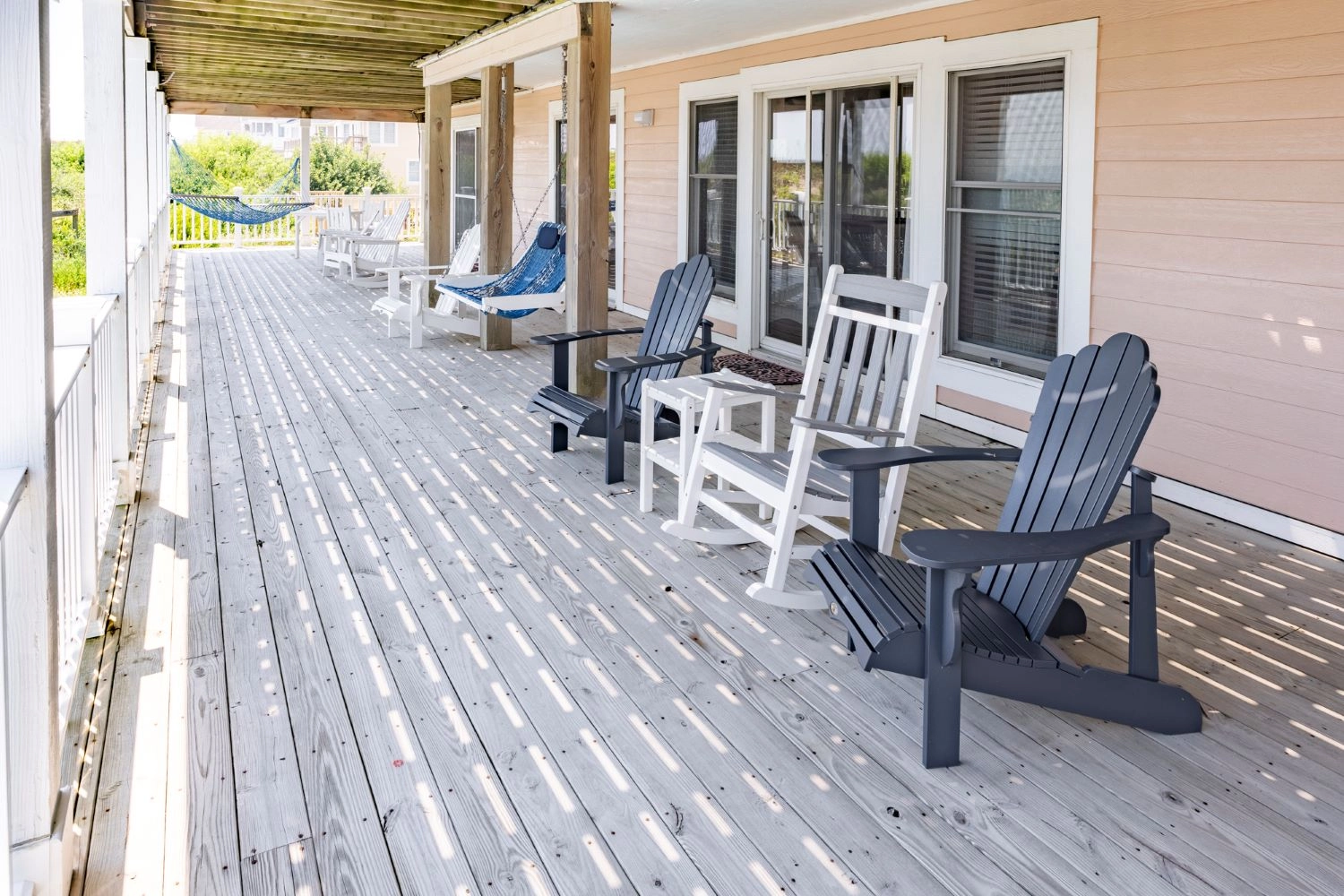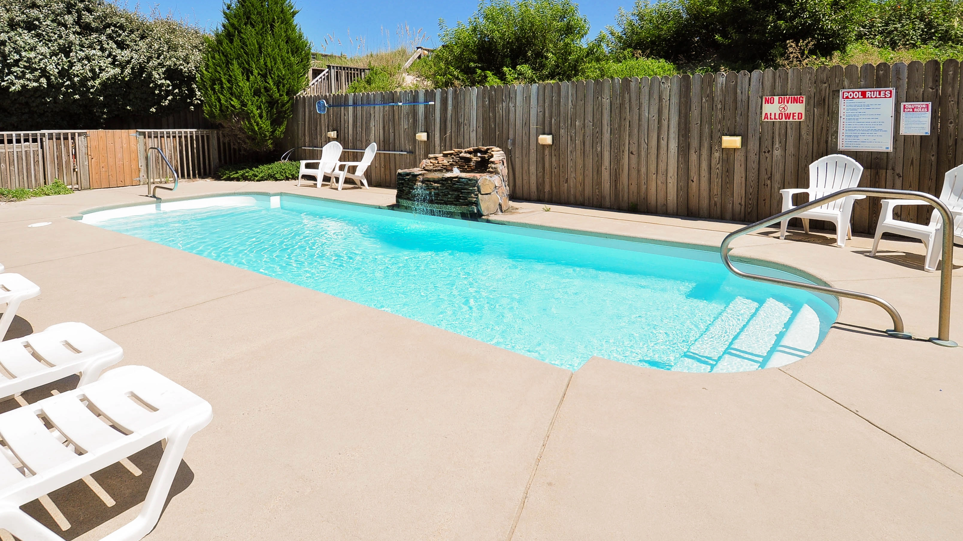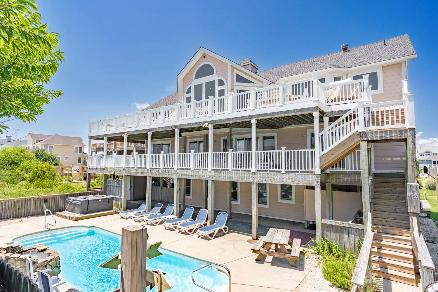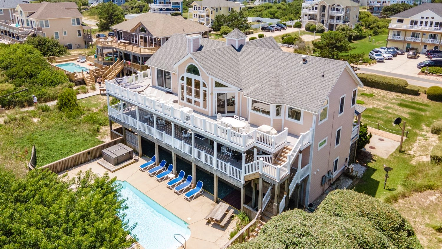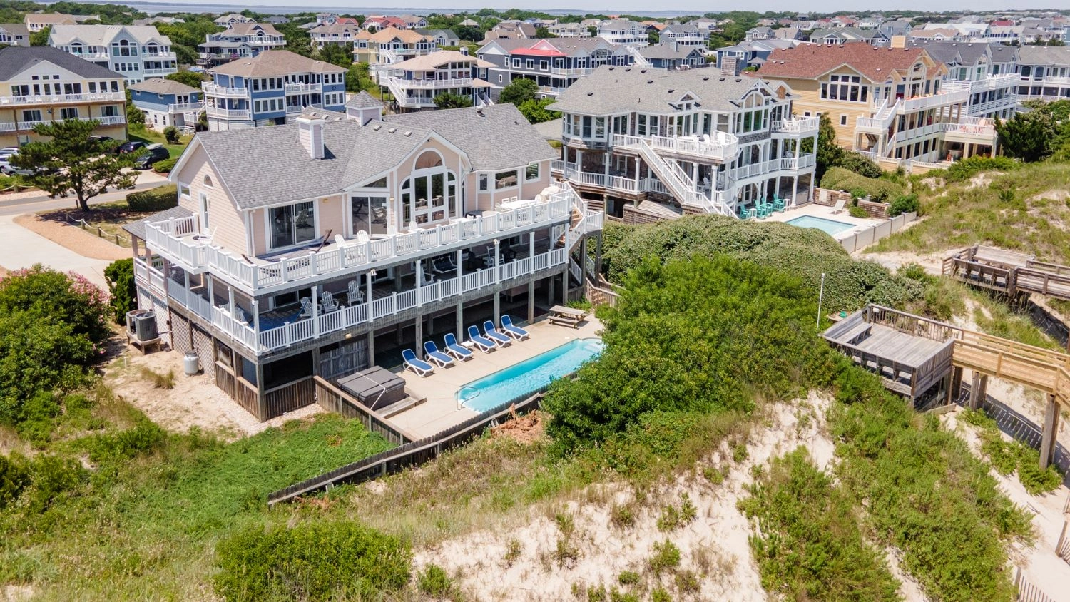 "The Painted Lady was great to accommodate our 3 generations of family (9 kids and 9 adults). Lots of space, nice bedrooms/bathrooms and ample seating for meals and movie watching. The pool and private dune deck were key! Thank you for the ice machine - it was a favorite perk in the house! The midges paid us a visit, but I guess they cannot be avoided. Only complaint: the outside shower could use some sprucing up - it was a little sad and dreary in there. We loved our week in OBX...thanks Painted Lady!"