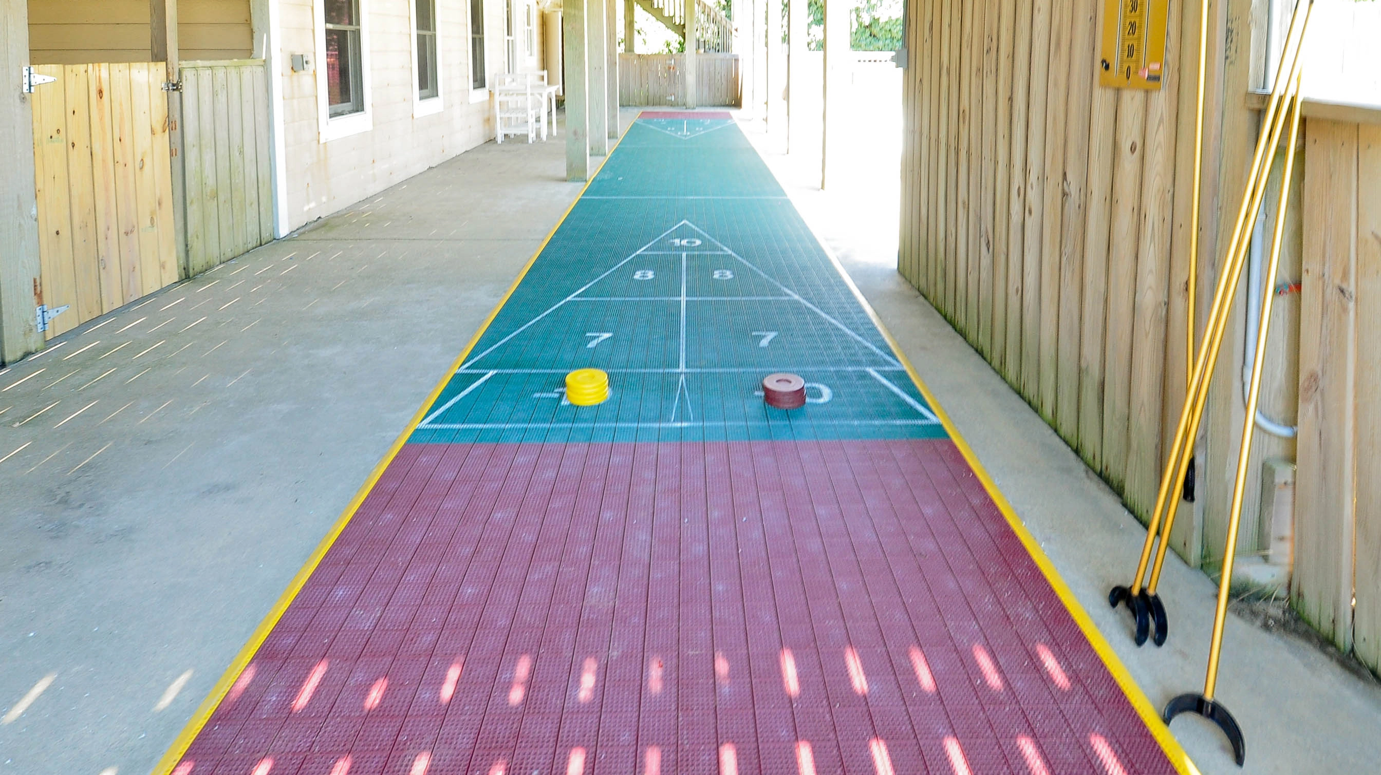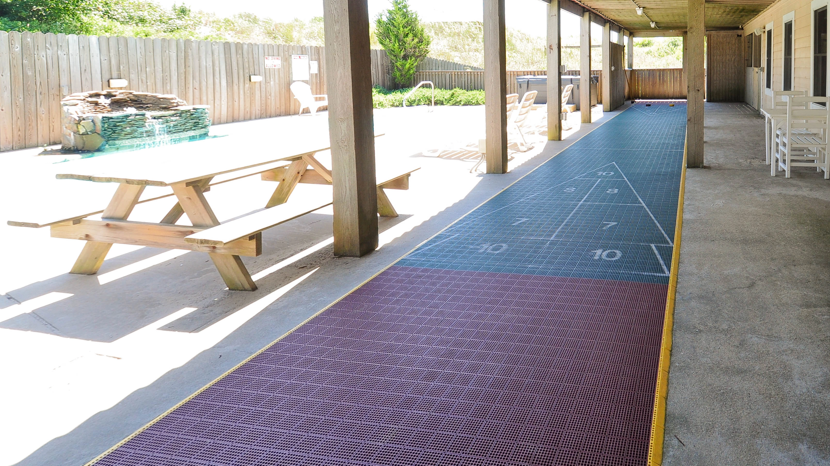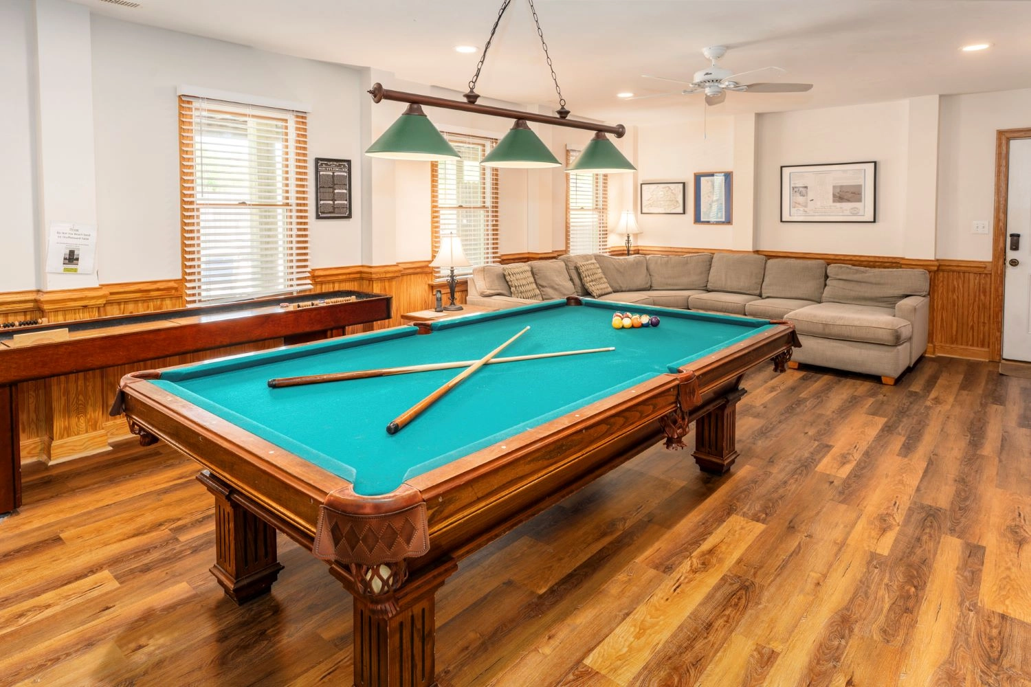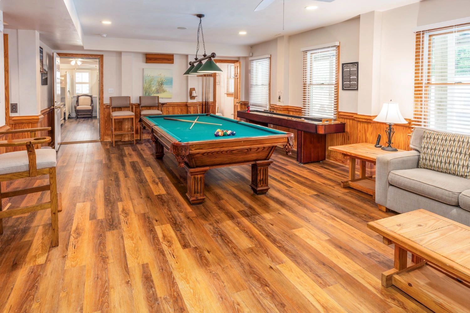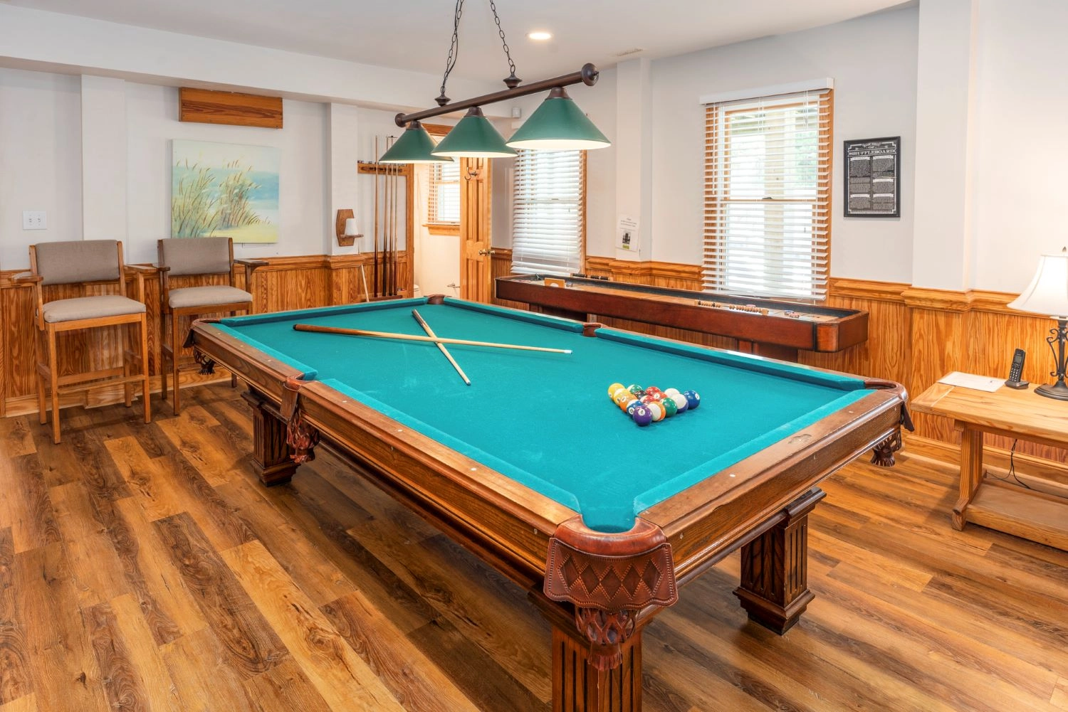 Rec room with 9' regulation slate pool table, indoor shuffleboard, surround sound and refrigerator; patio with private pool, hot tub and outdoor, lighted shuffleboard.
