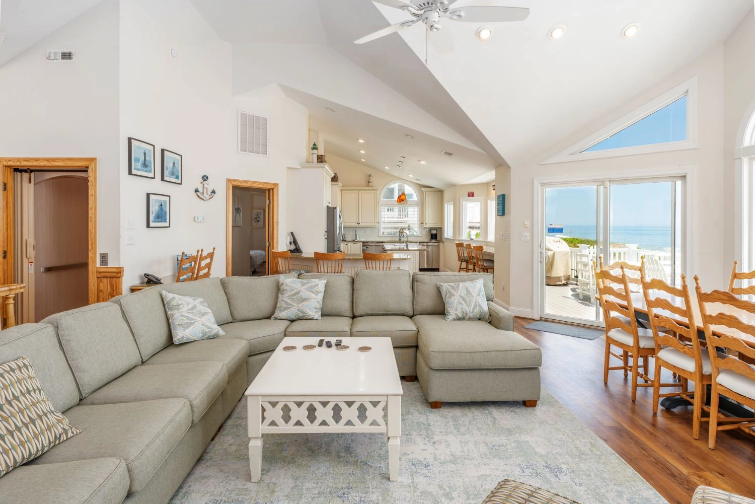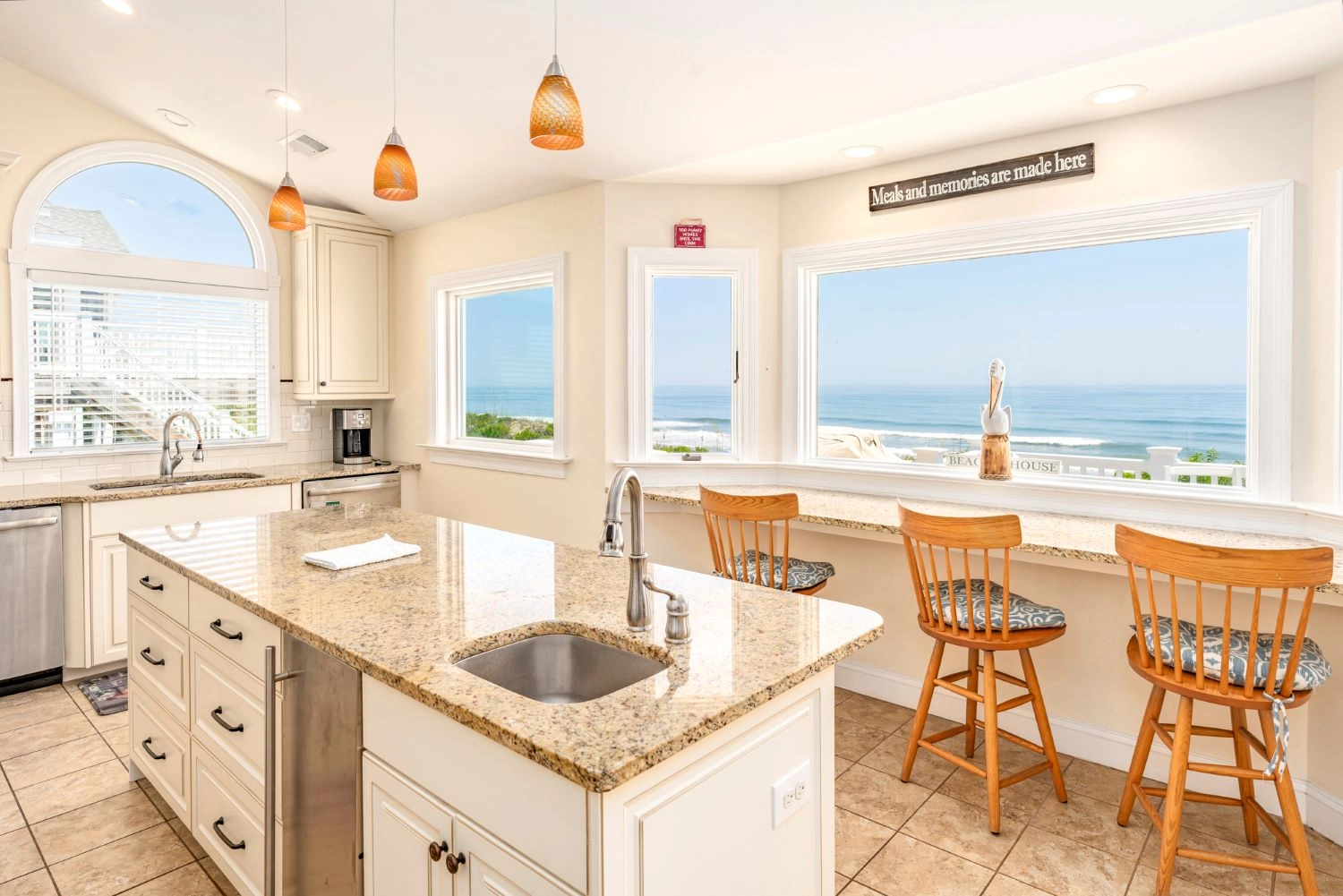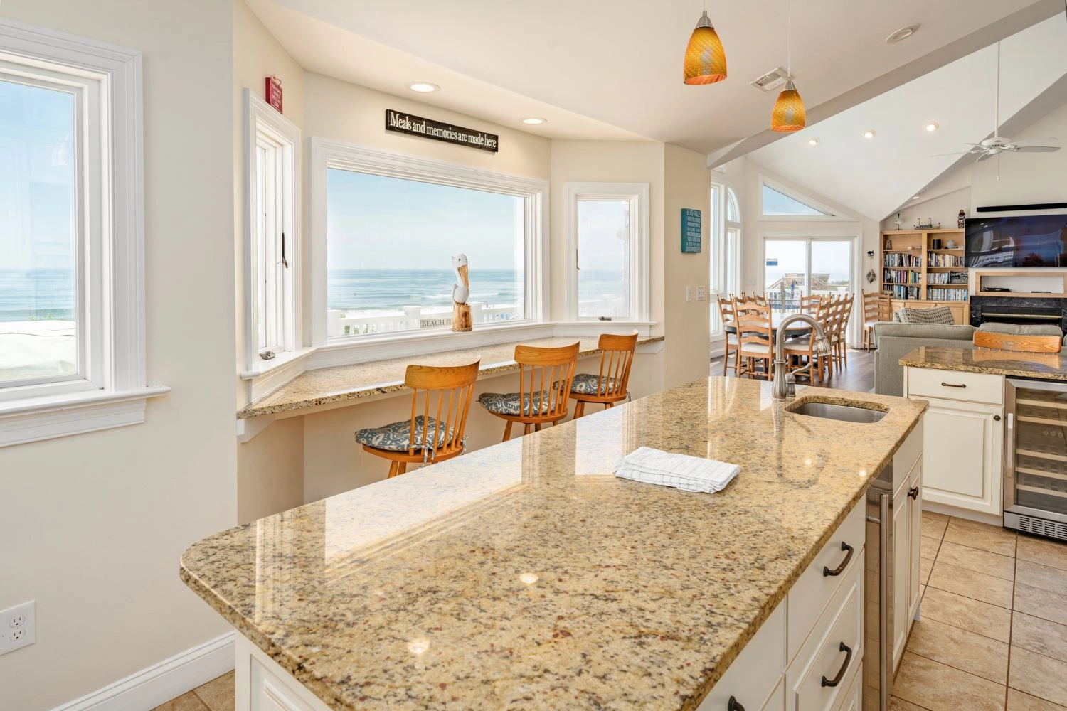 Great room with surround sound and wet bar; ocean view counter and stools for morning coffee or evening cocktails; kitchen with granite counters, wine cooler, two dishwashers, double oven, gas stove and room for group cooking; dining area; card/game area; desk alcove; deck with gas grill.