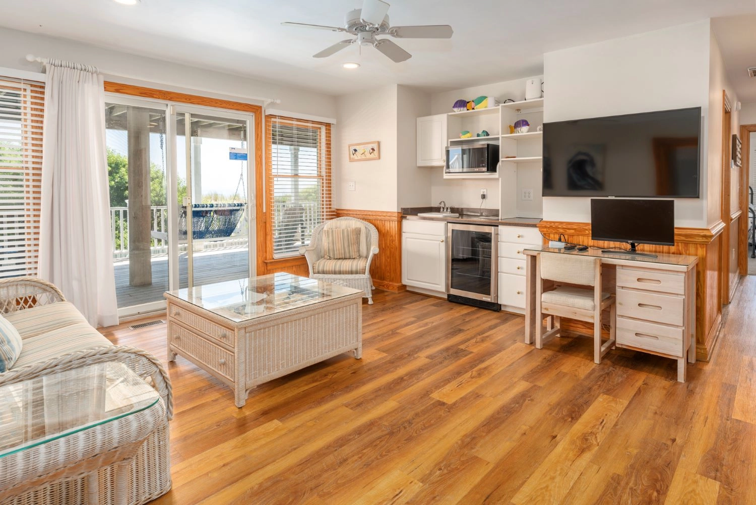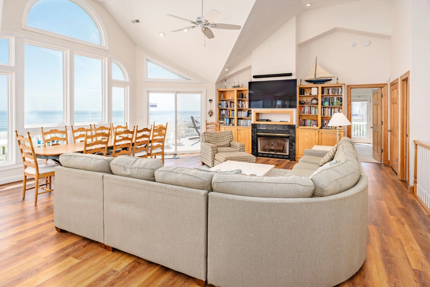 Open den with desk, kitchenette and drink refrigerator and deck access. Three bedrooms with ocean views and access to the wrap-around deck.