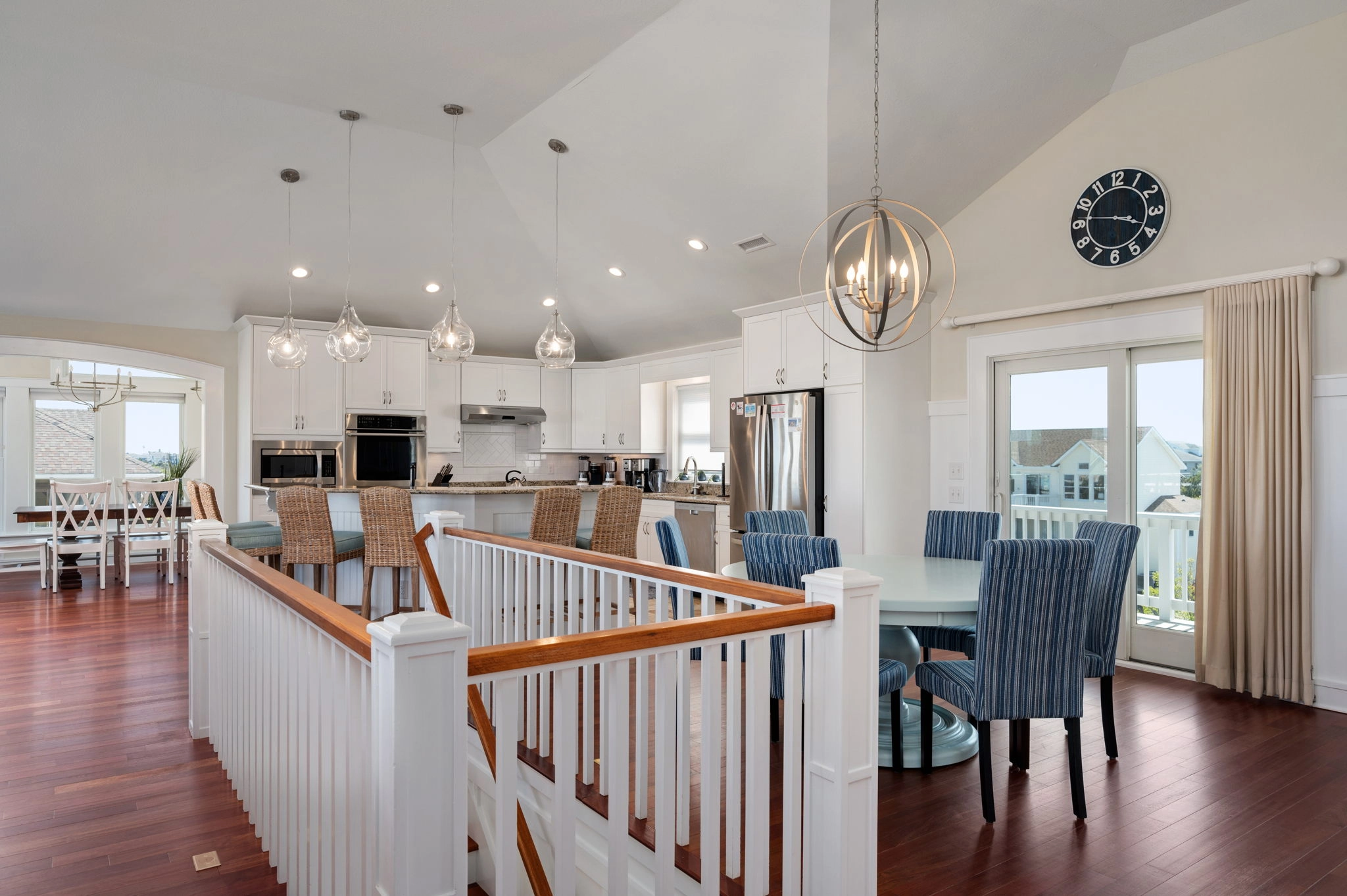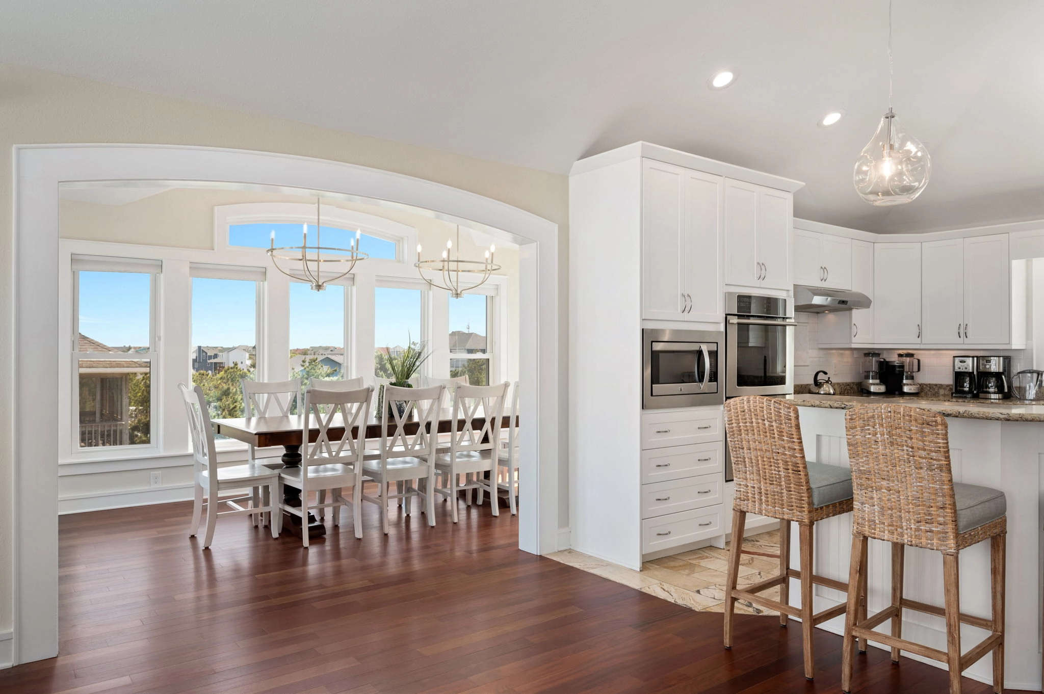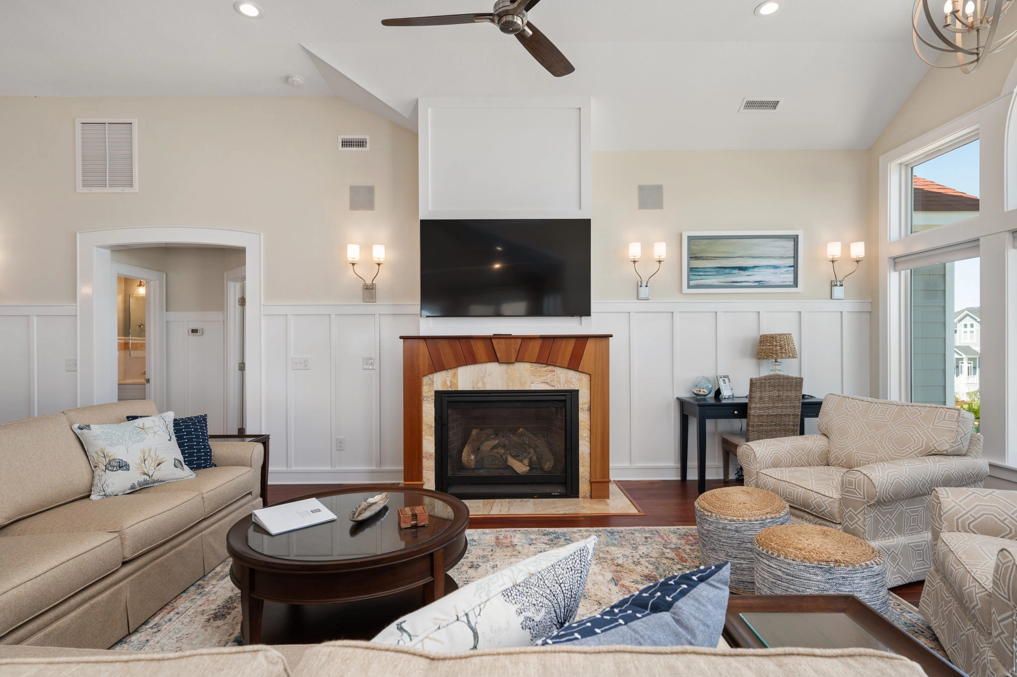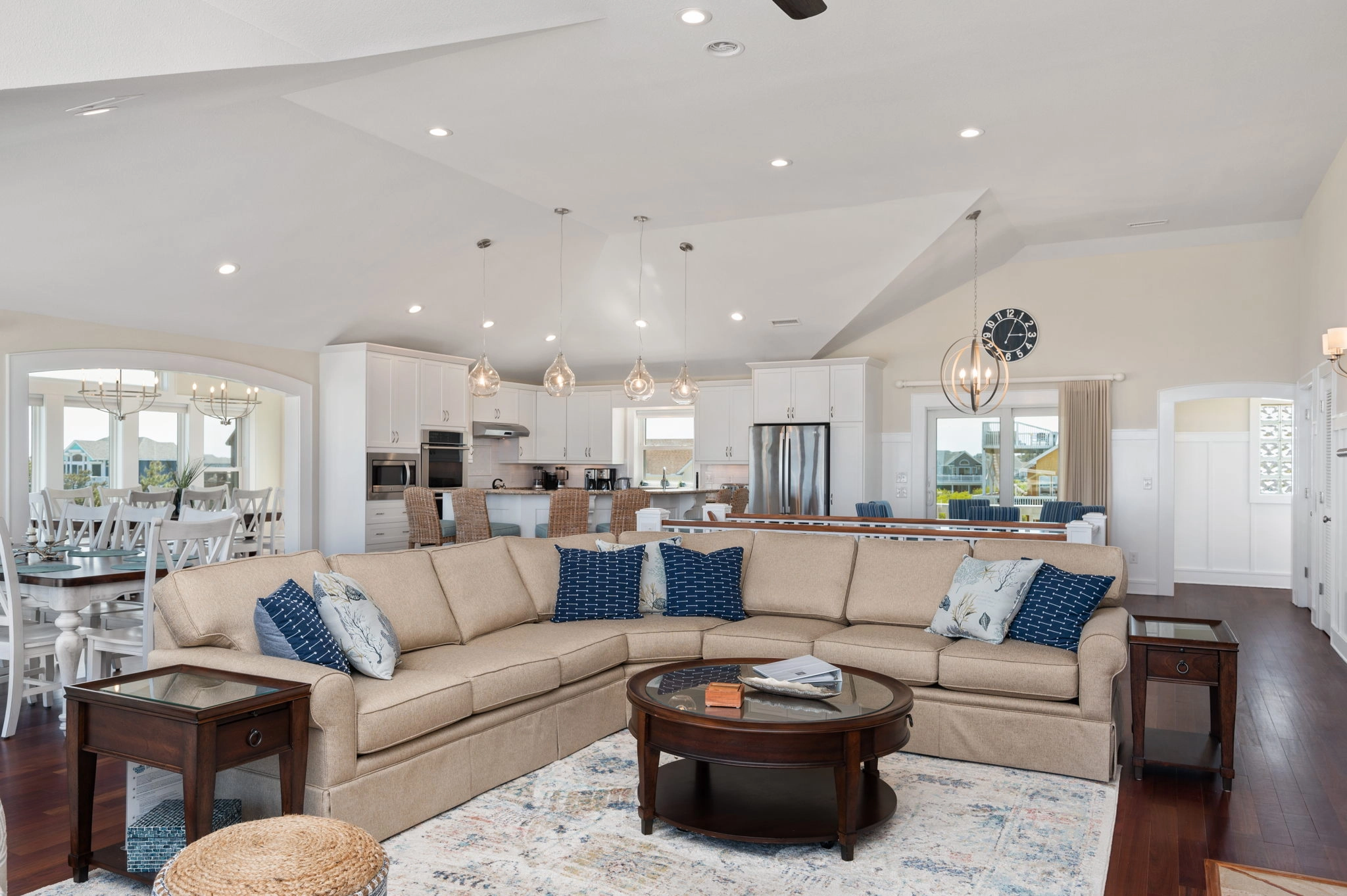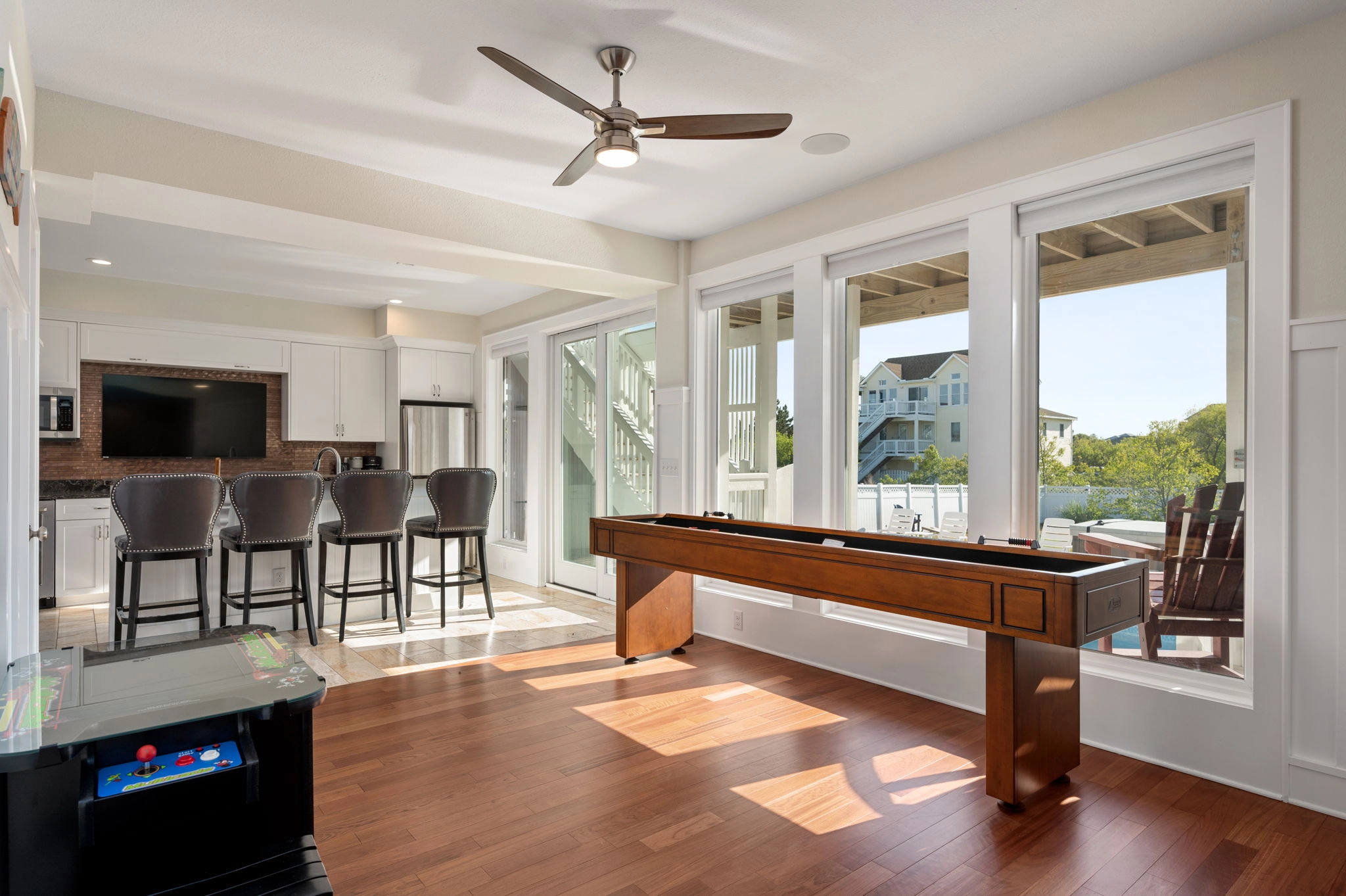 Great room with gas fireplace and shuffleboard; kitchen with two dishwashers, beverage refrigerator; dining area.