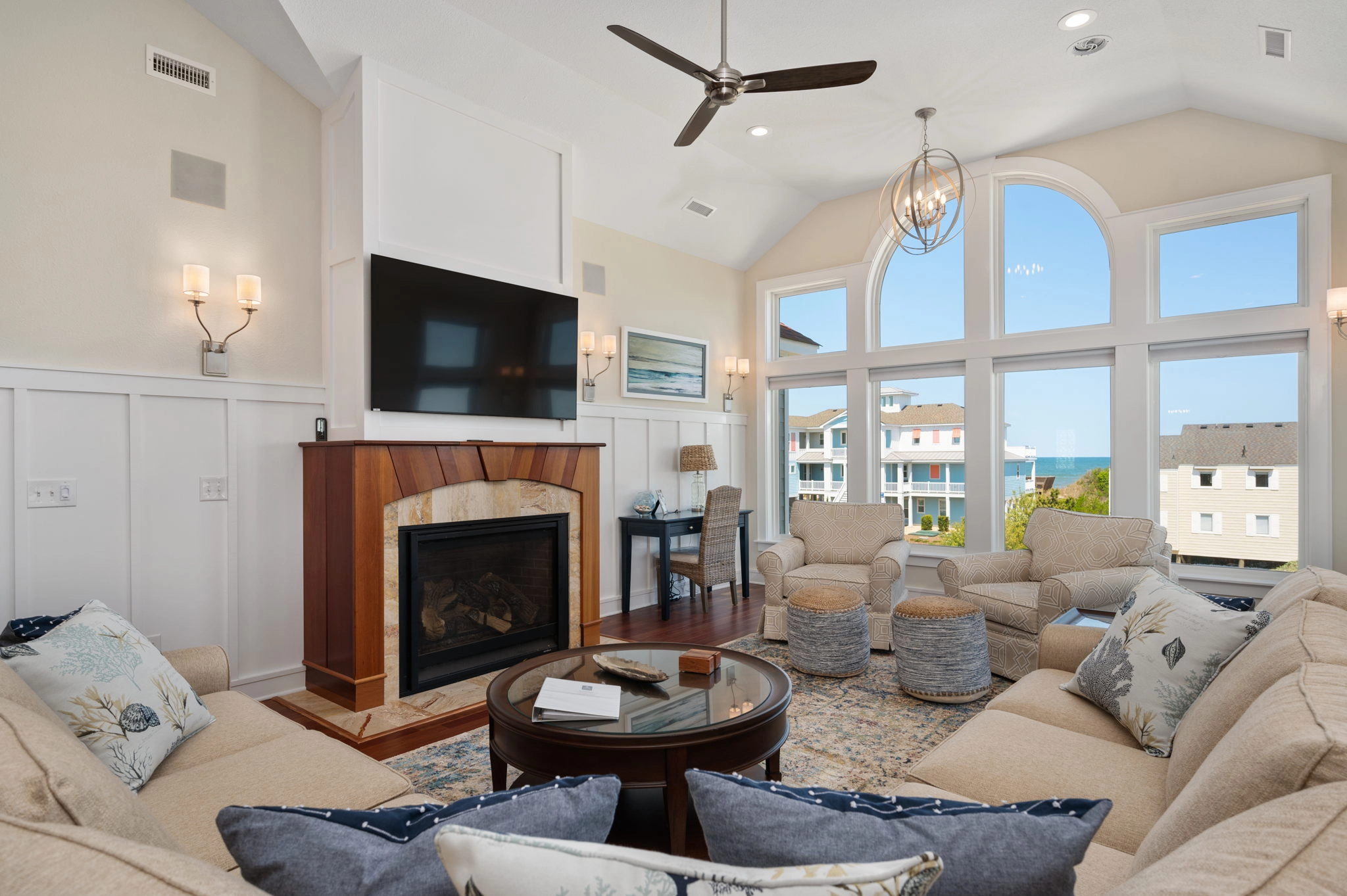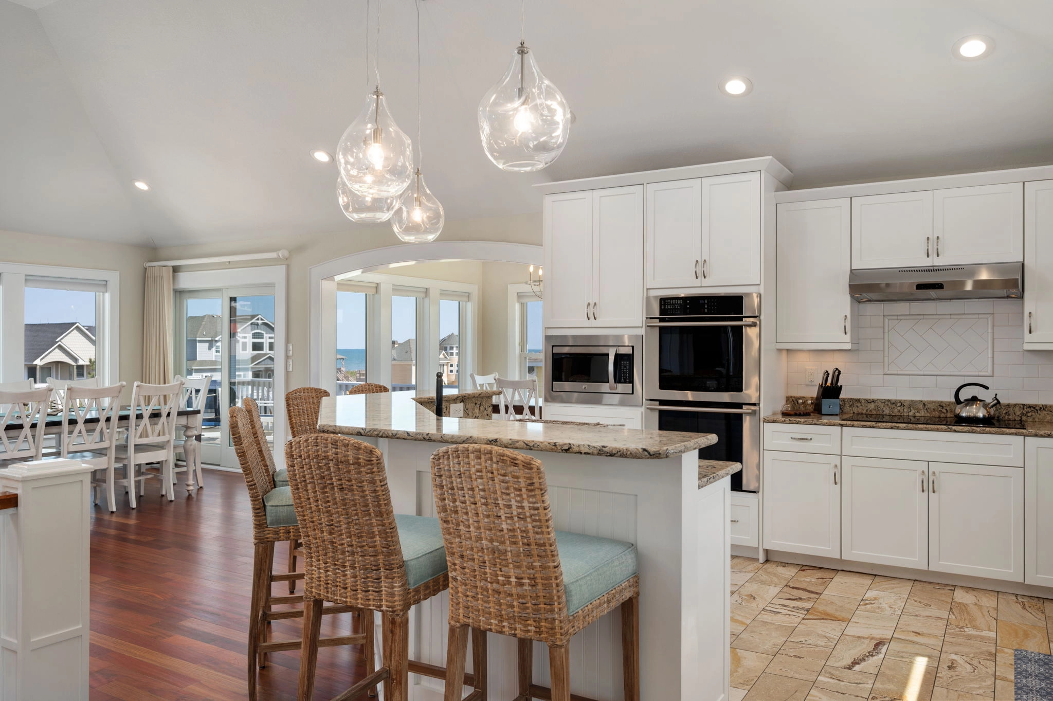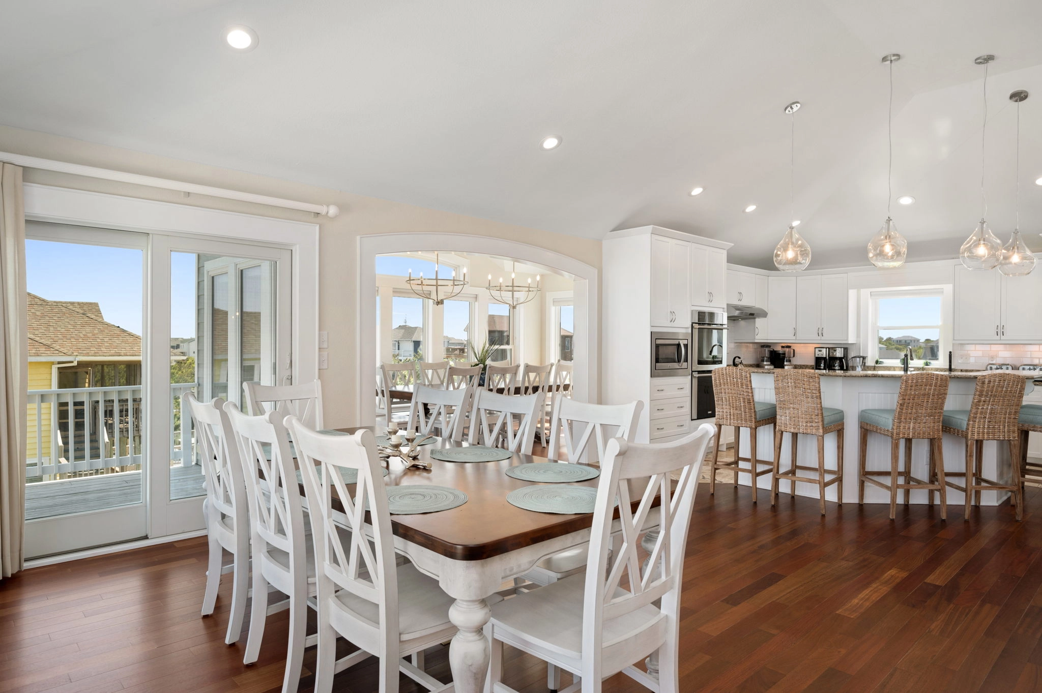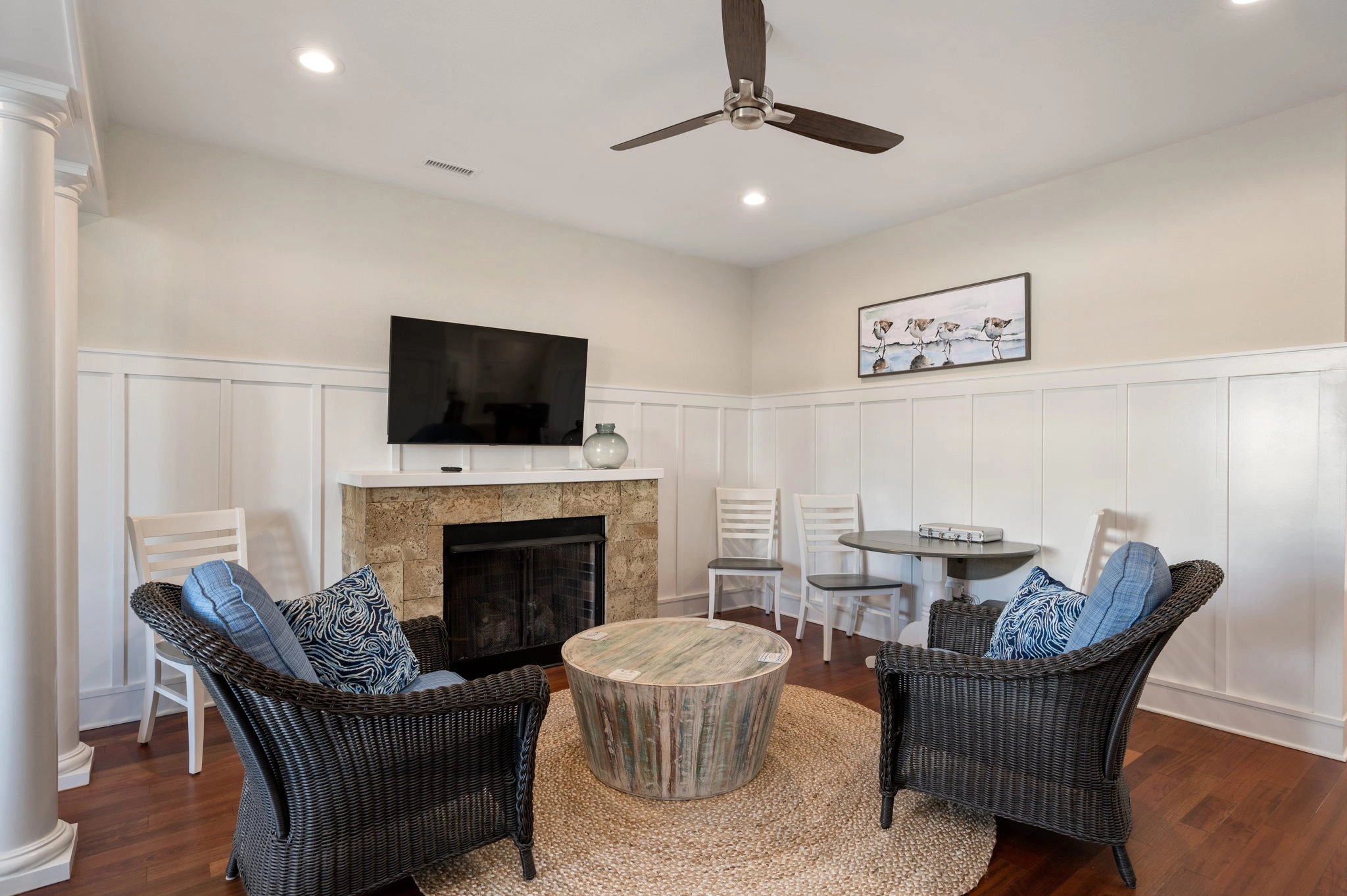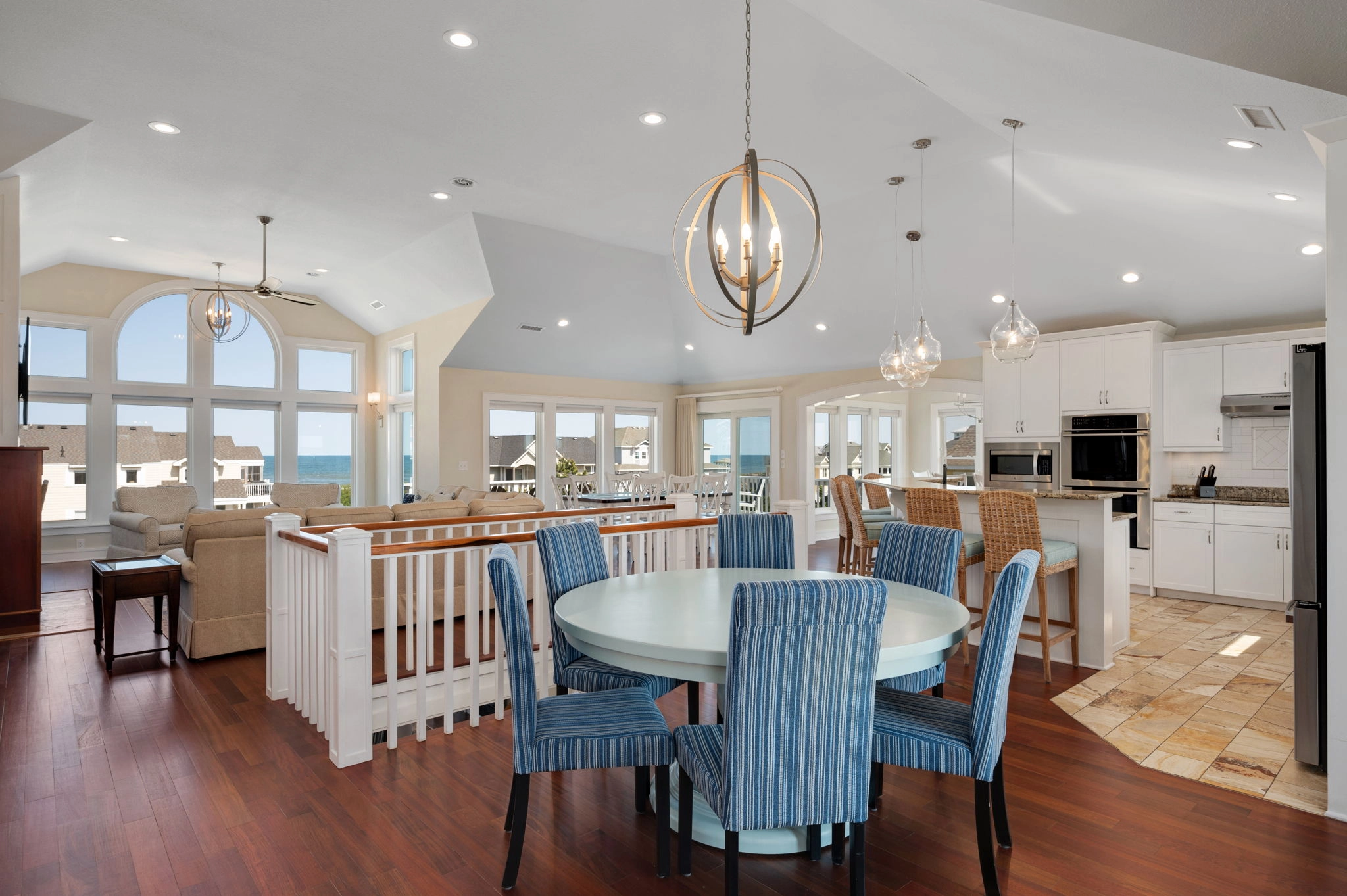 Great room with gas fireplace and shuffleboard; kitchen with two dishwashers, beverage refrigerator; dining area.