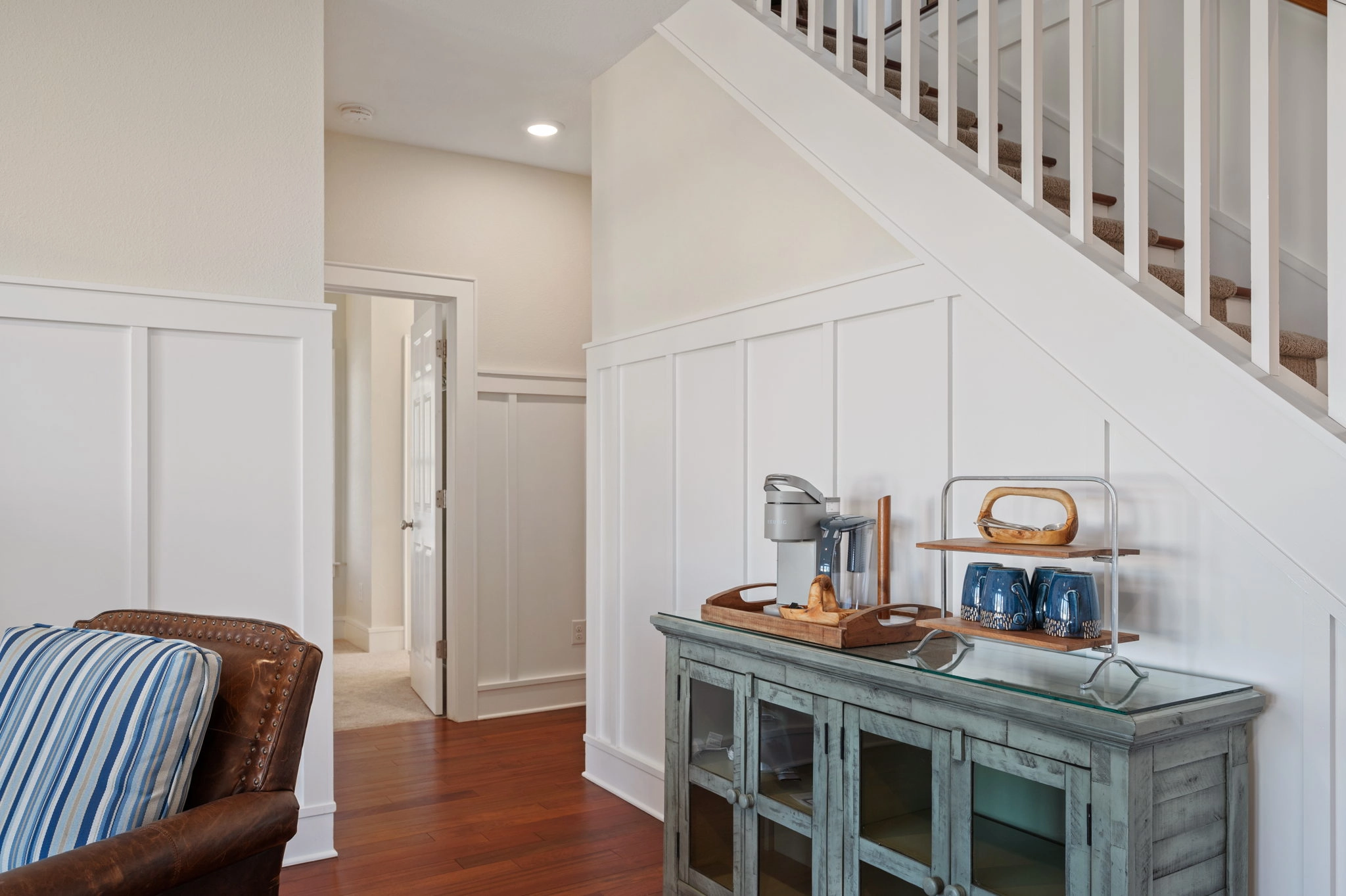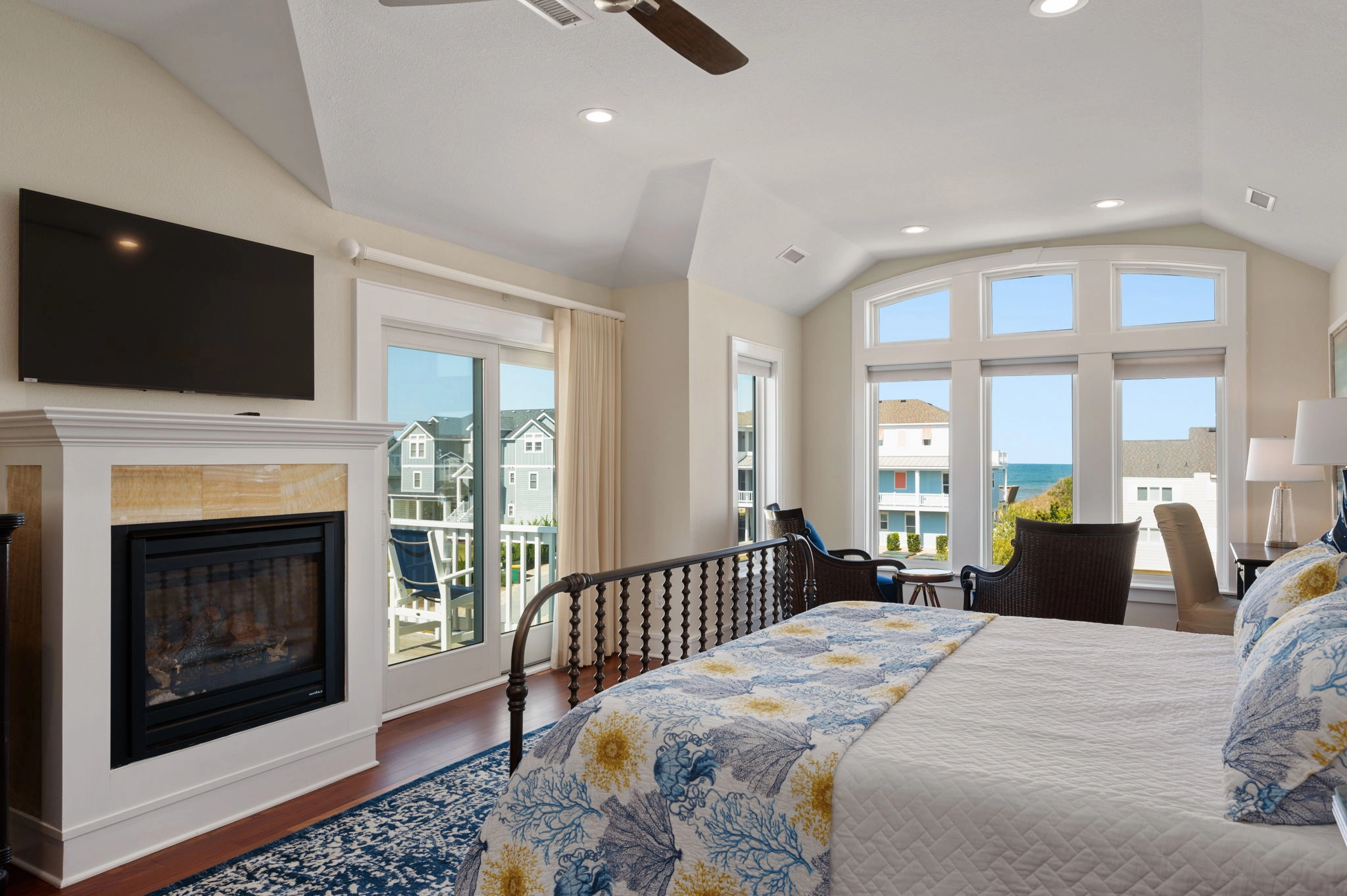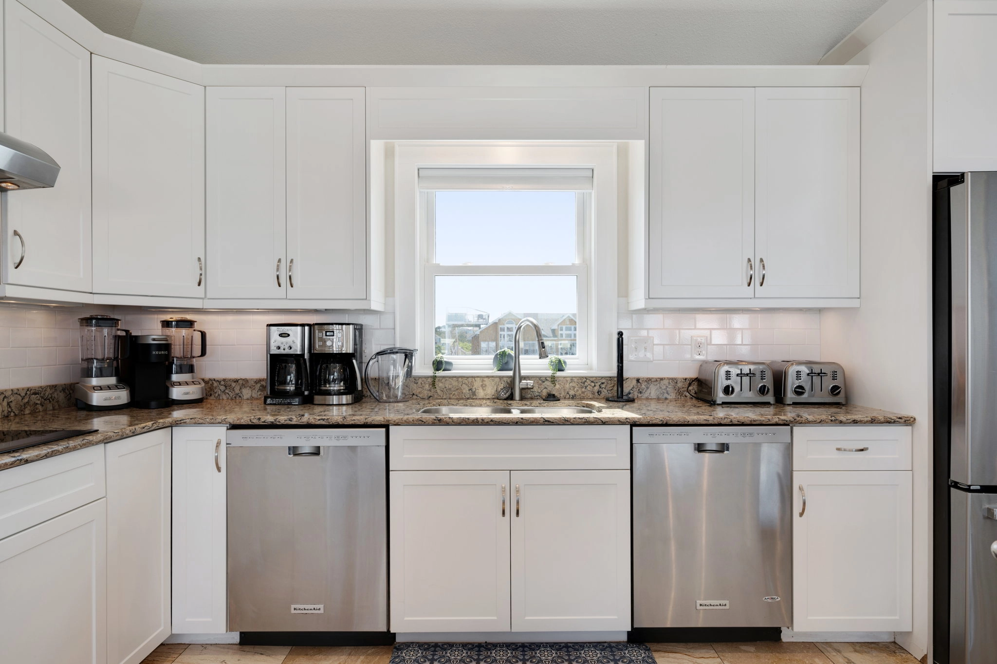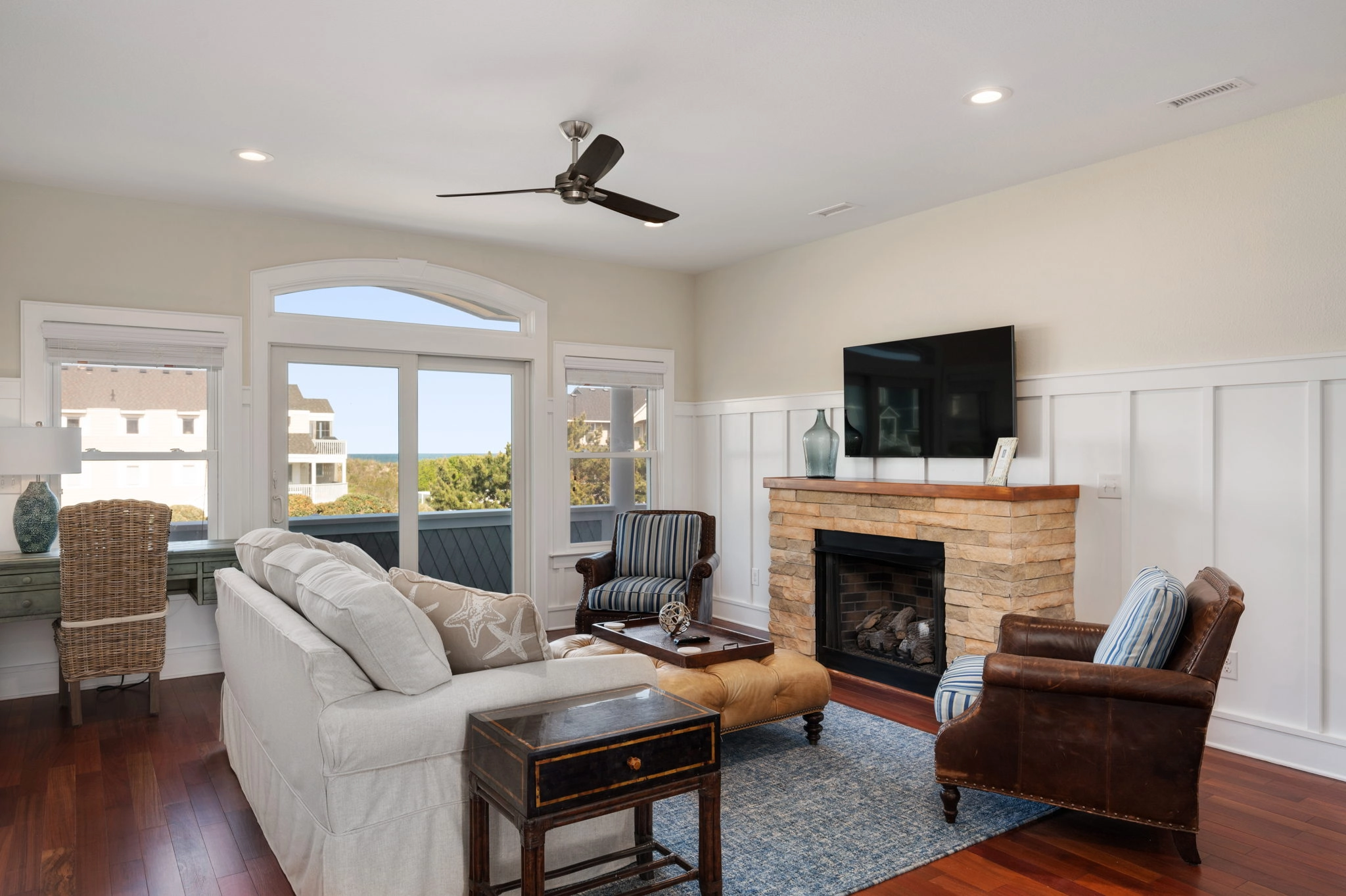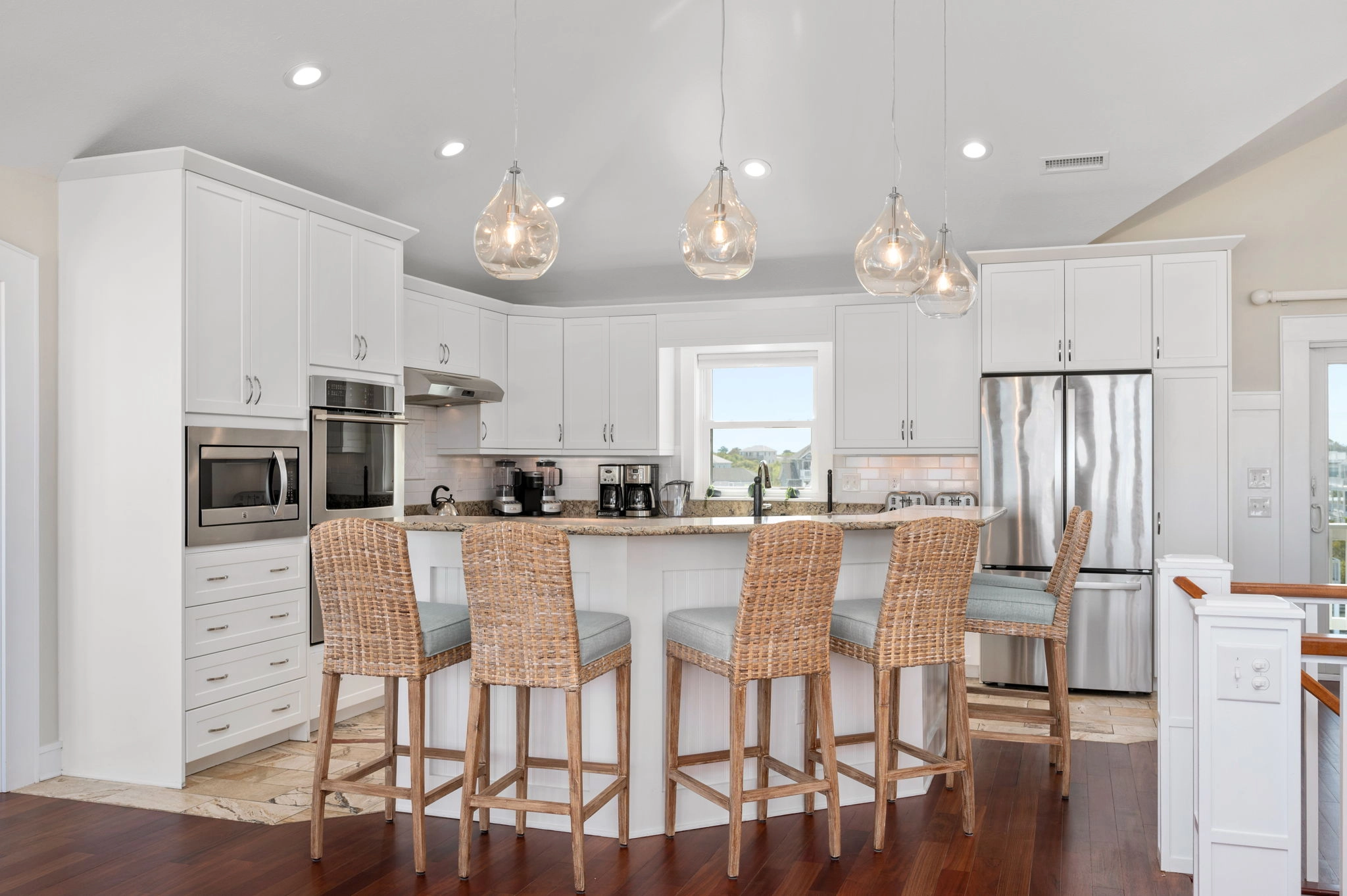 Great room with gas fireplace and shuffleboard; kitchen with two dishwashers, beverage refrigerator; dining area.