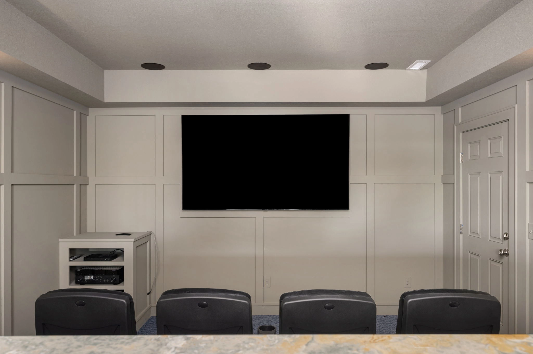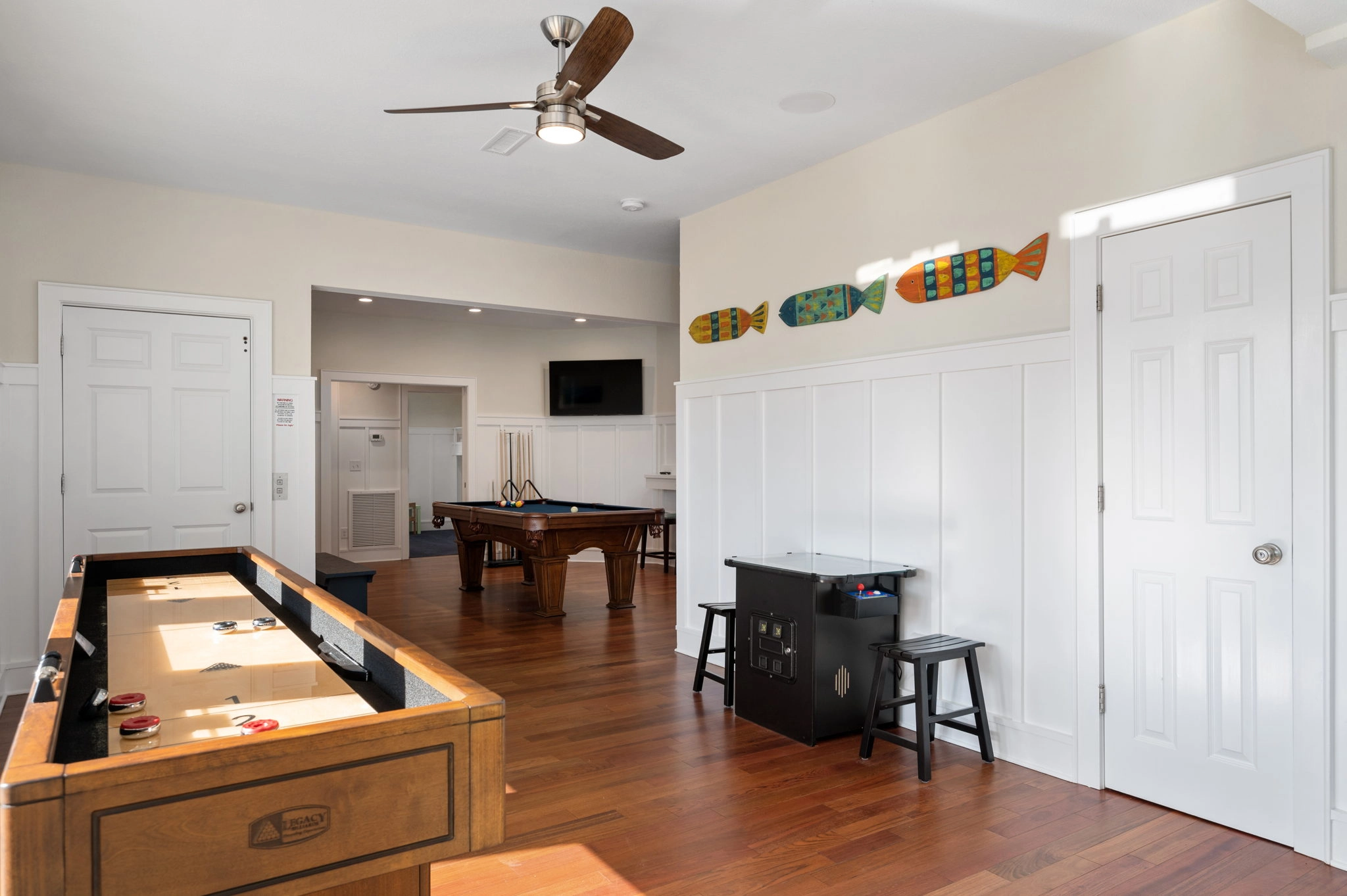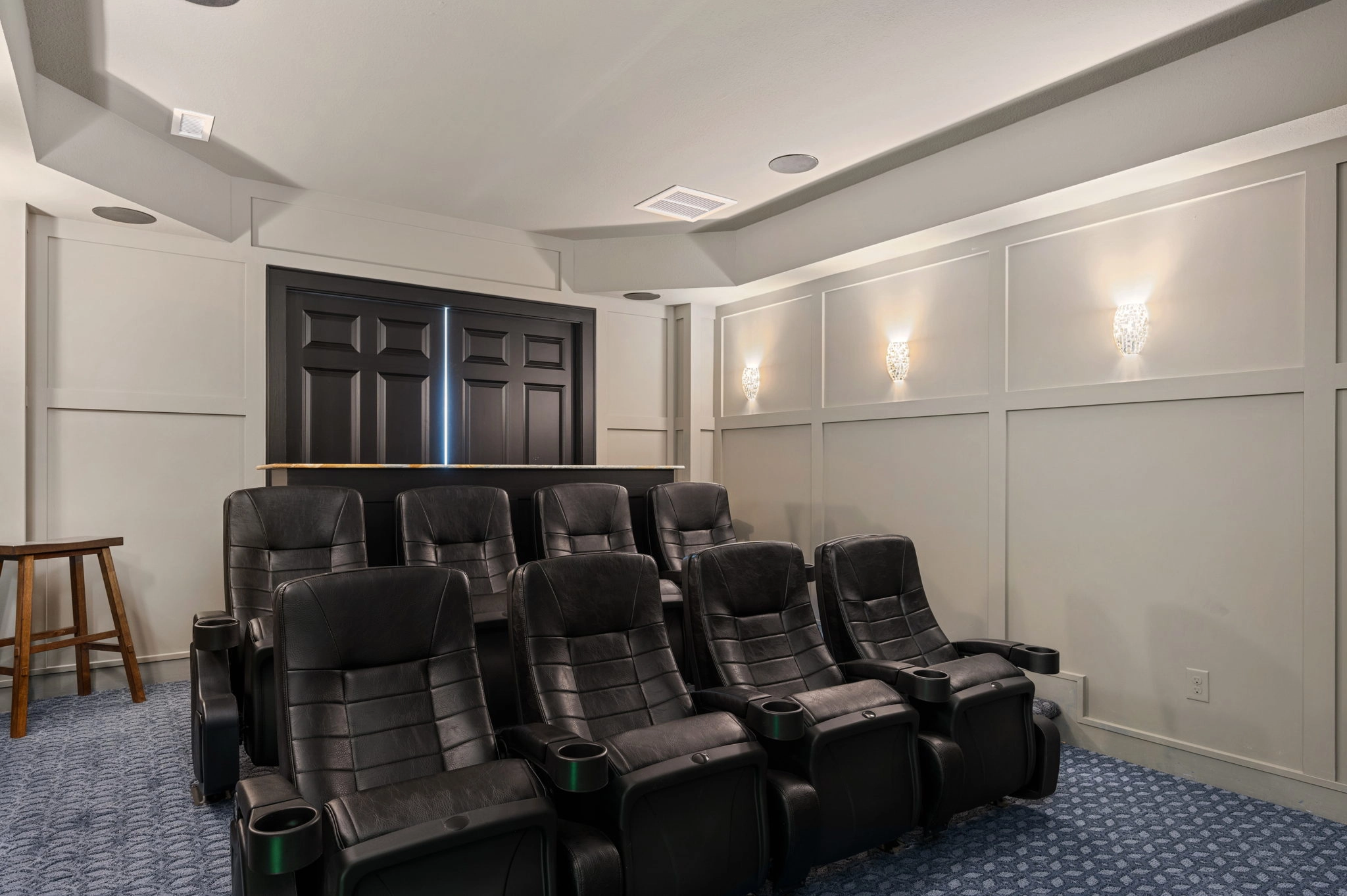 Theater room; rec room with pool table, arcade game, and shuffleboard; kitchenette with refrigerator, dishwasher, and beverage refrigerator; sitting area with gas fireplace; laundry.