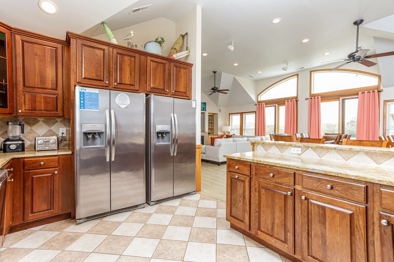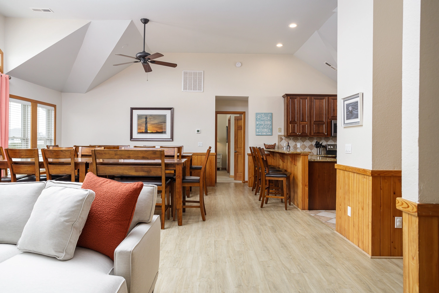 Great room; kitchen with two refrigerators and two dishwashers; dining area.