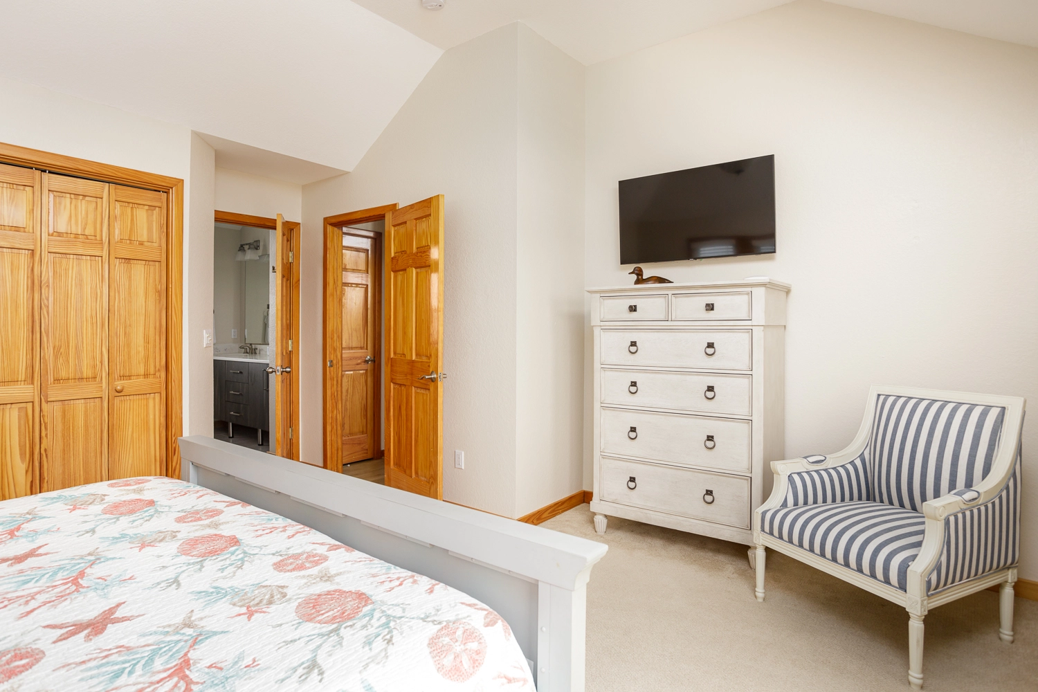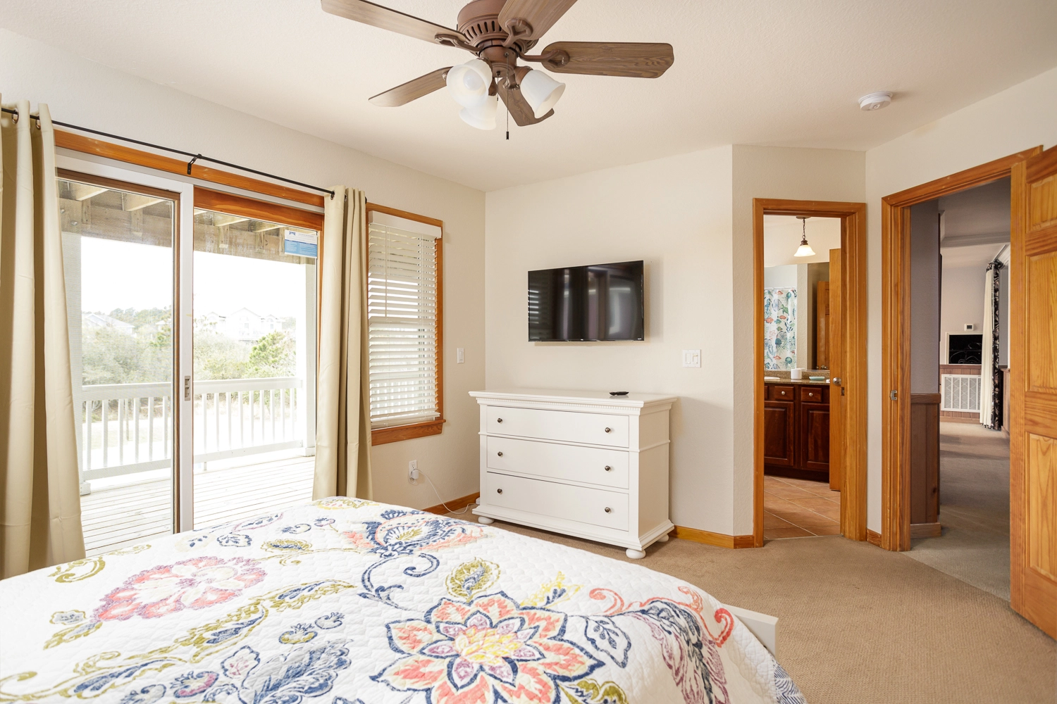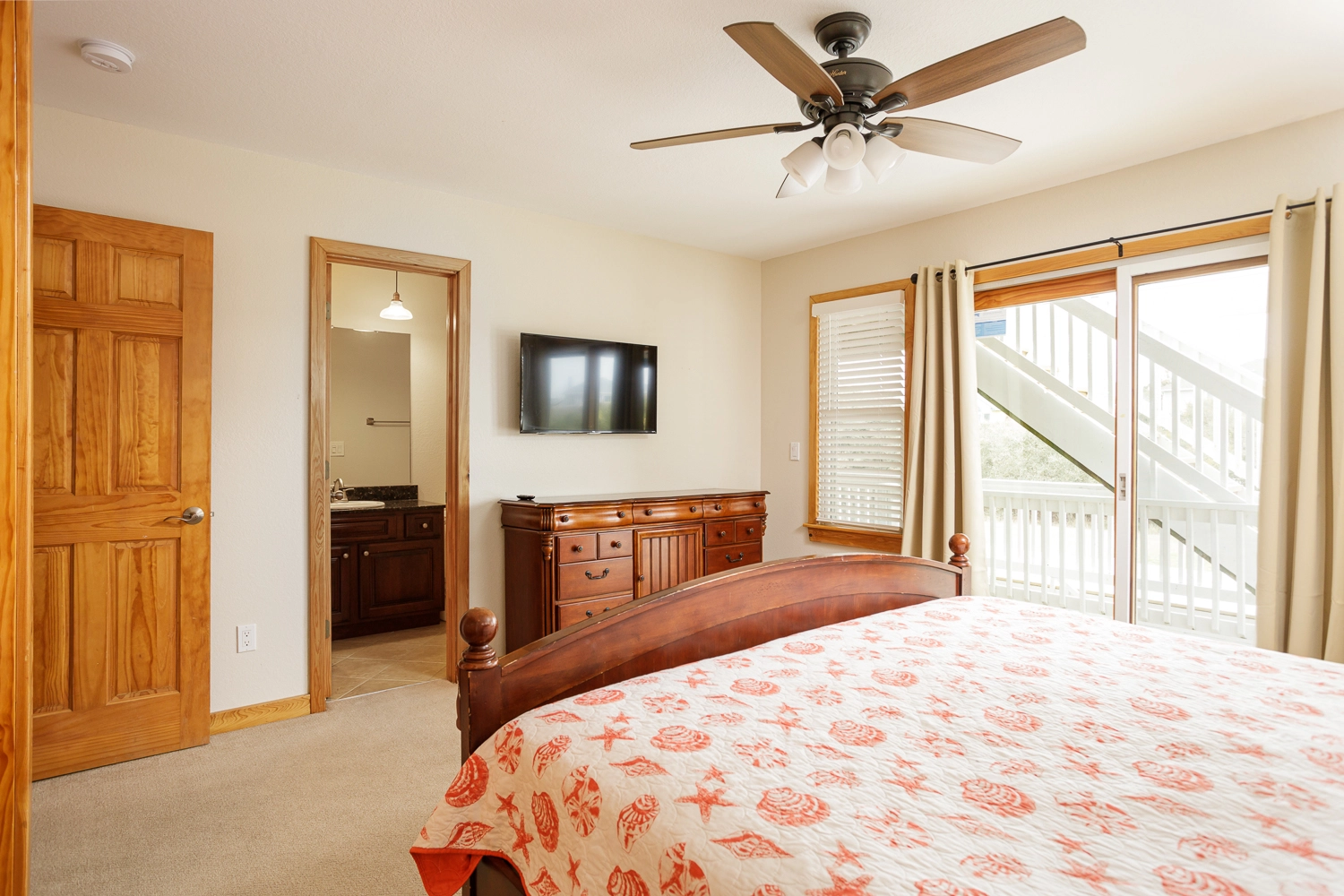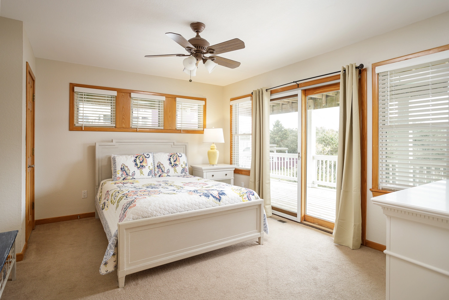 Queen, Semi-private bath, Shower/tub combo, Deck access