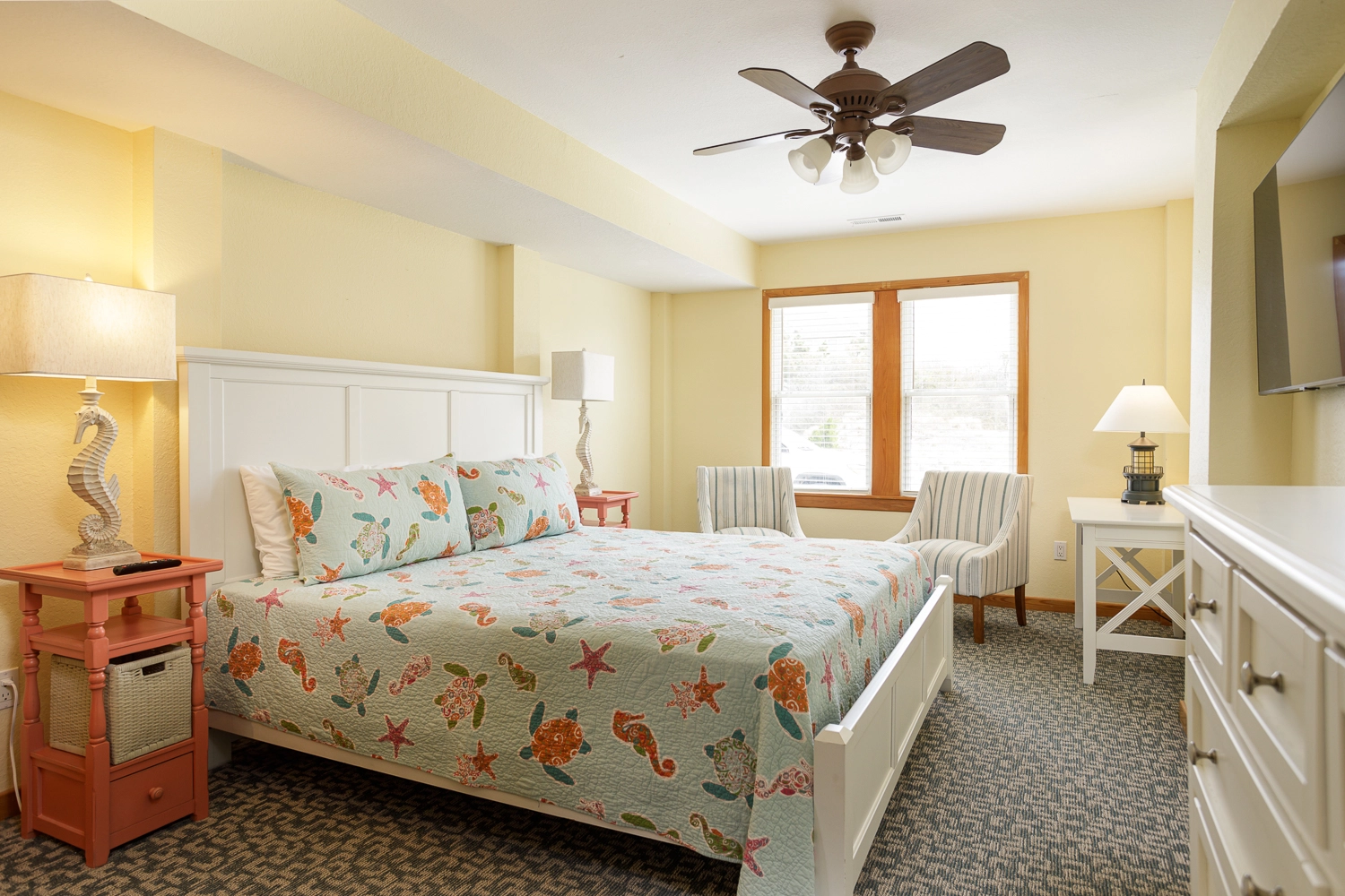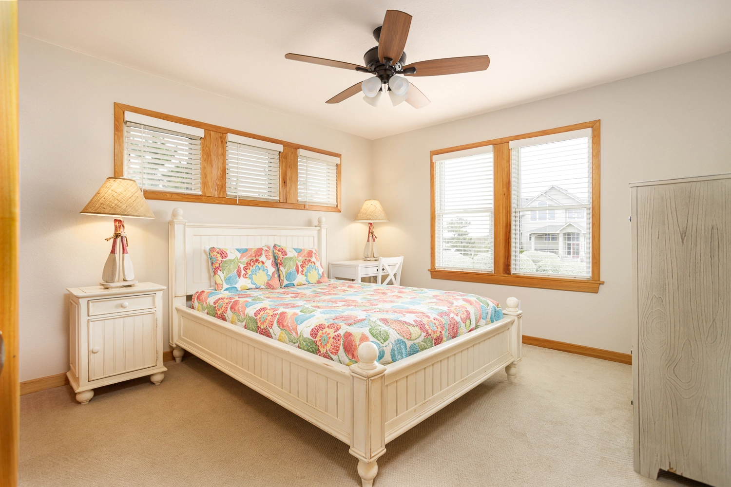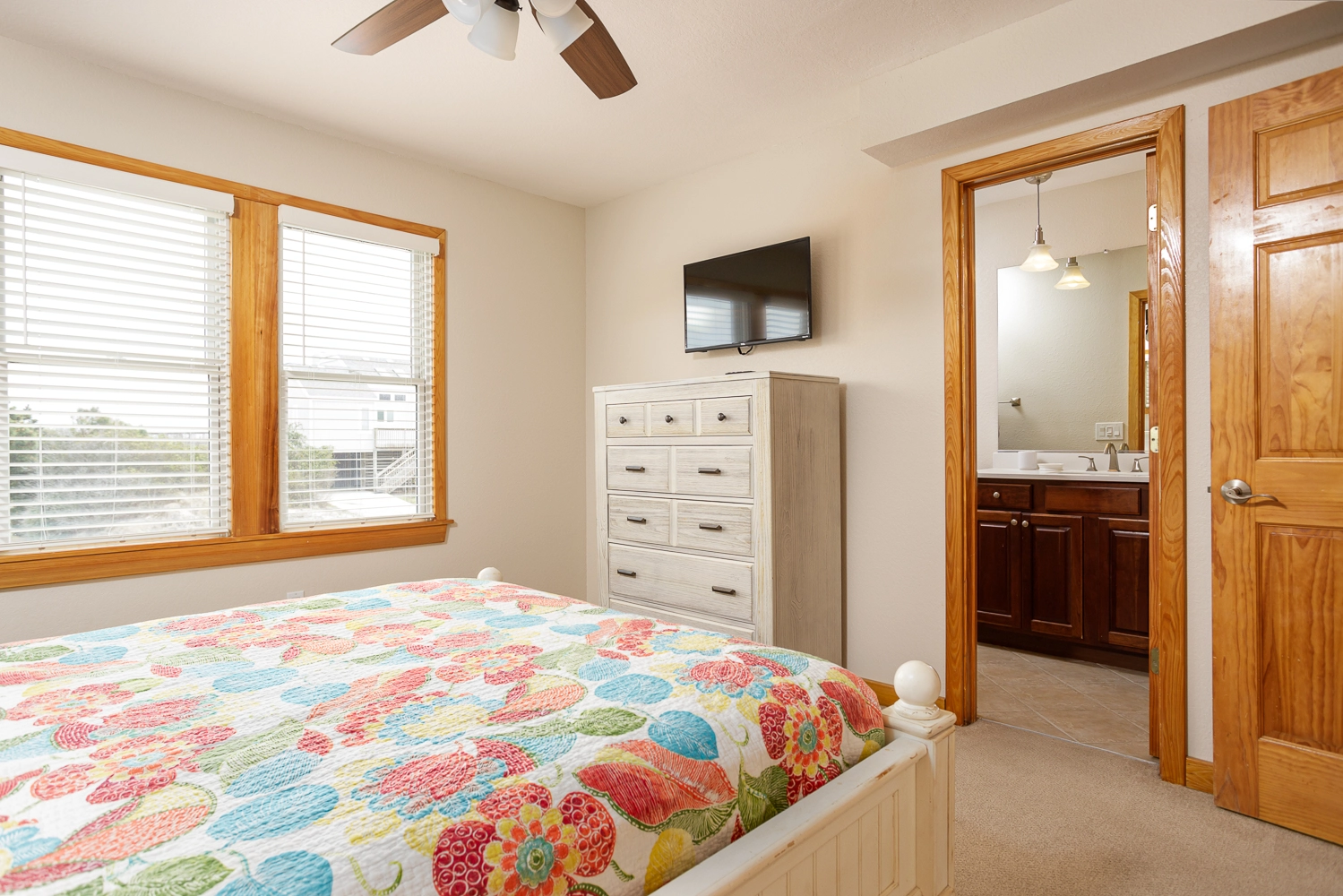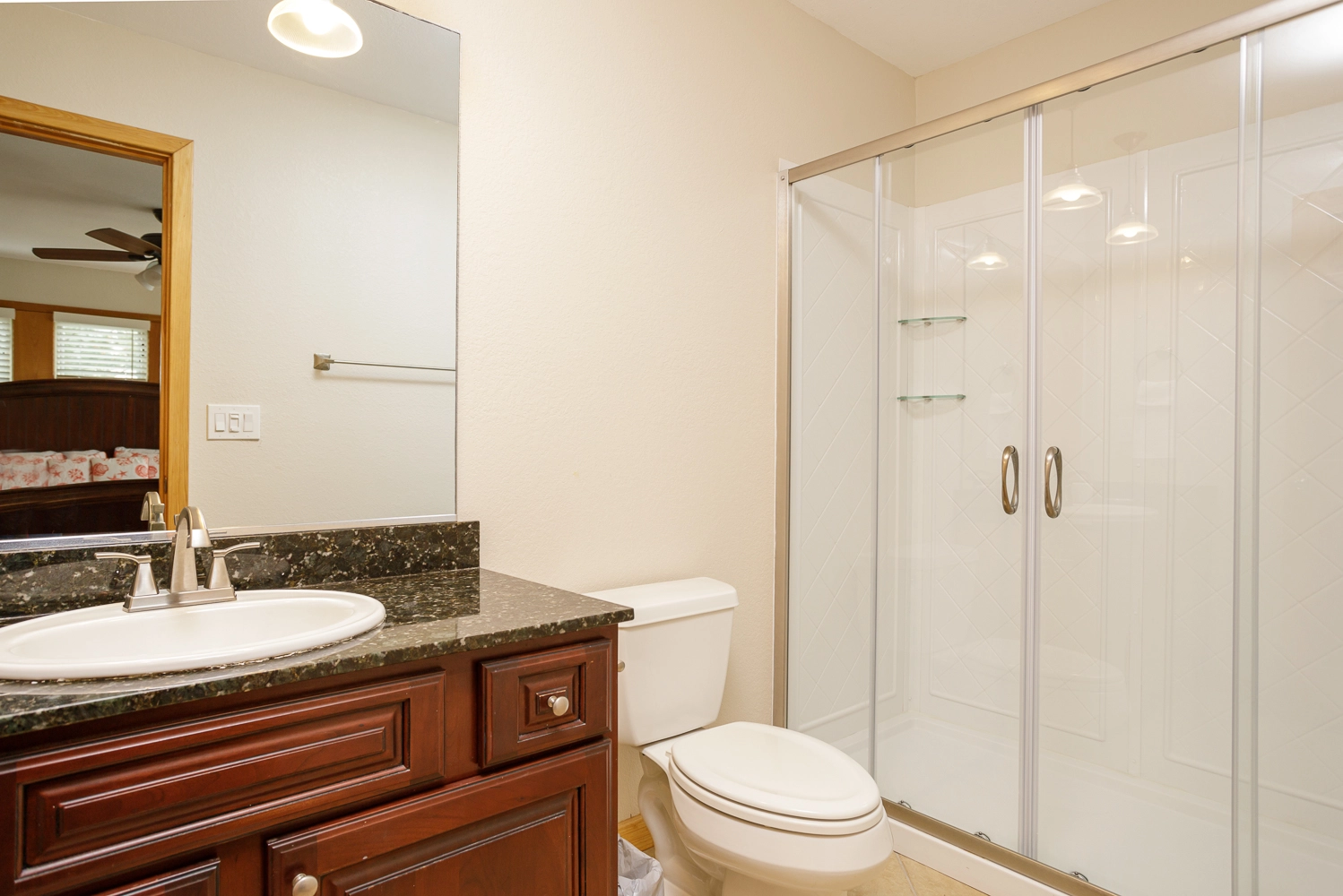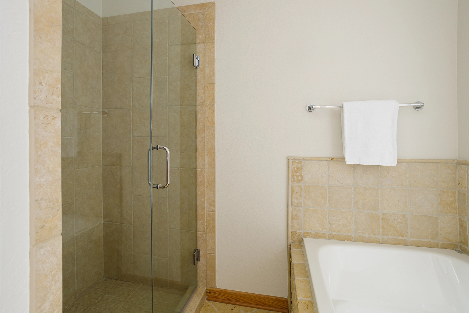 Queen, Semi-private bath, Shower/tub combo, Deck access