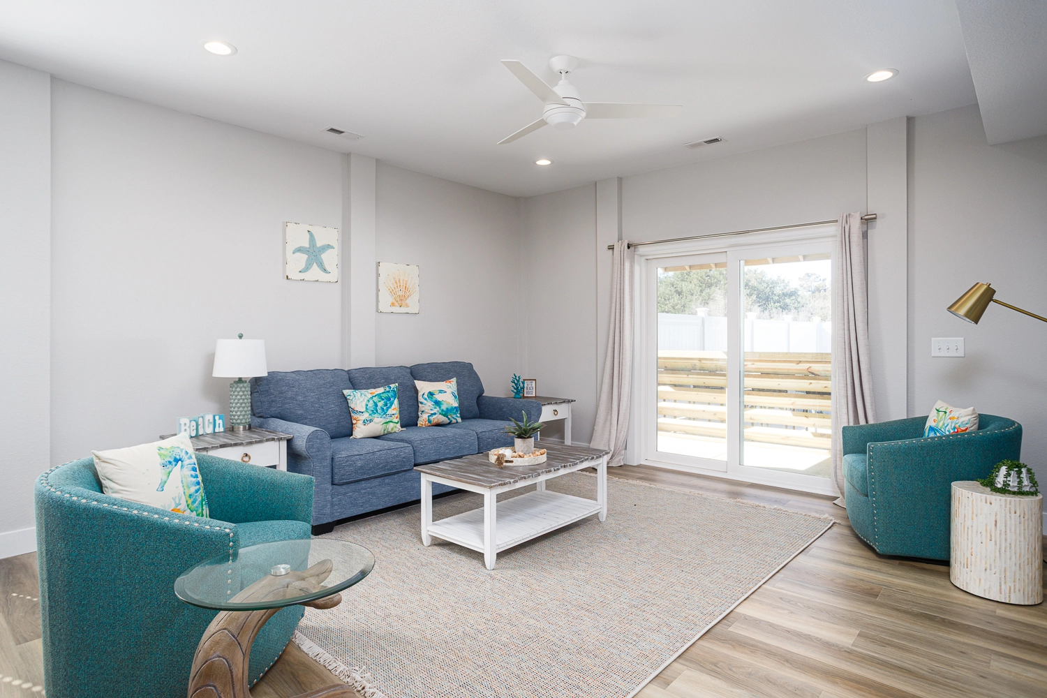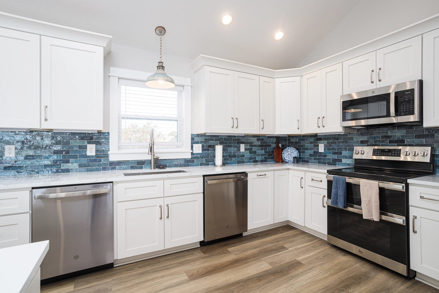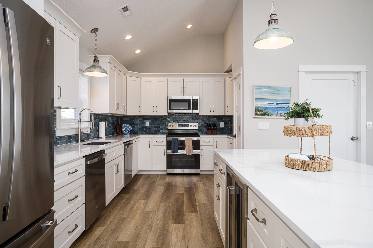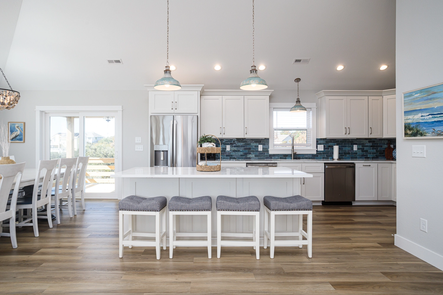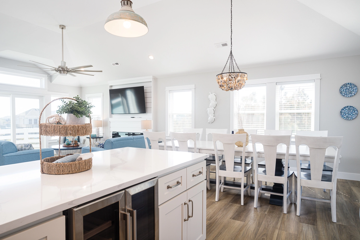 Great room with electric fireplace; kitchen with two dishwashers and wine cooler; dining area.