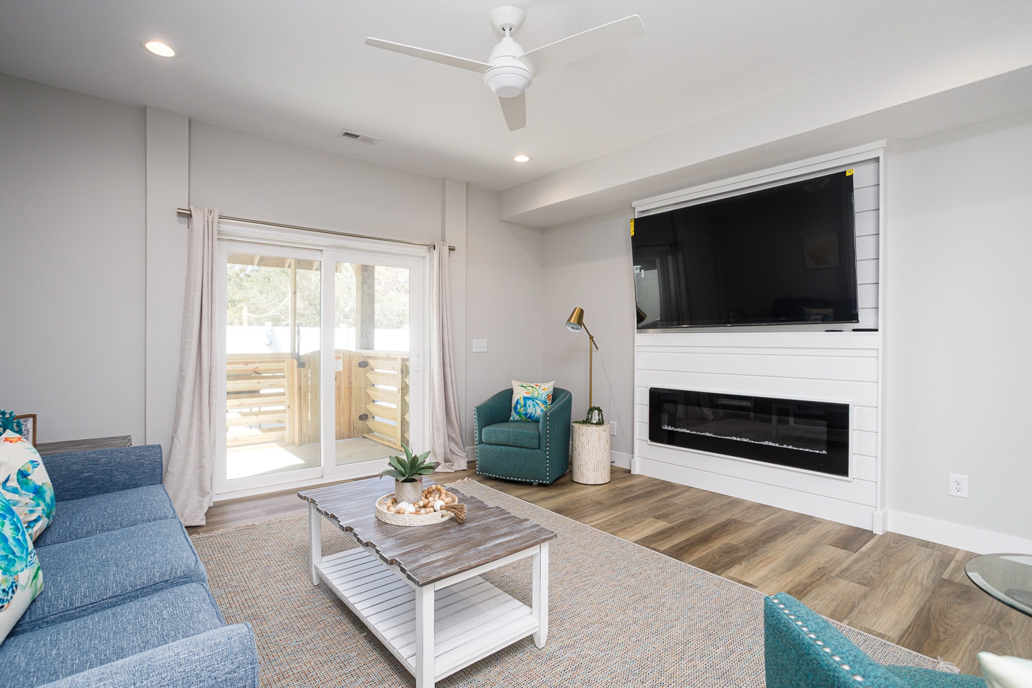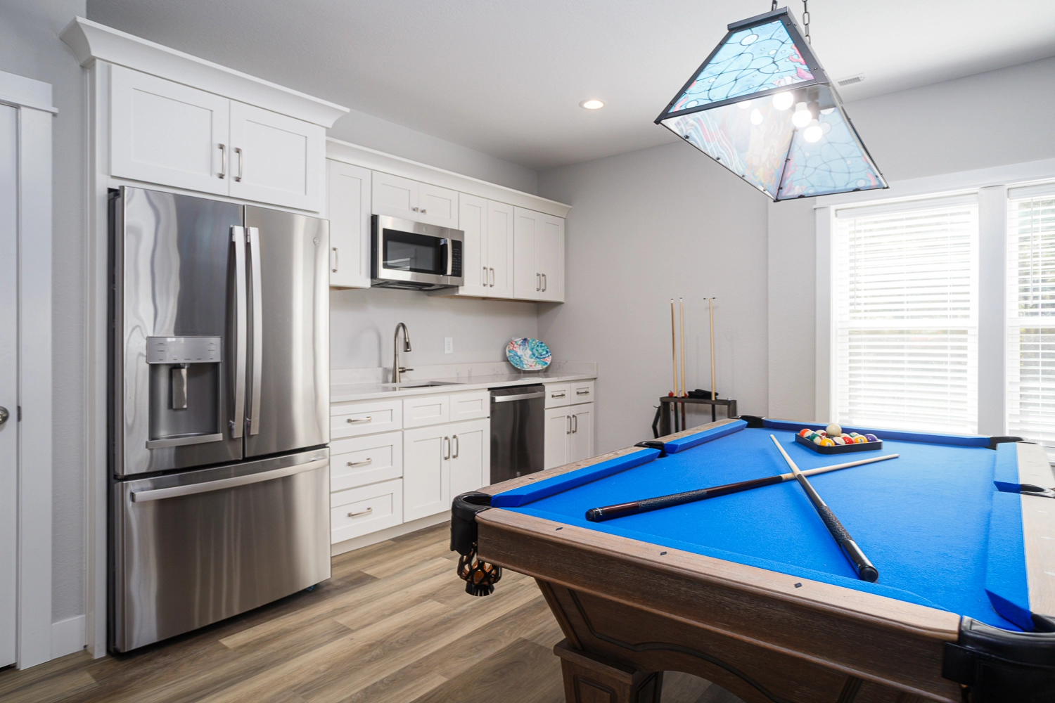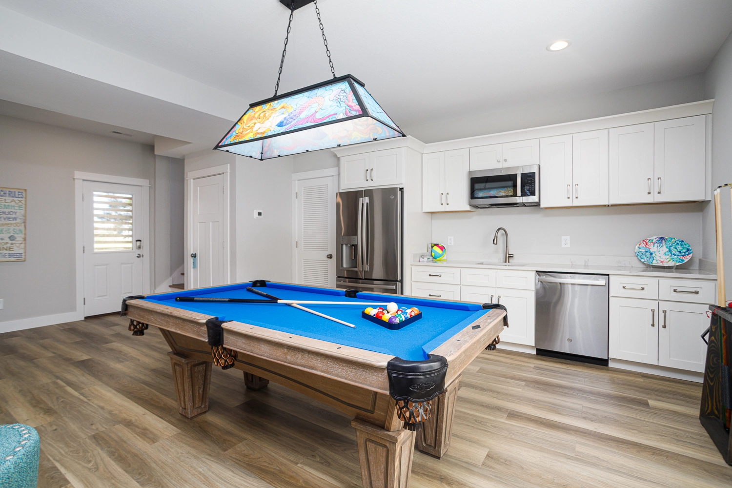 Rec room with pool table, and kitchenette with refrigerator and dishwasher; sitting area with electric fireplace; laundry.