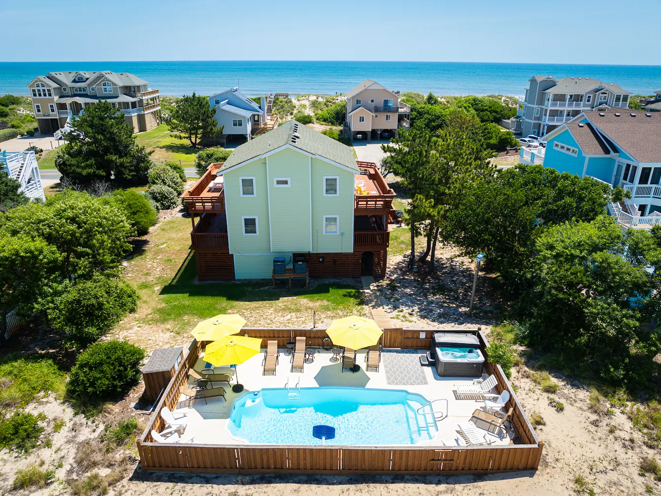 "Things we loved about this home: fully stocked kitchen, extensive decks with swings and seating options, pool & hot tub area, proximity to the beach."
