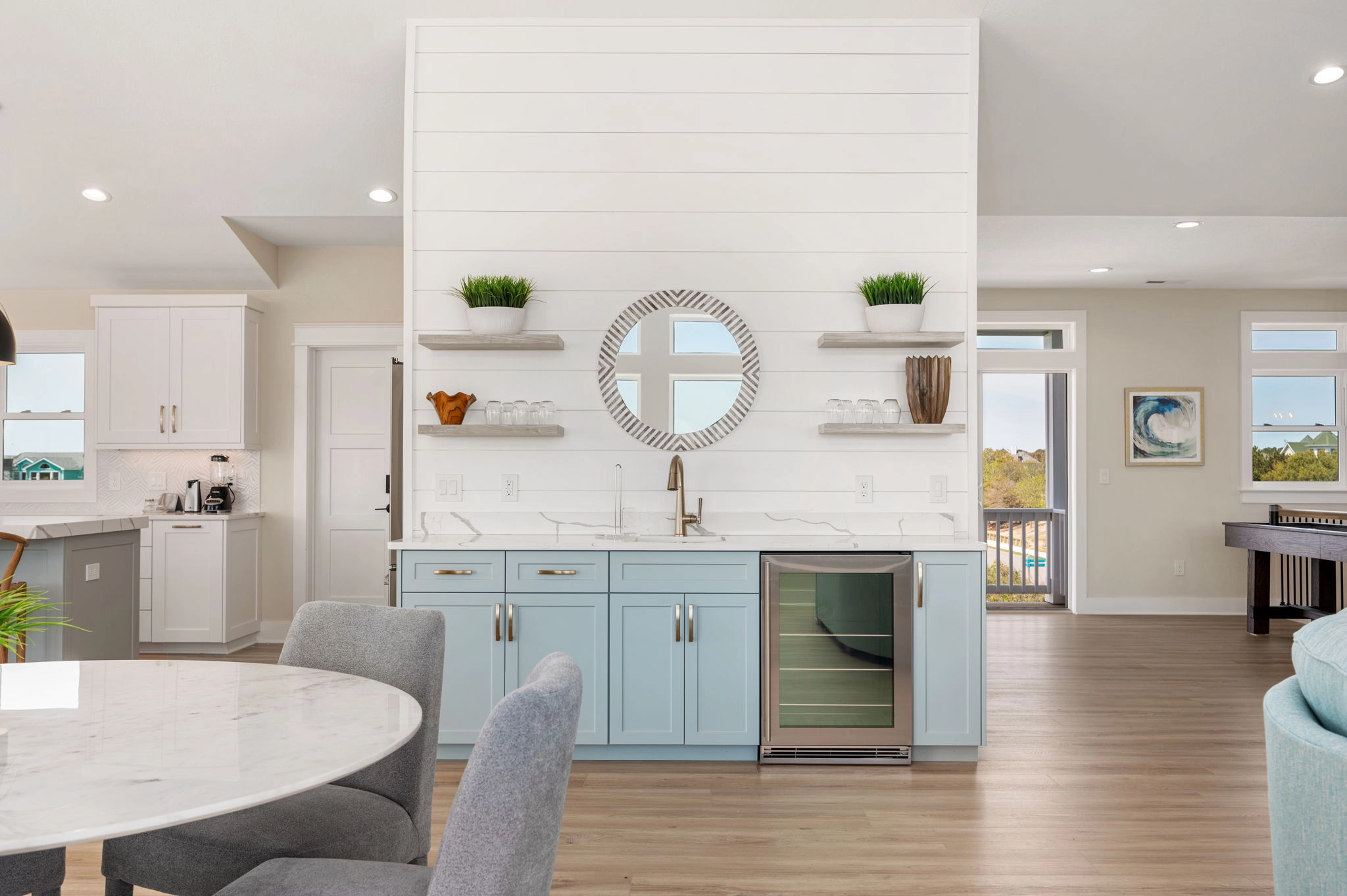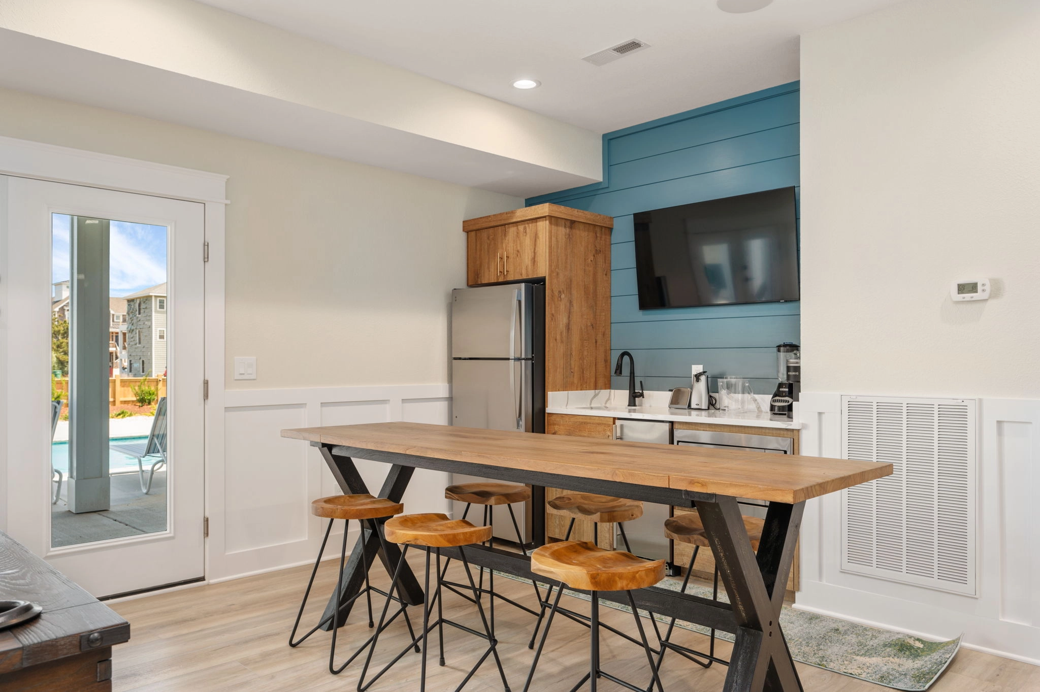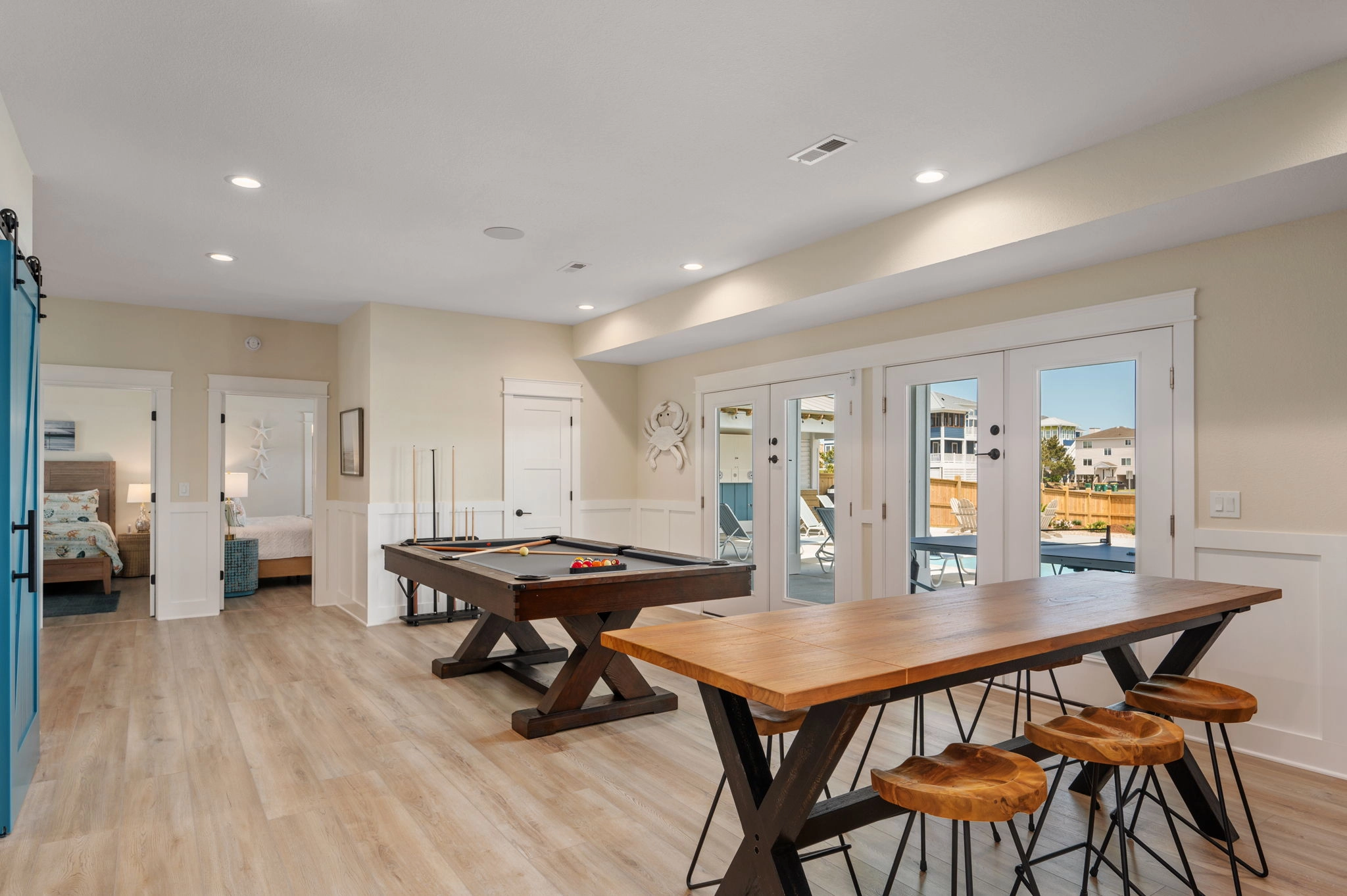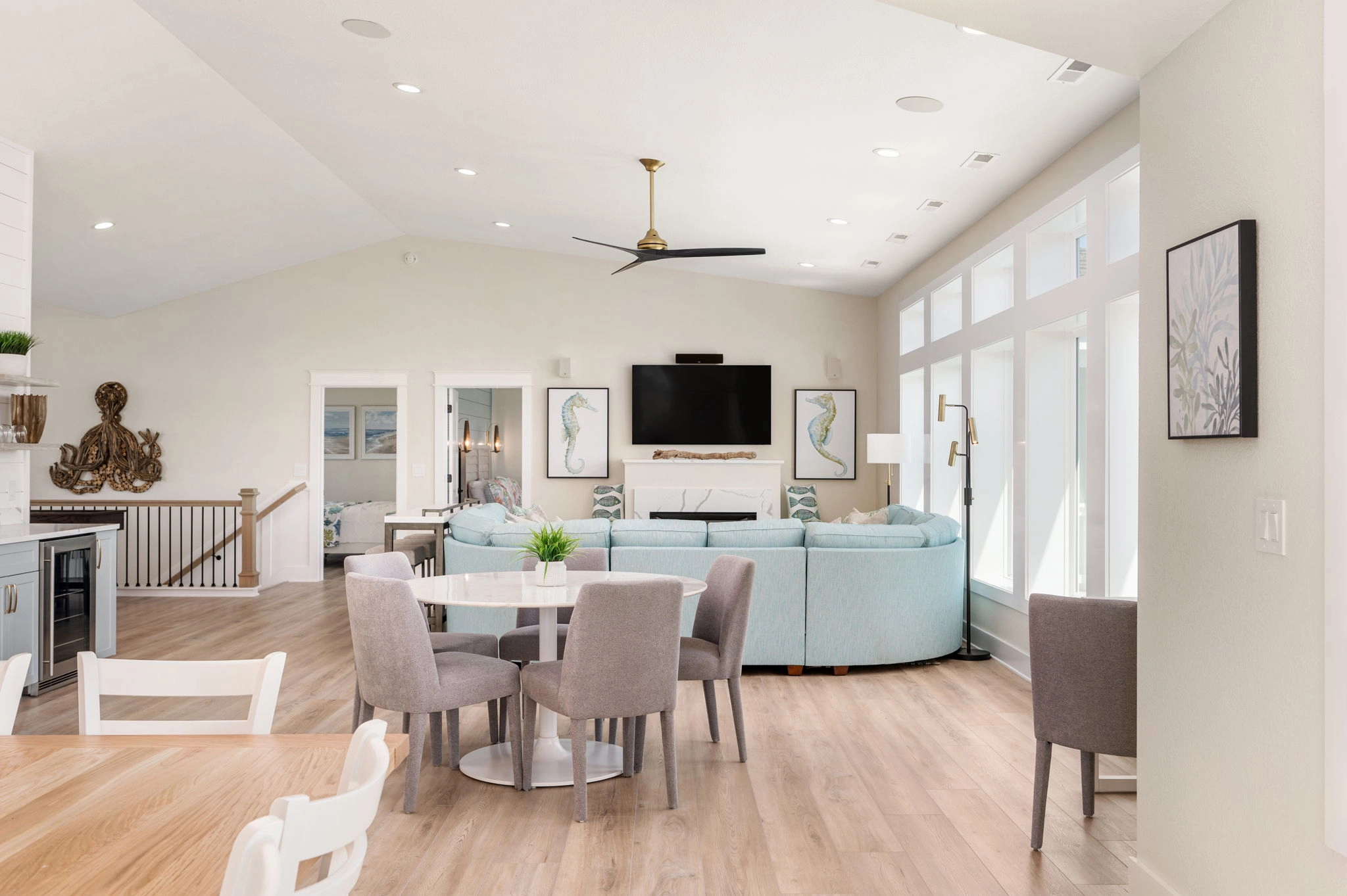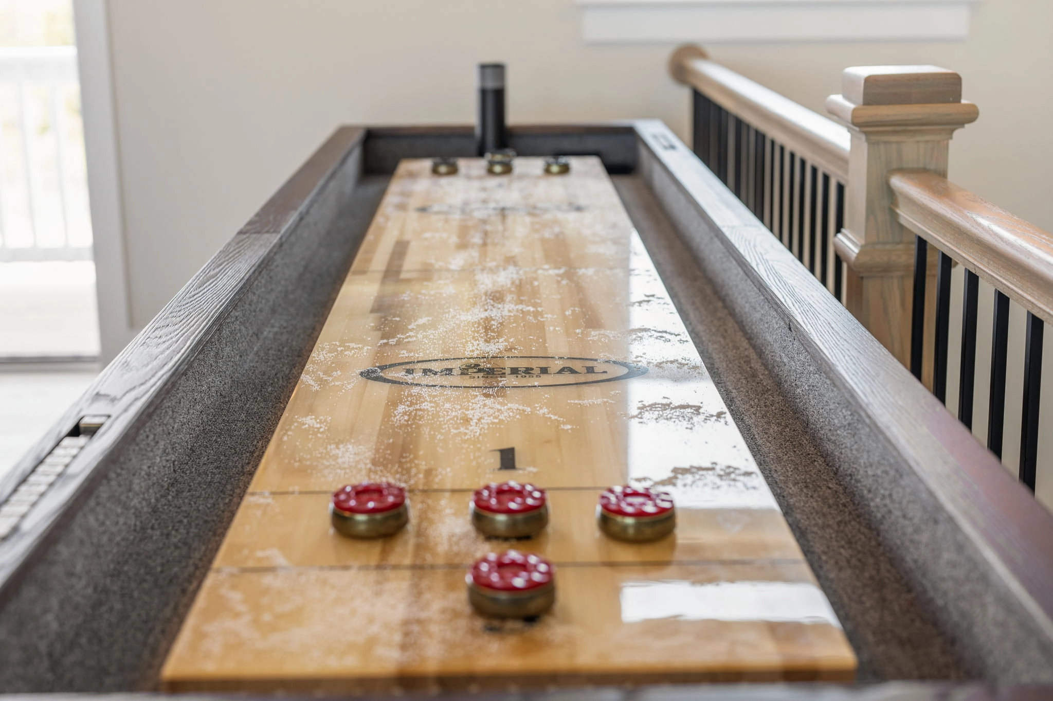 Great room with gas fireplace and shuffleboard; kitchen with gas stove, two refrigerators, and two dishwashers; dining area; wet bar with beverage refrigerator.