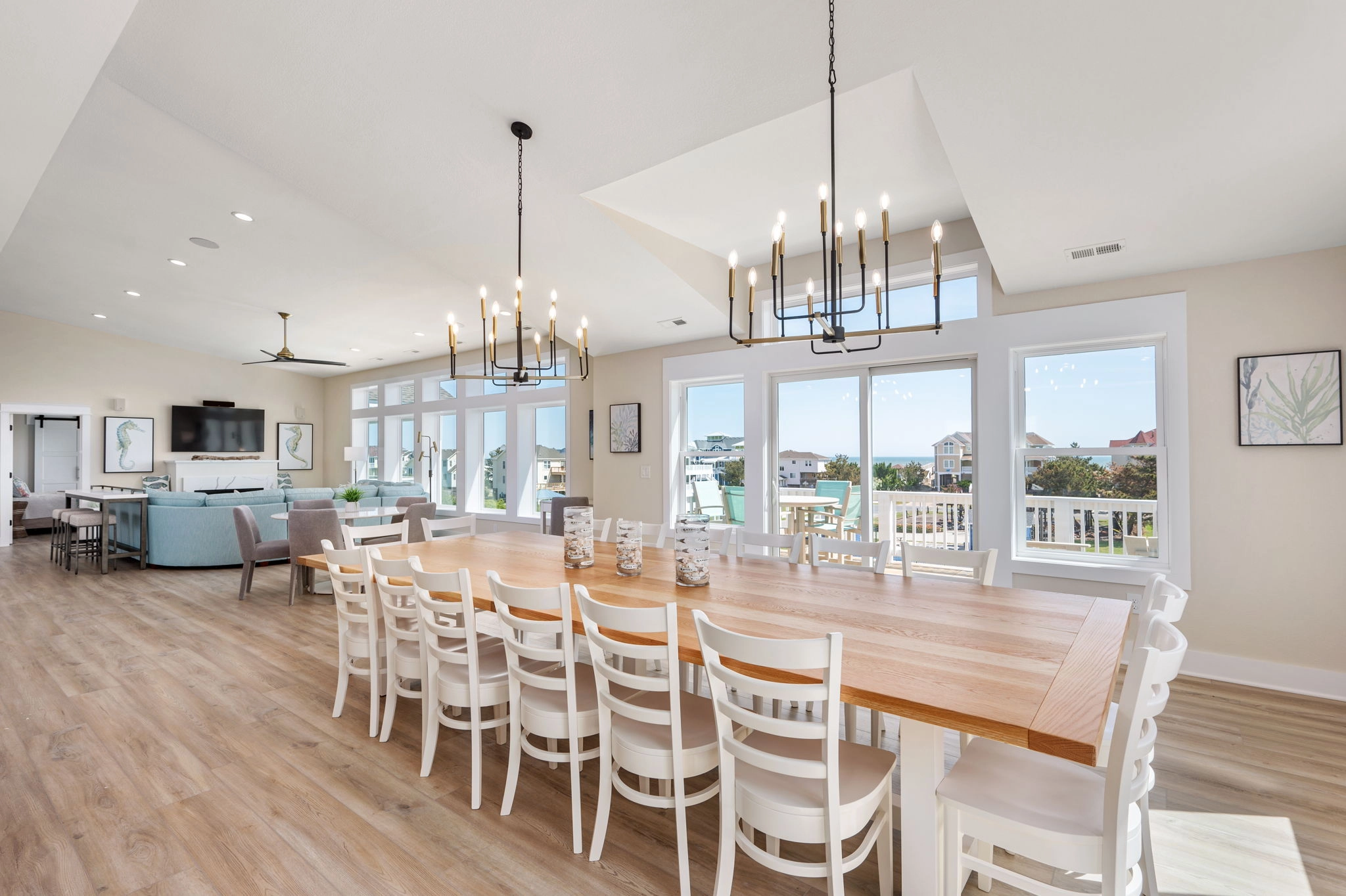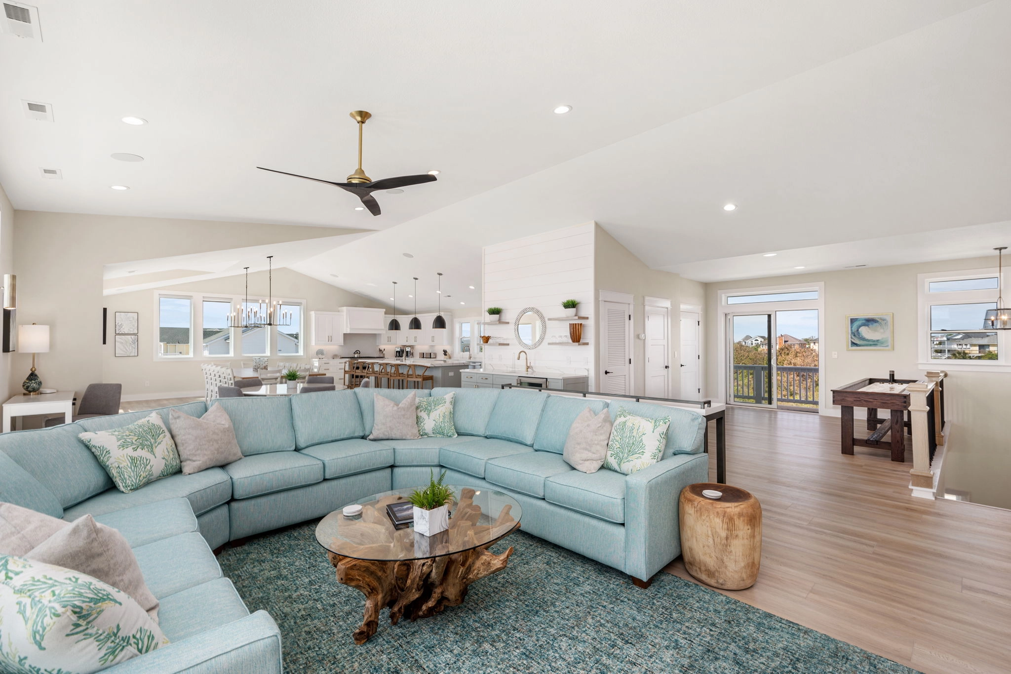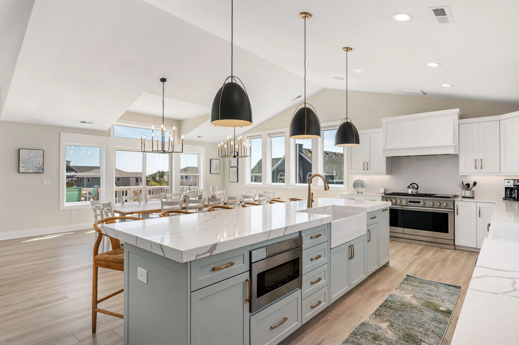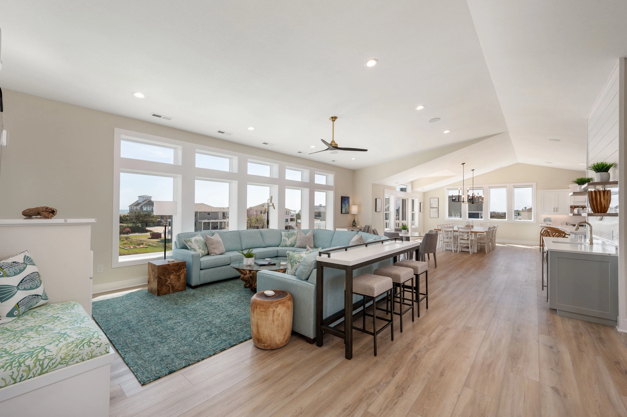 Great room with gas fireplace and shuffleboard; kitchen with gas stove, two refrigerators, and two dishwashers; dining area; wet bar with beverage refrigerator.