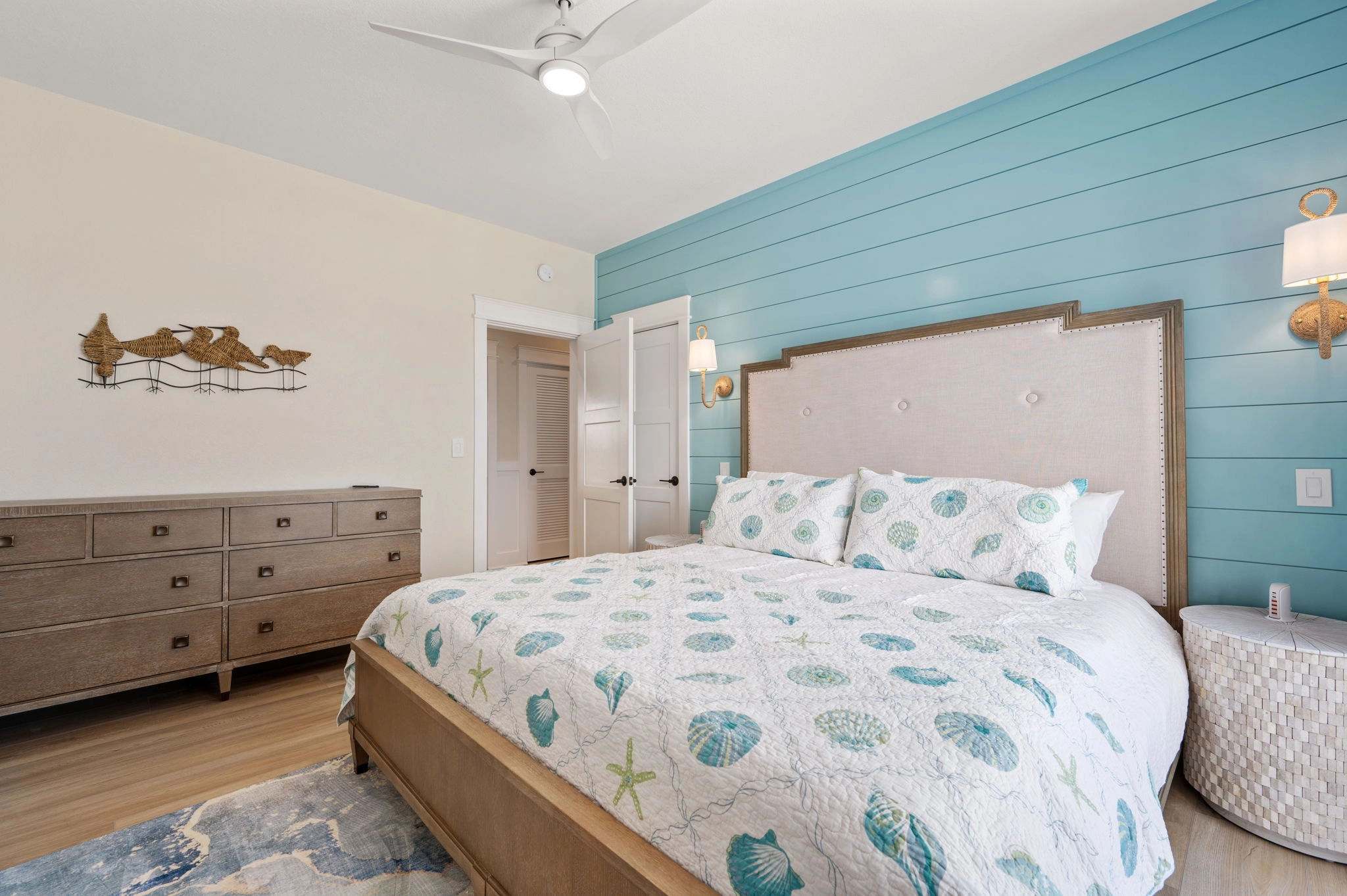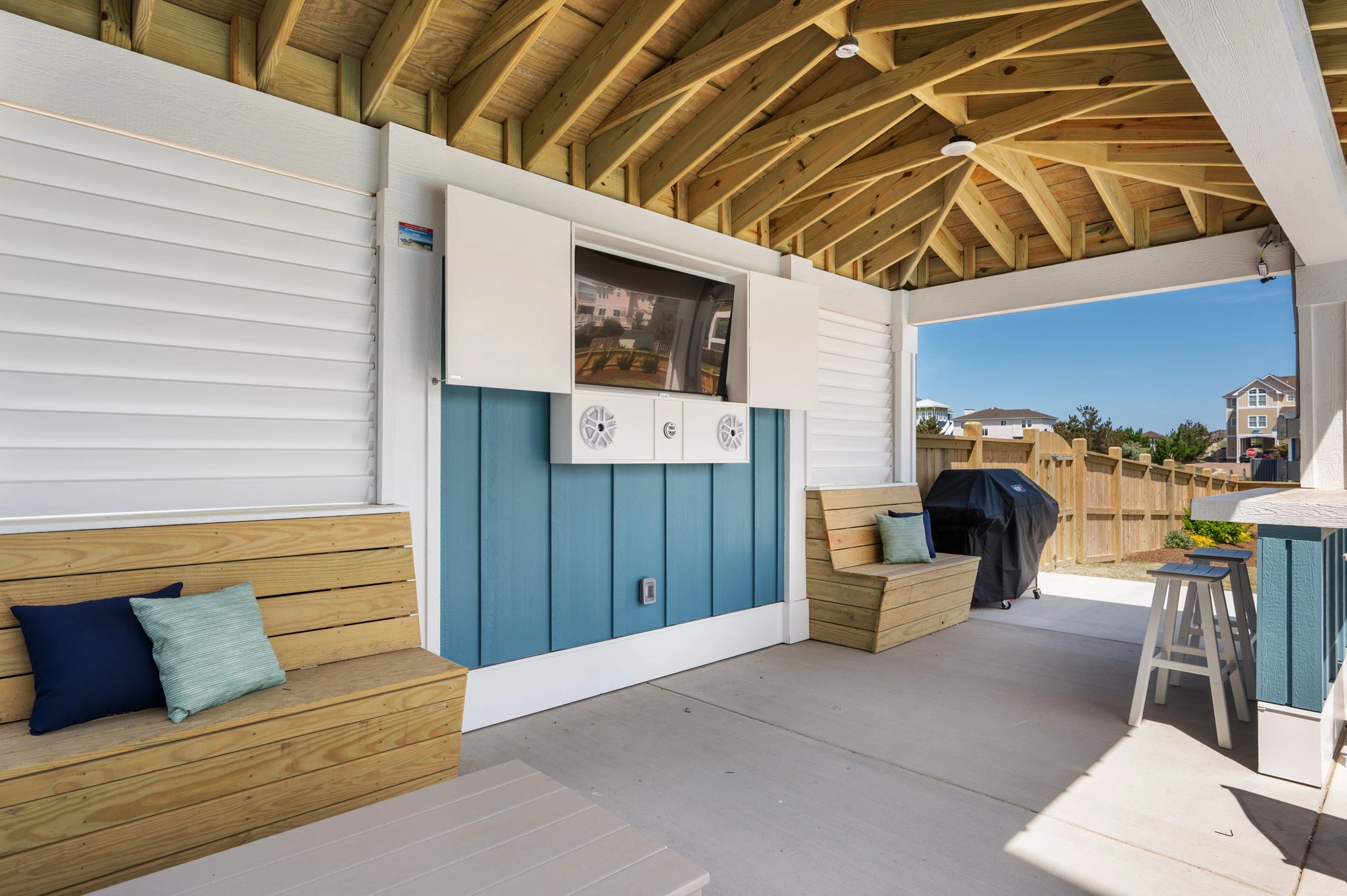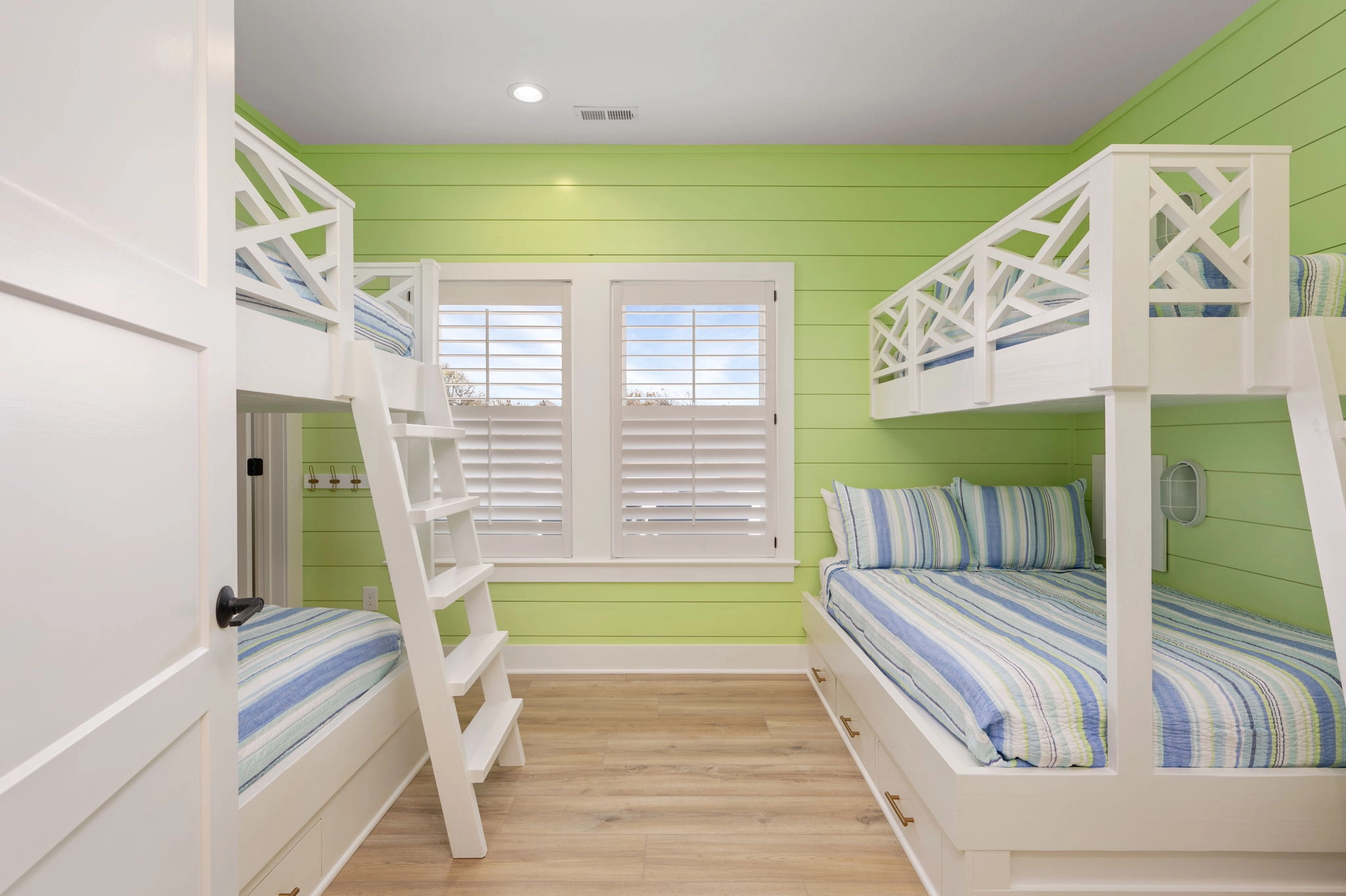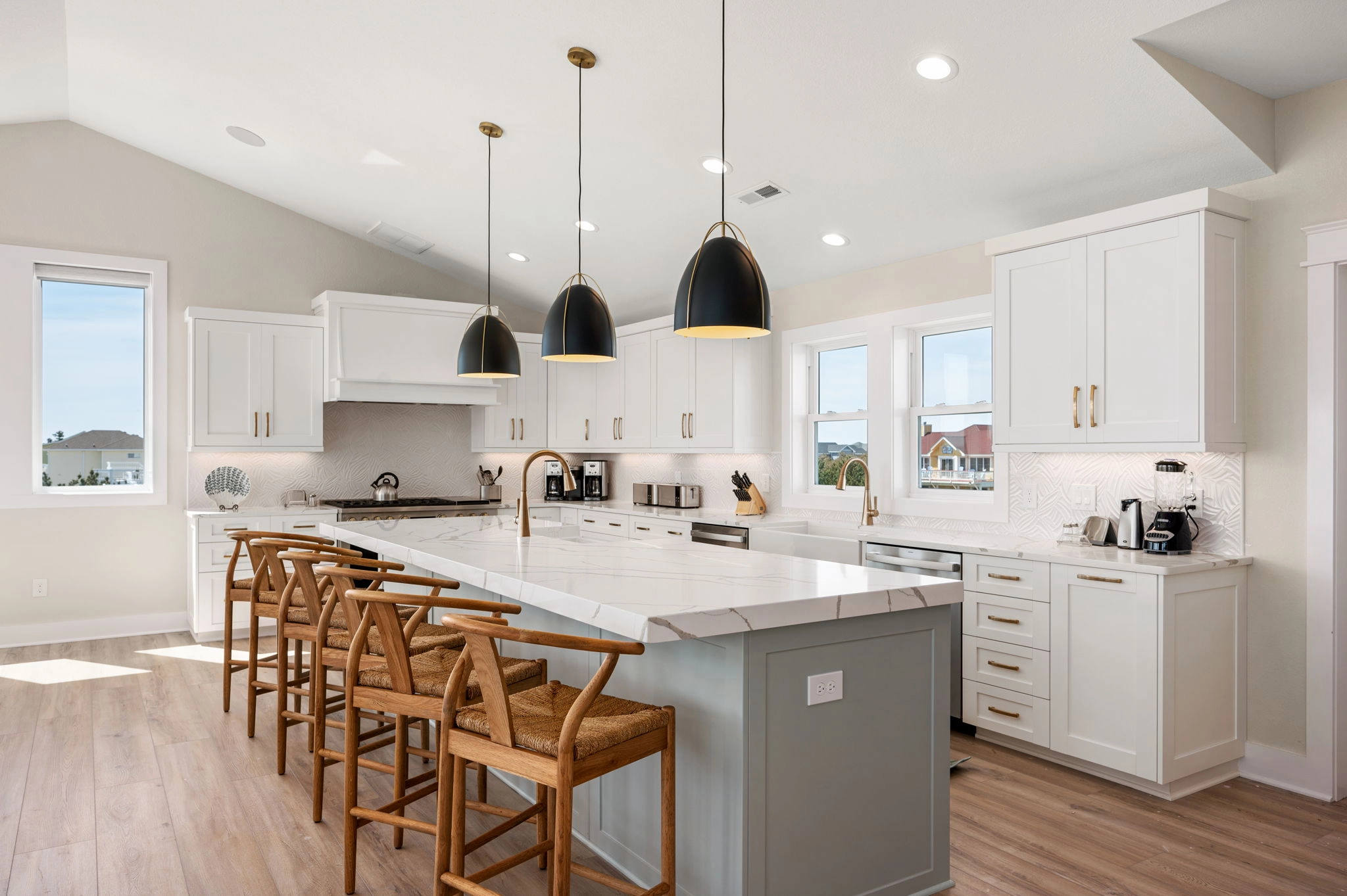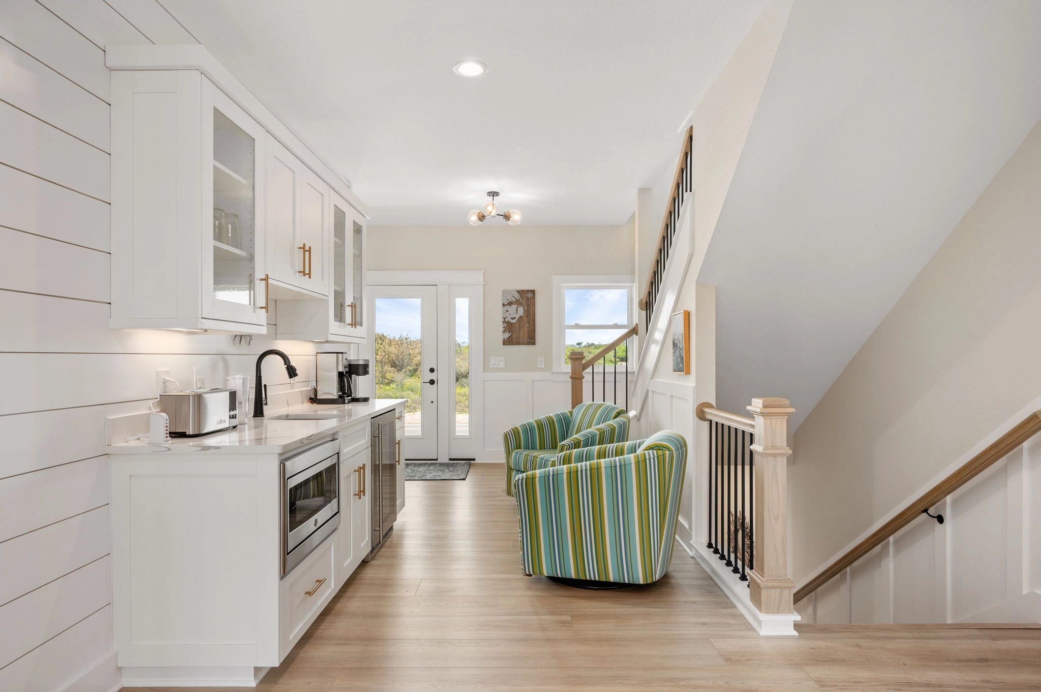 Great room with gas fireplace and shuffleboard; kitchen with gas stove, two refrigerators, and two dishwashers; dining area; wet bar with beverage refrigerator.