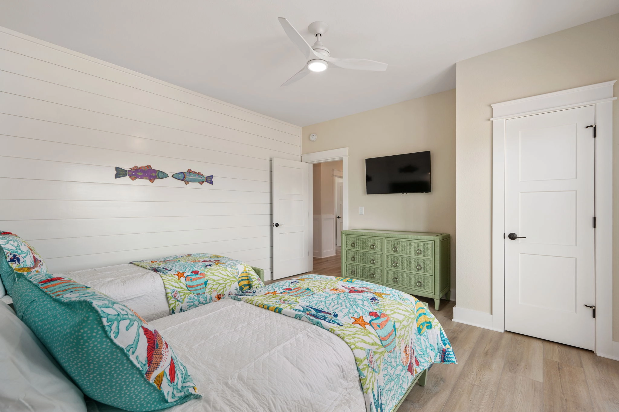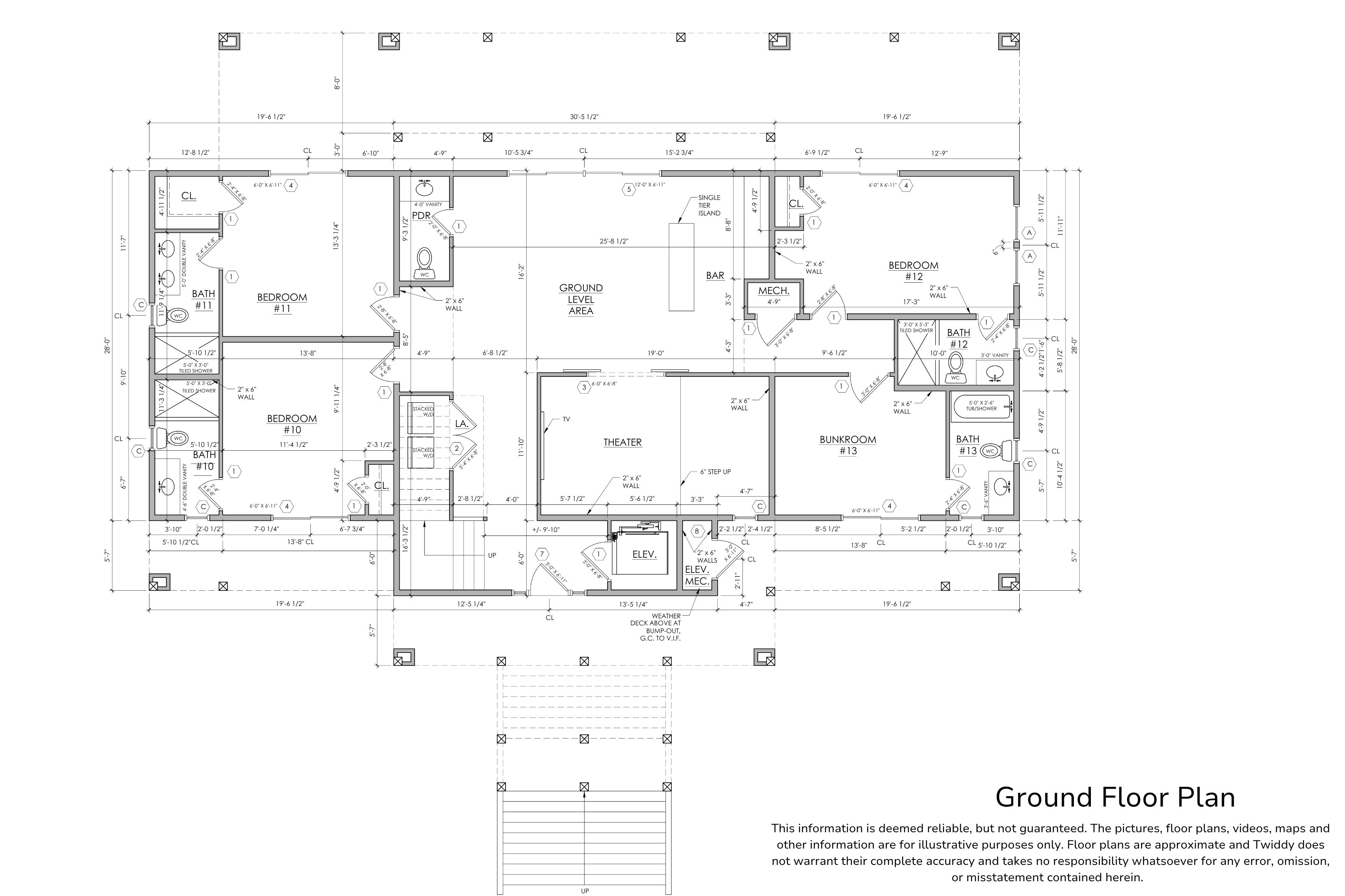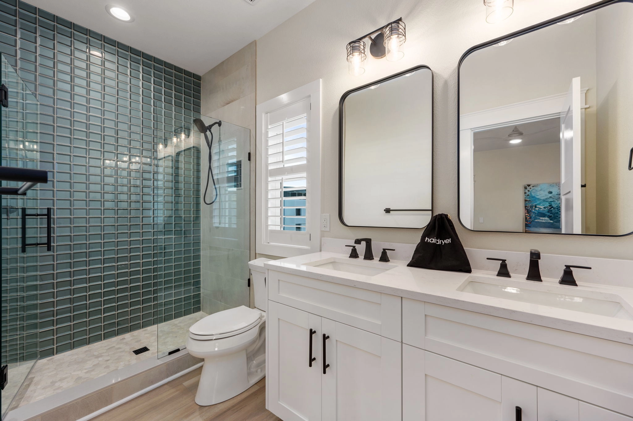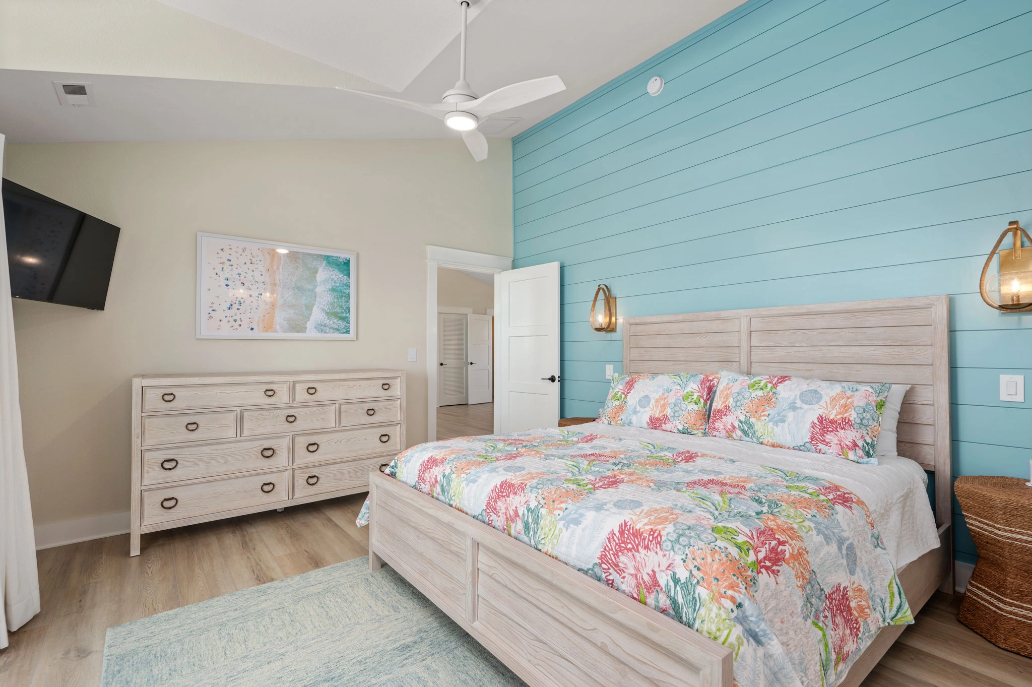 Great room with gas fireplace and shuffleboard; kitchen with gas stove, two refrigerators, and two dishwashers; dining area; wet bar with beverage refrigerator.