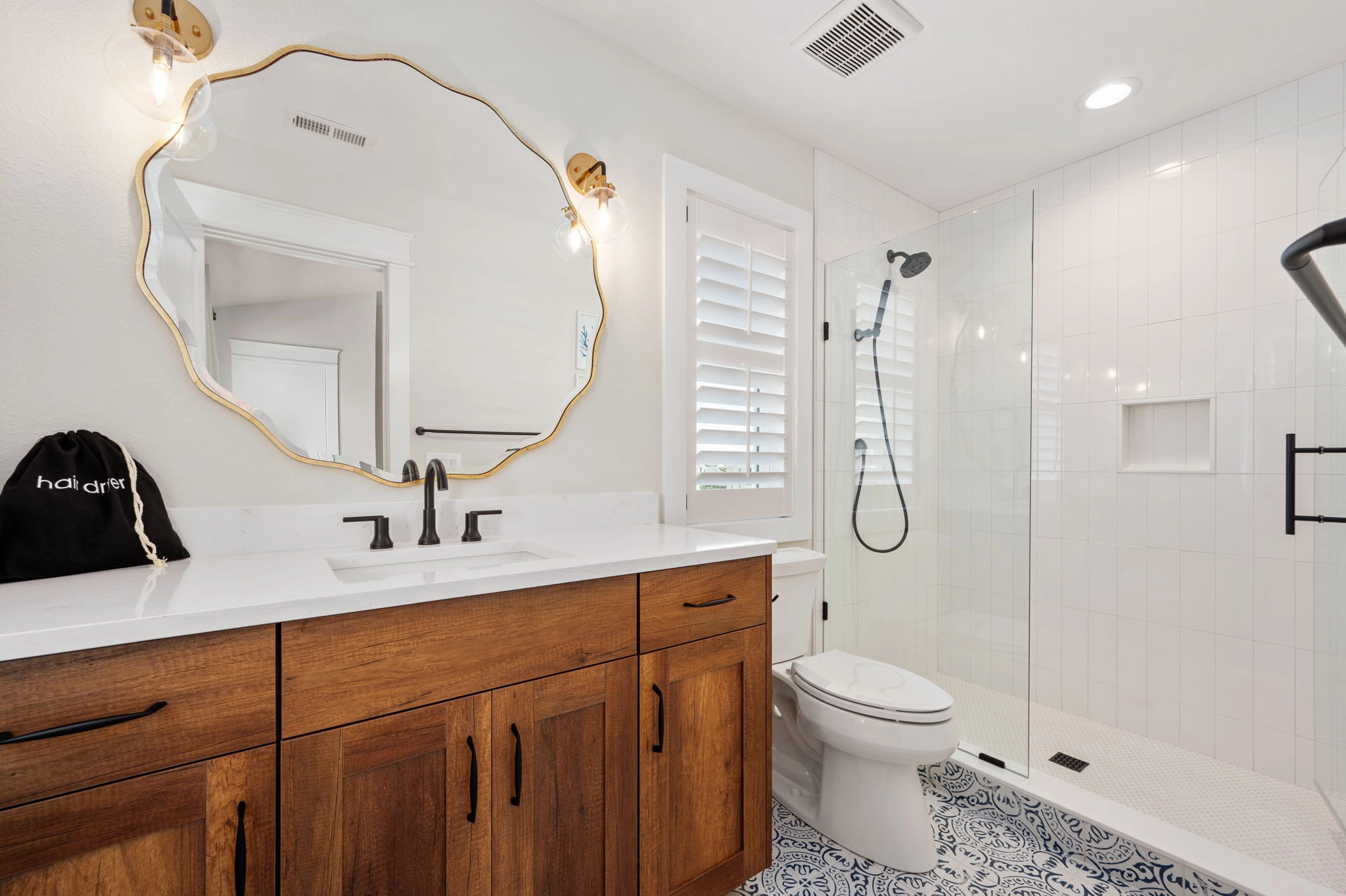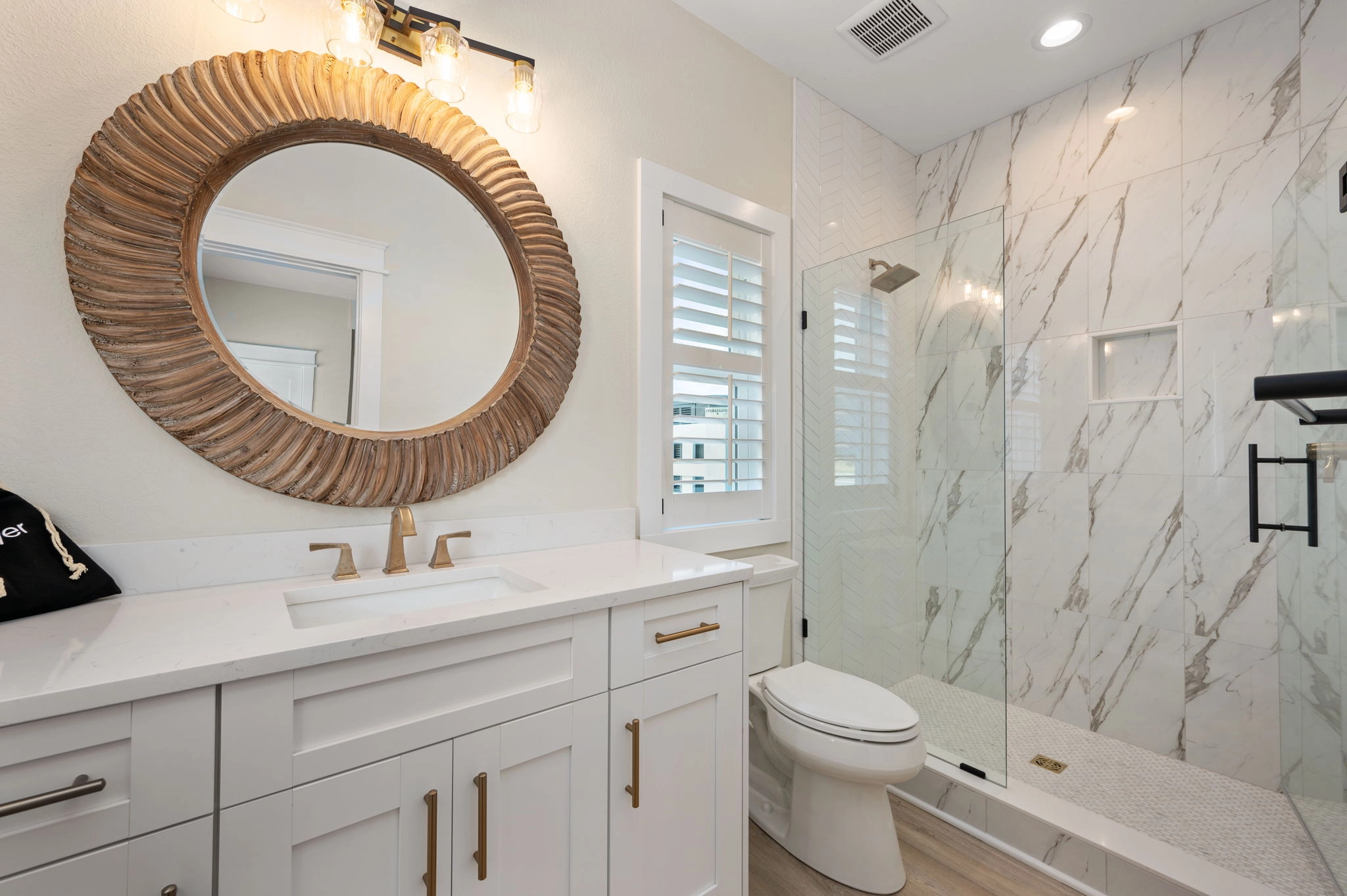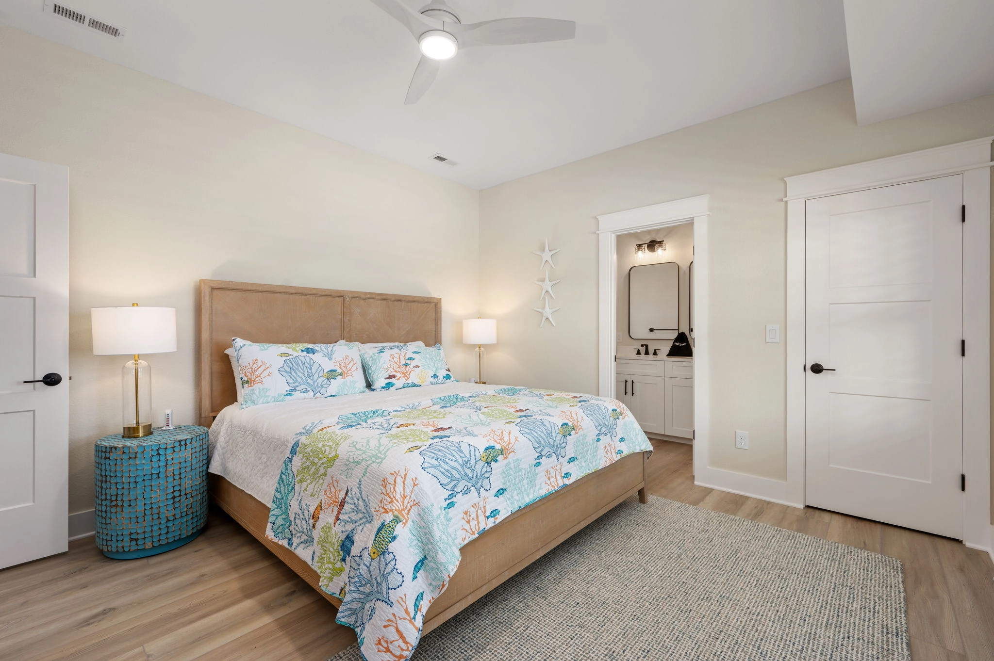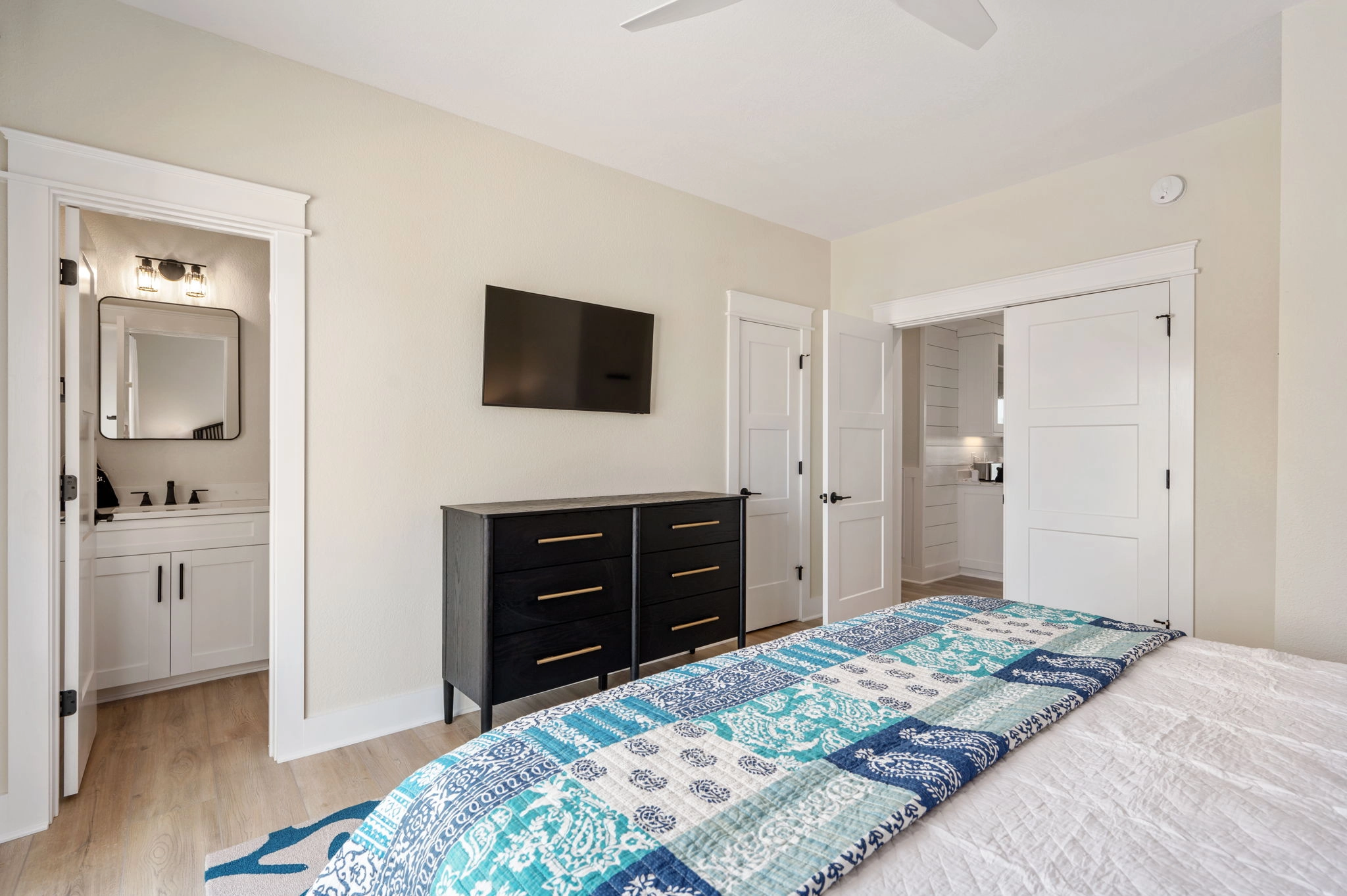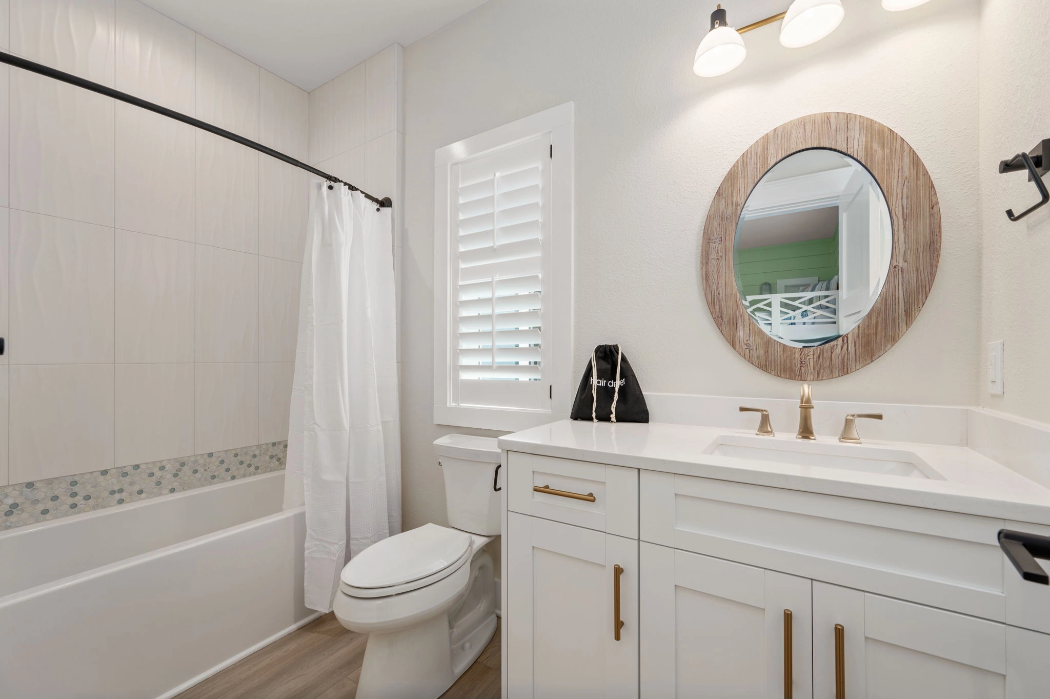 Great room with gas fireplace and shuffleboard; kitchen with gas stove, two refrigerators, and two dishwashers; dining area; wet bar with beverage refrigerator.