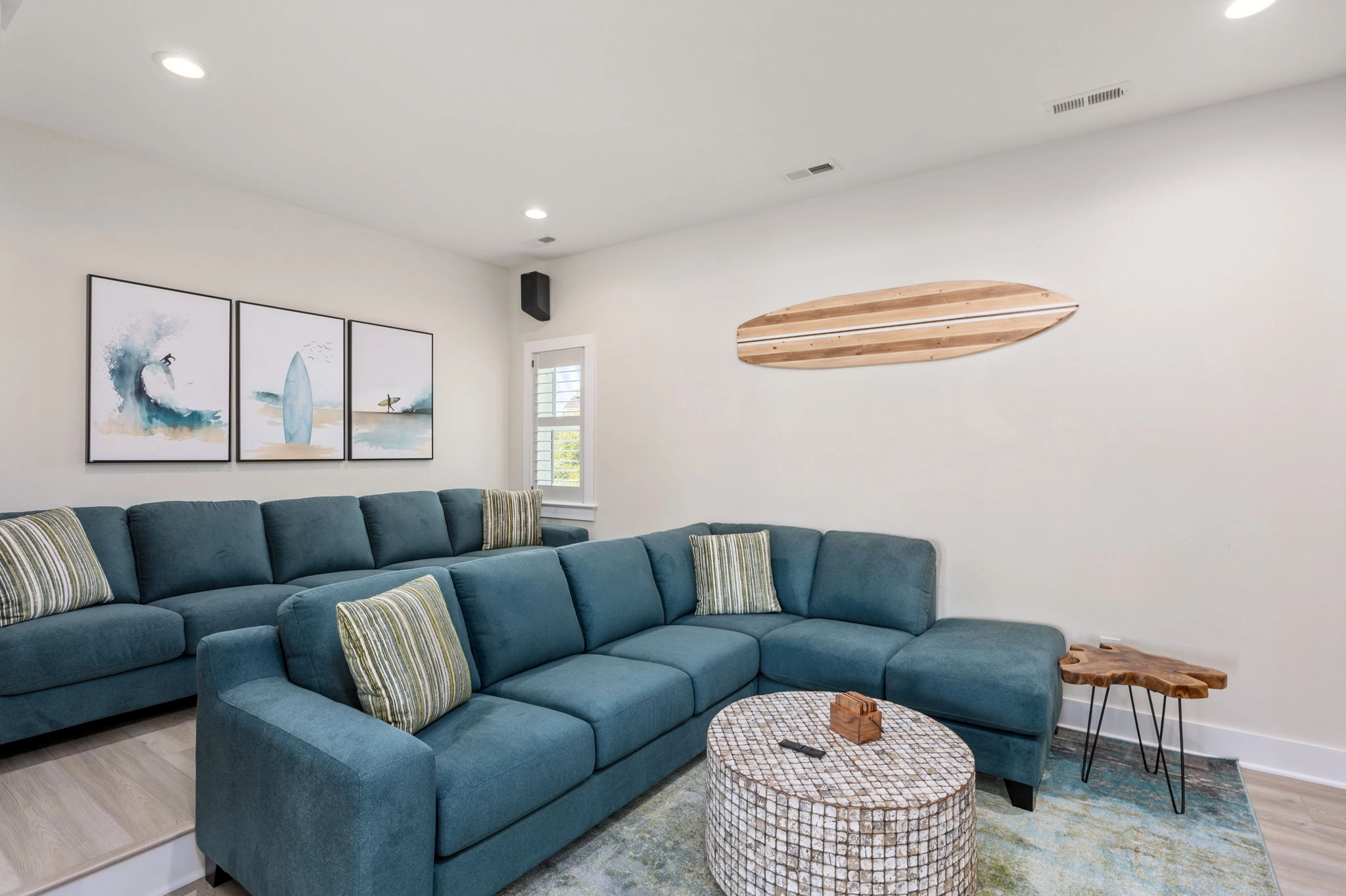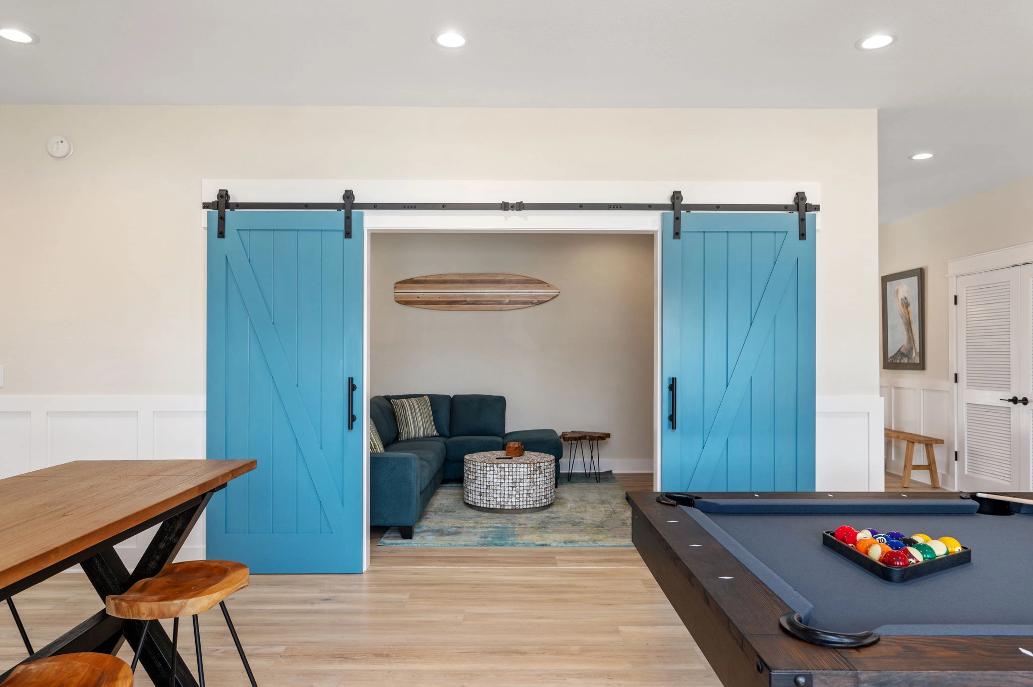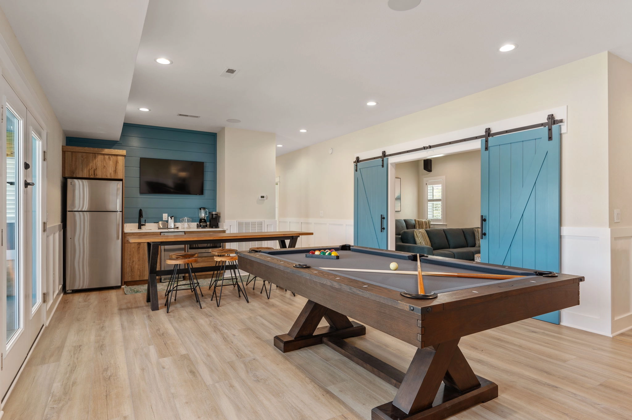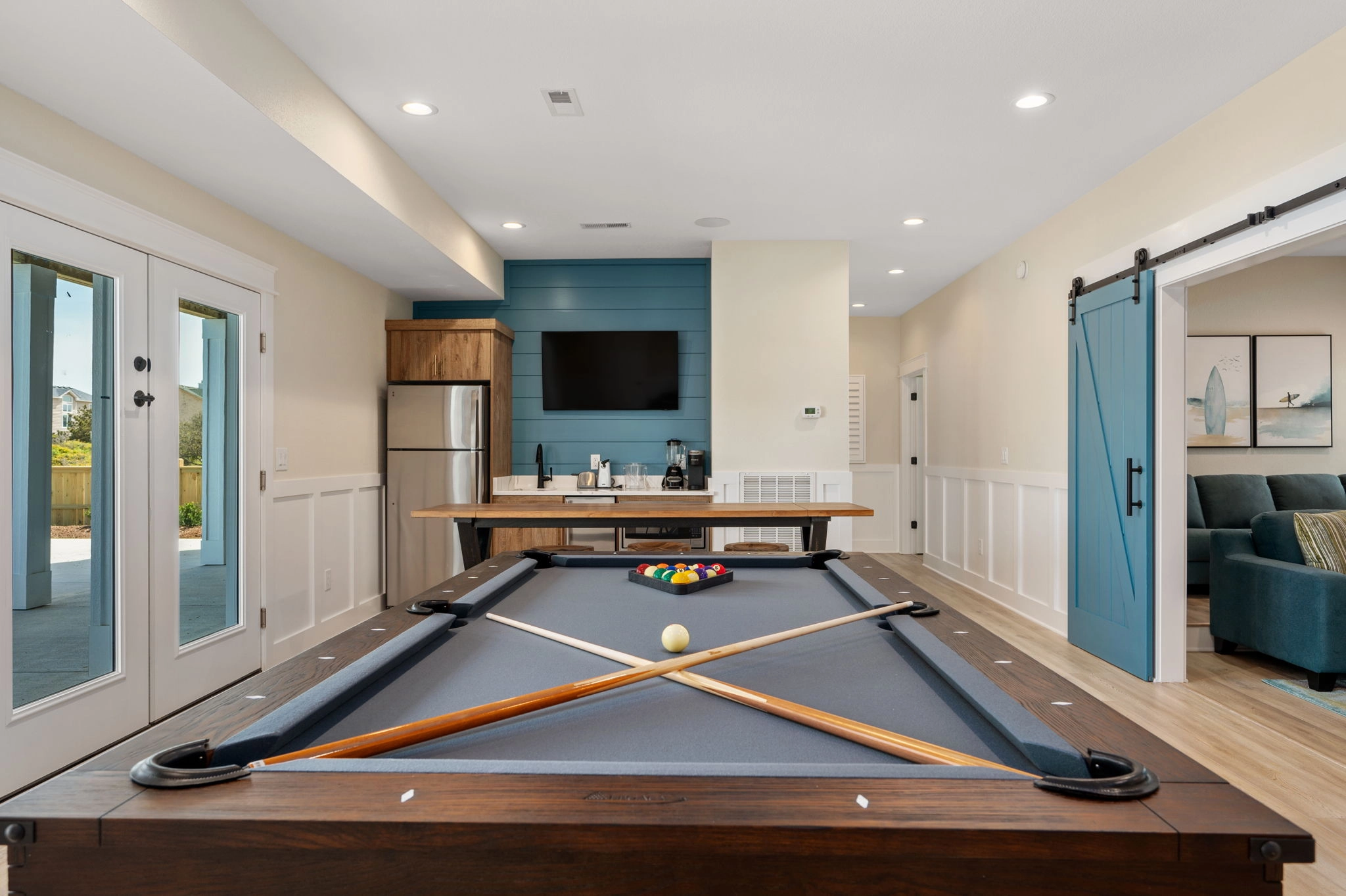 Theater room; rec room with pool table, arcade game, and wet bar with refrigerator.