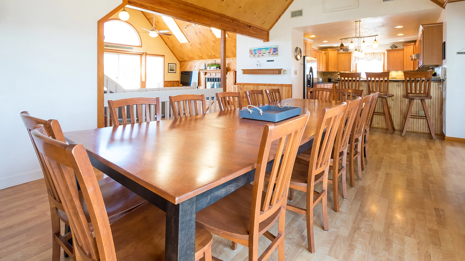 "One of the best homes we have ever stayed in! The house was well stocked and designed for a big group (multiple dishwashers, refrigerators, huge dining table, ice maker). It seemed unusual at first to have all the bedrooms on the lower floors, but it really worked because there was so much community space on the upper level. Having the driveway right on the beach path made the two block walk very easy. We had a multigenerational family group of 18 and we had a great week!"