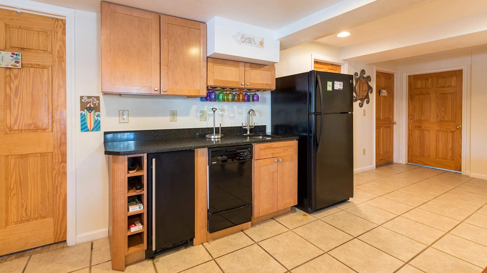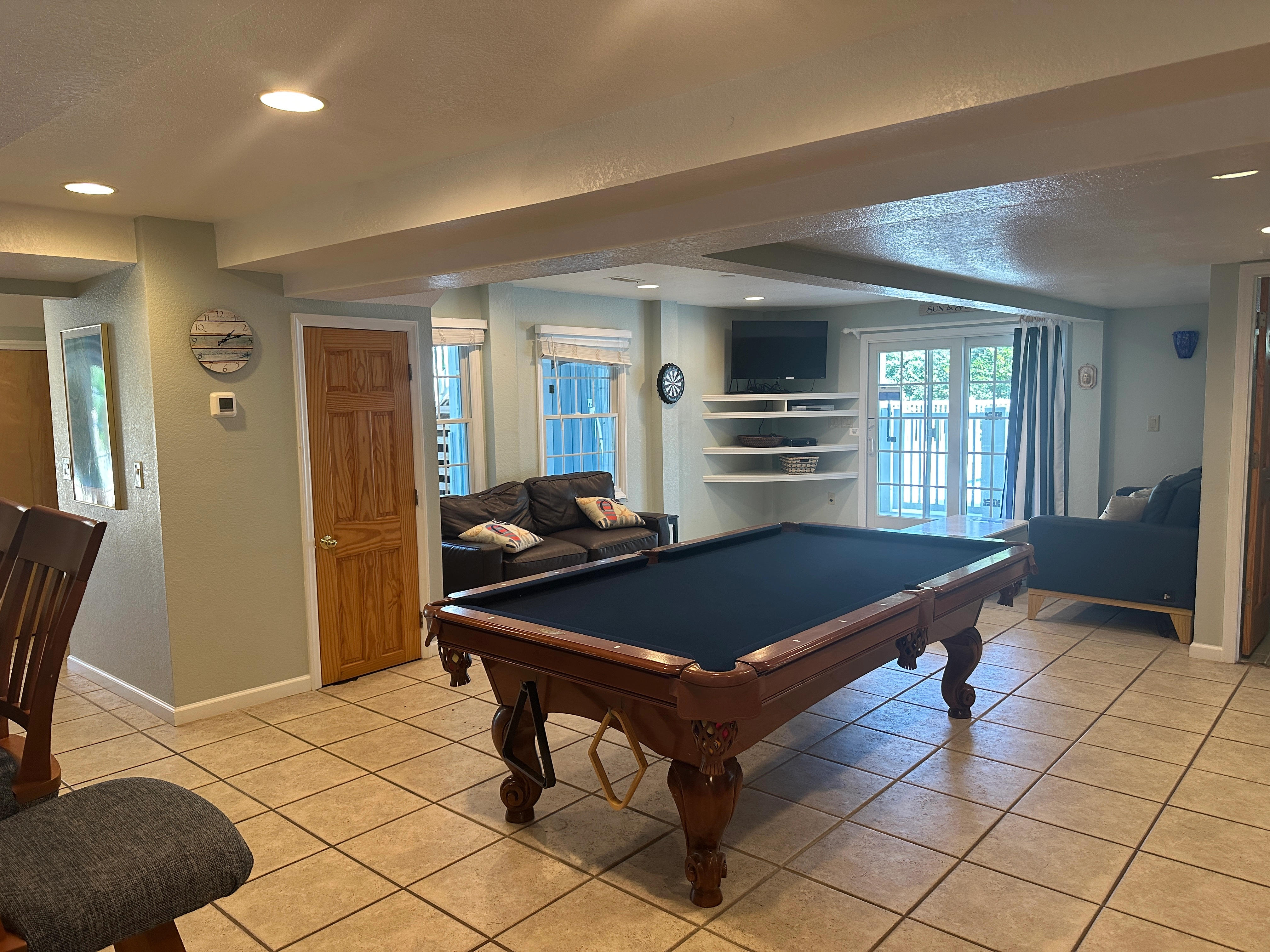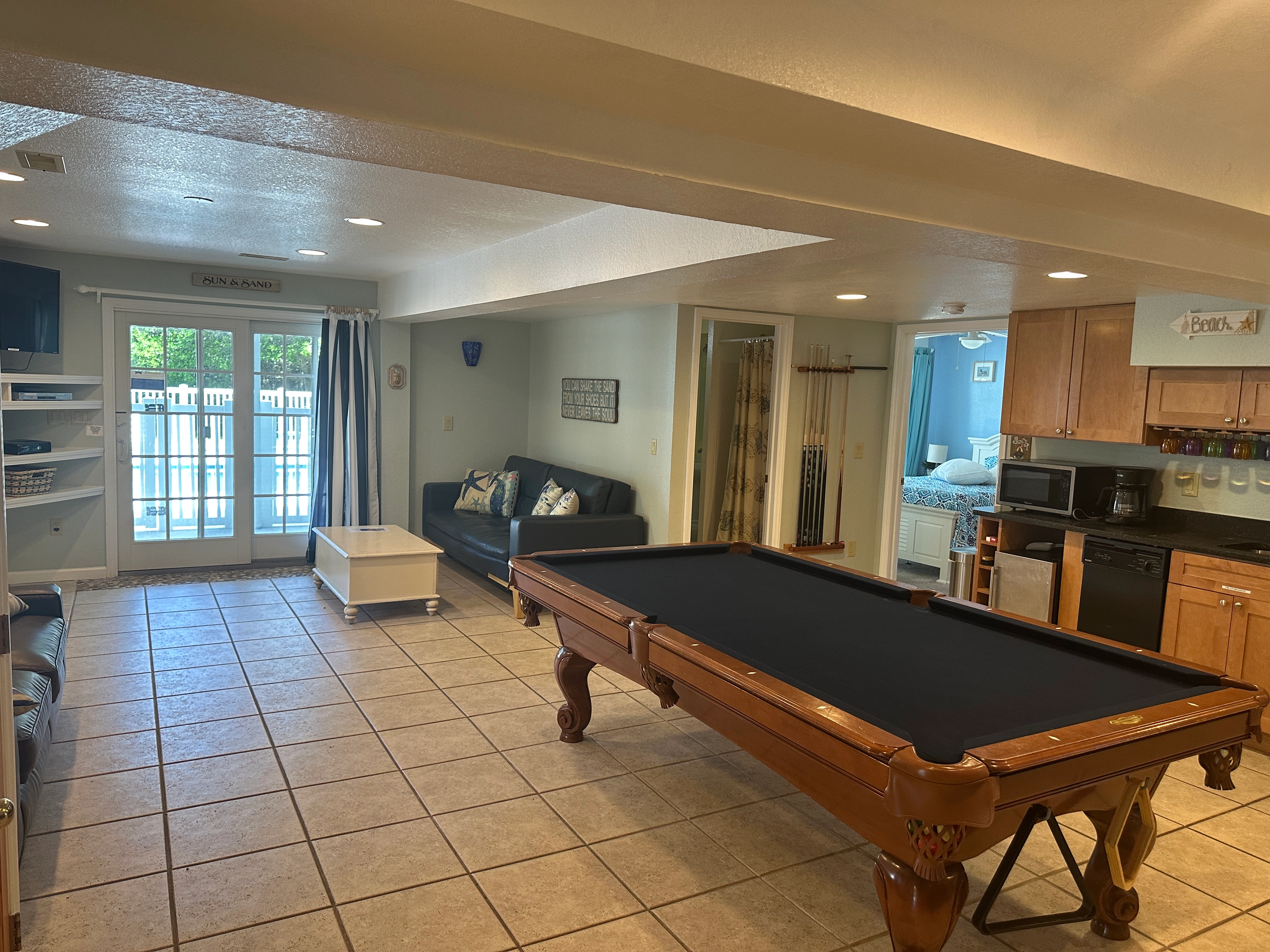 Rec room with pool table, wet bar with full-size refrigerator and dishwasher.