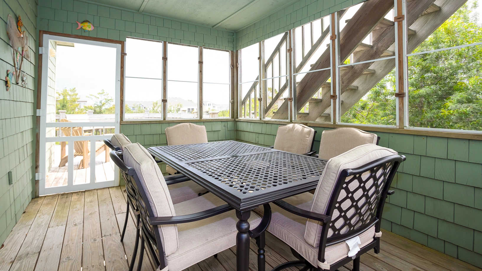 Great room (QSS); kitchen; dining area; furnished screened porch; furnished sun decks.