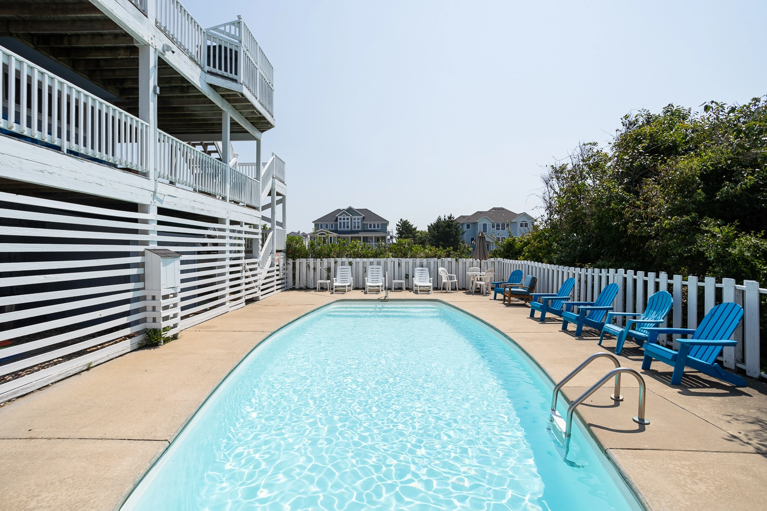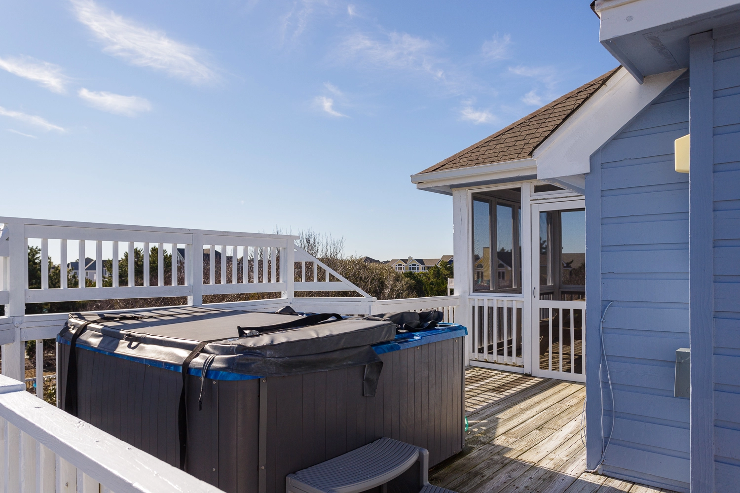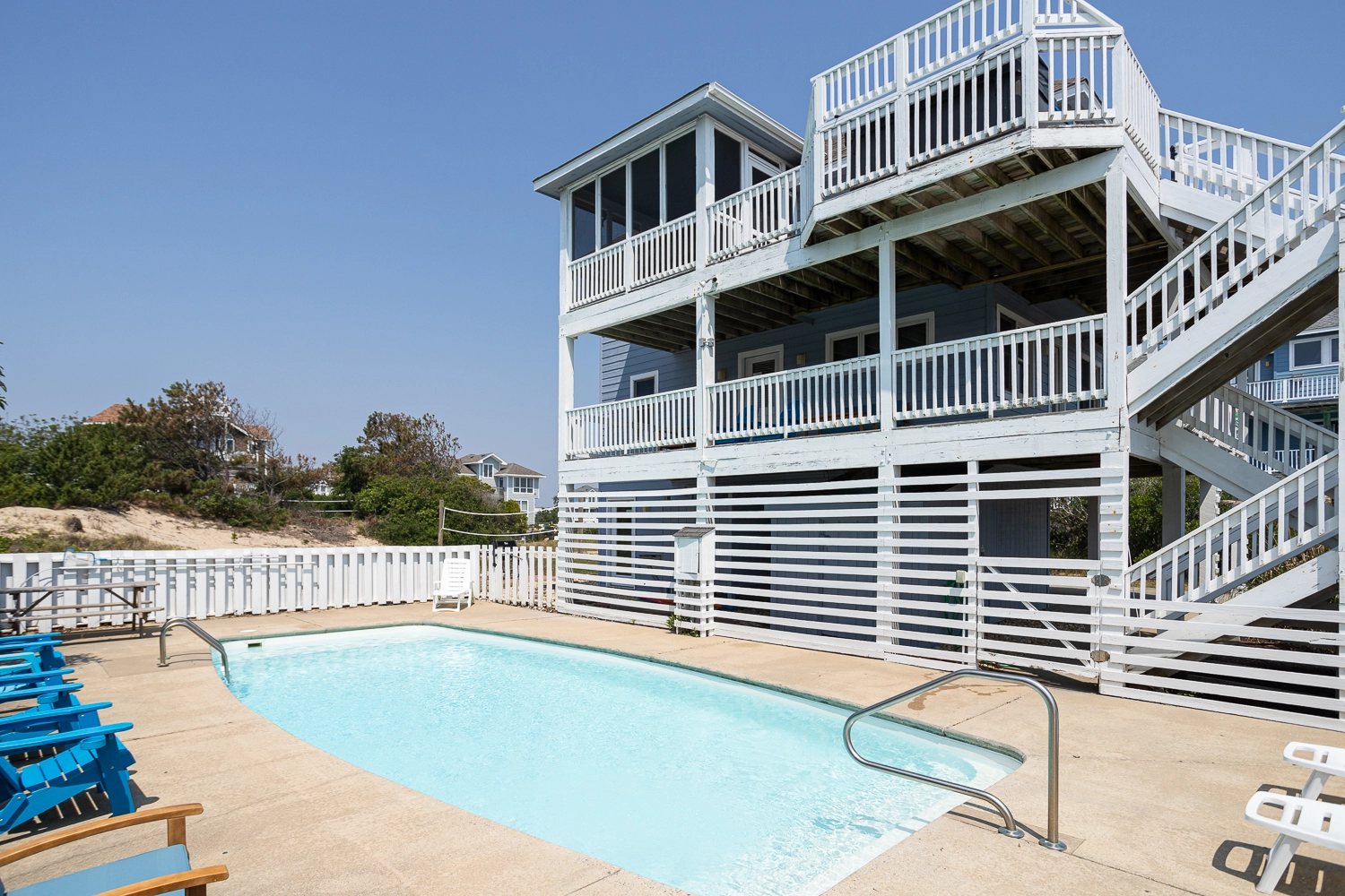 "large private pool with tall bushes surrounding it creating real privacy comfortable beds good sized kitchen with all the amenities brand new stove and refrigerator (loved the pantry to hold all our food) even though we were 1 street back from the beach we could still see and hear the ocean. We loved the 3rd floor deck hot tub on the 3rd floor deck was so much better than on a lower floor plenty of beach chairs for everyone!"