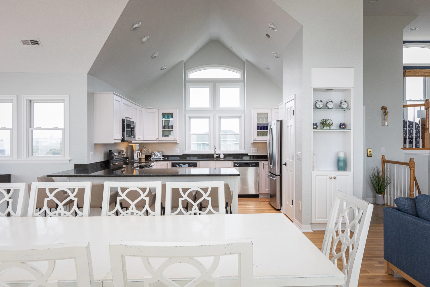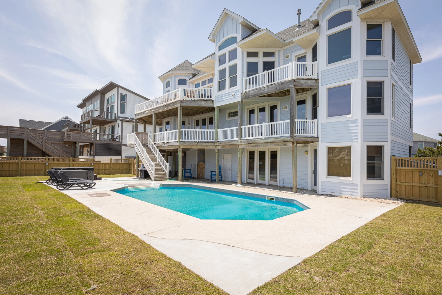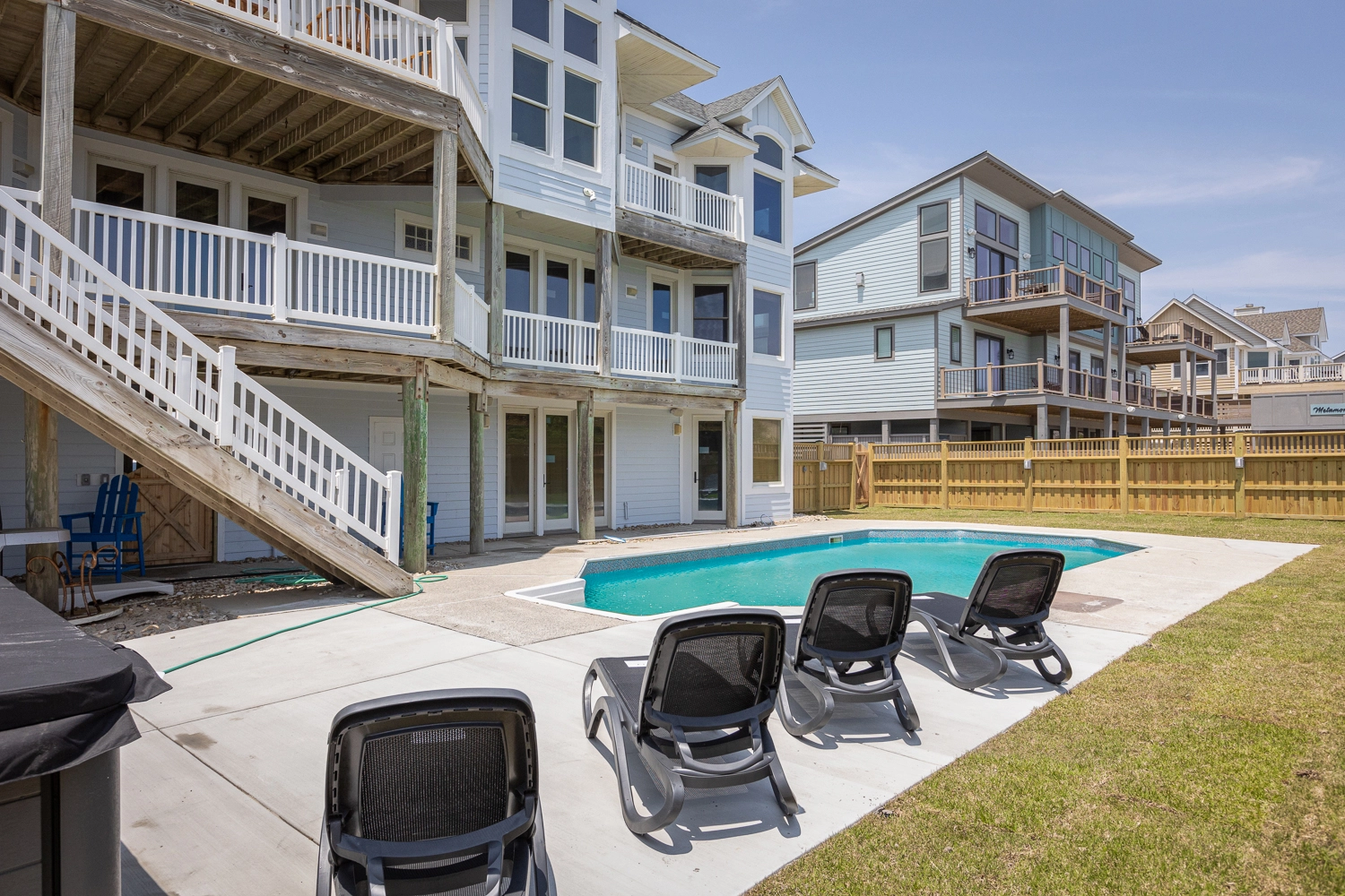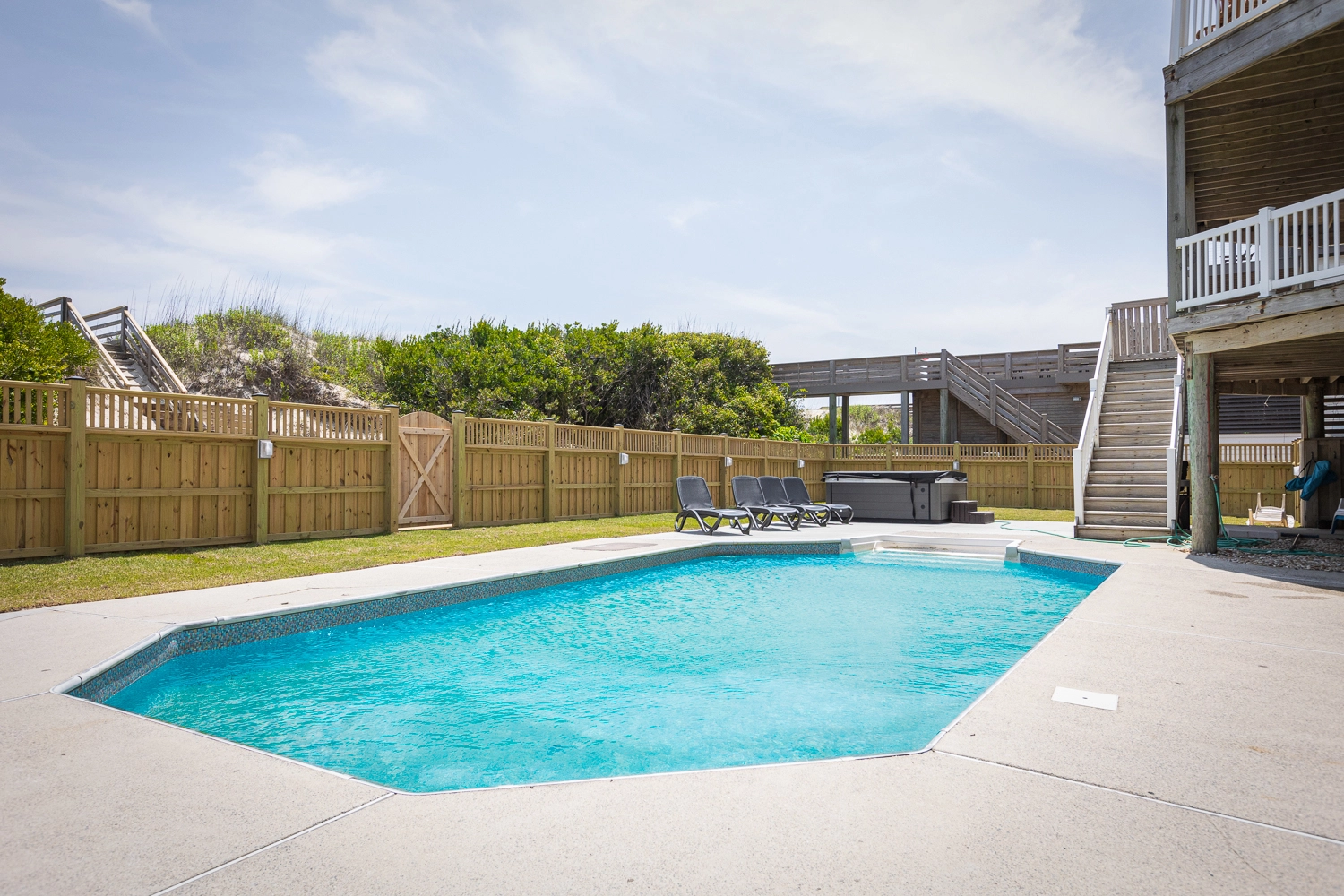 "We loved the updated furniture, flooring and paint. The kitchen was excellently equipped with ample silverware, pots and pans. We were pleasantly surprised to find the second refrigerator on the lower floor. It came in handy! We spent a lot of time in the pool and new hot tub. The beautiful ocean view from the top decking delighted and calmed the senses."