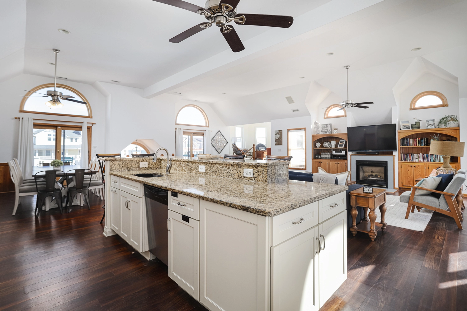 Great room; kitchen with two dishwashers; dining area.