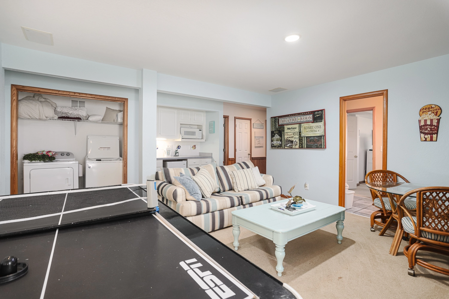 Rec room with wet bar, beverage refrigerator, and microwave; laundry.