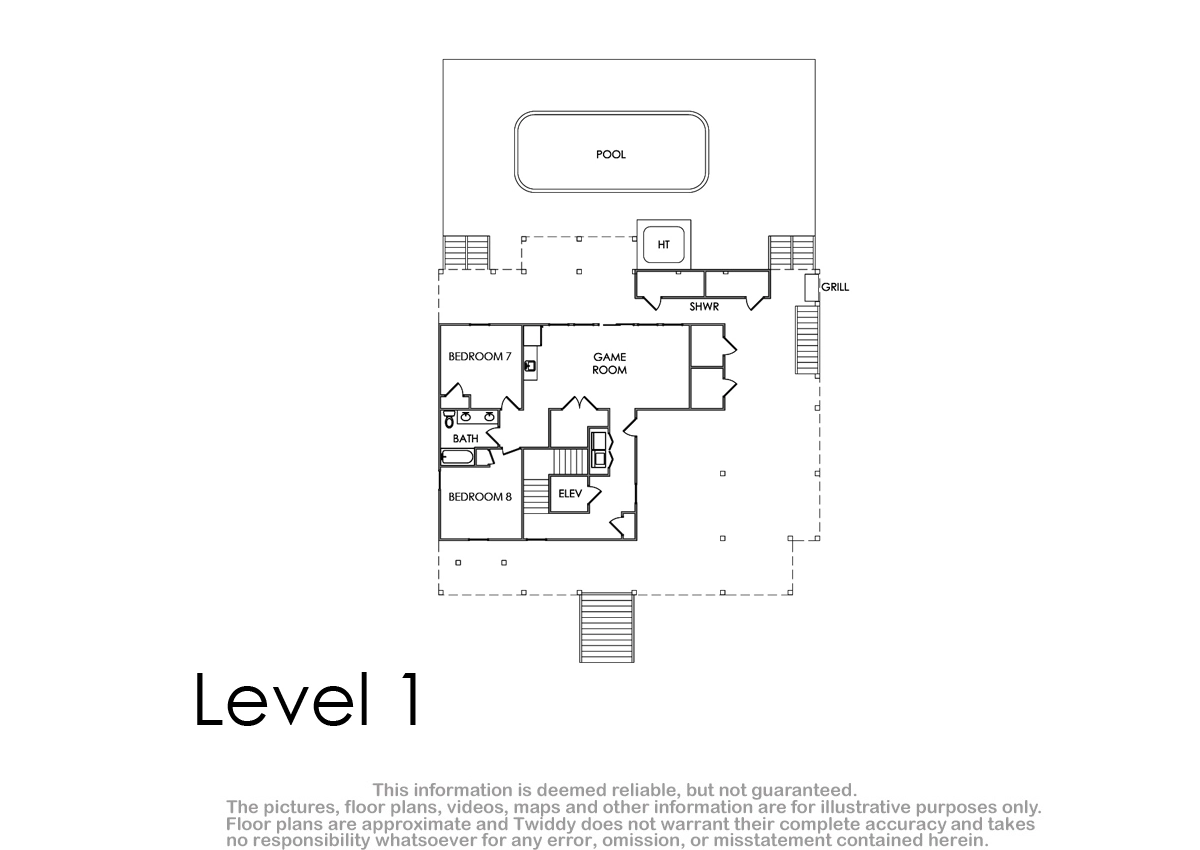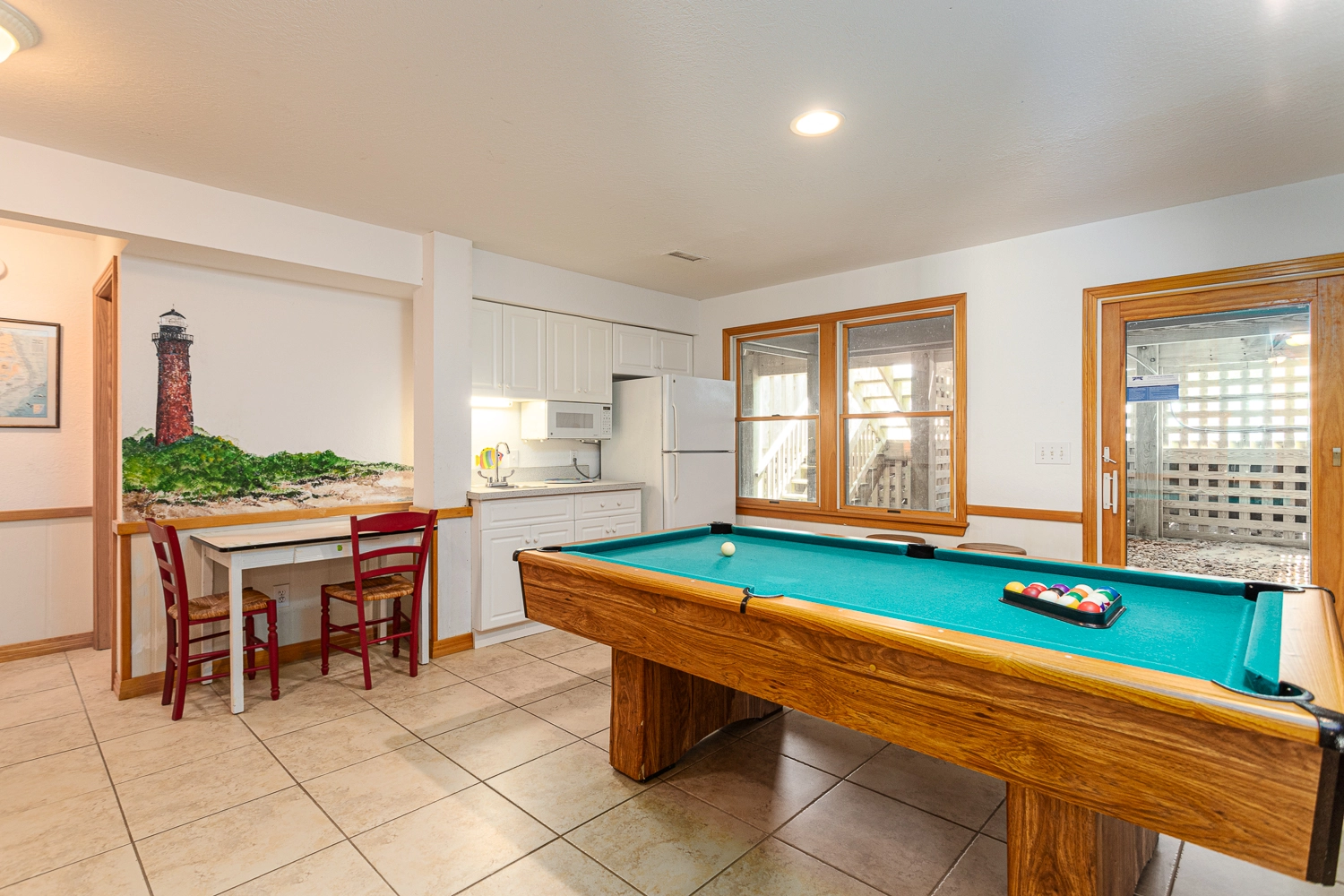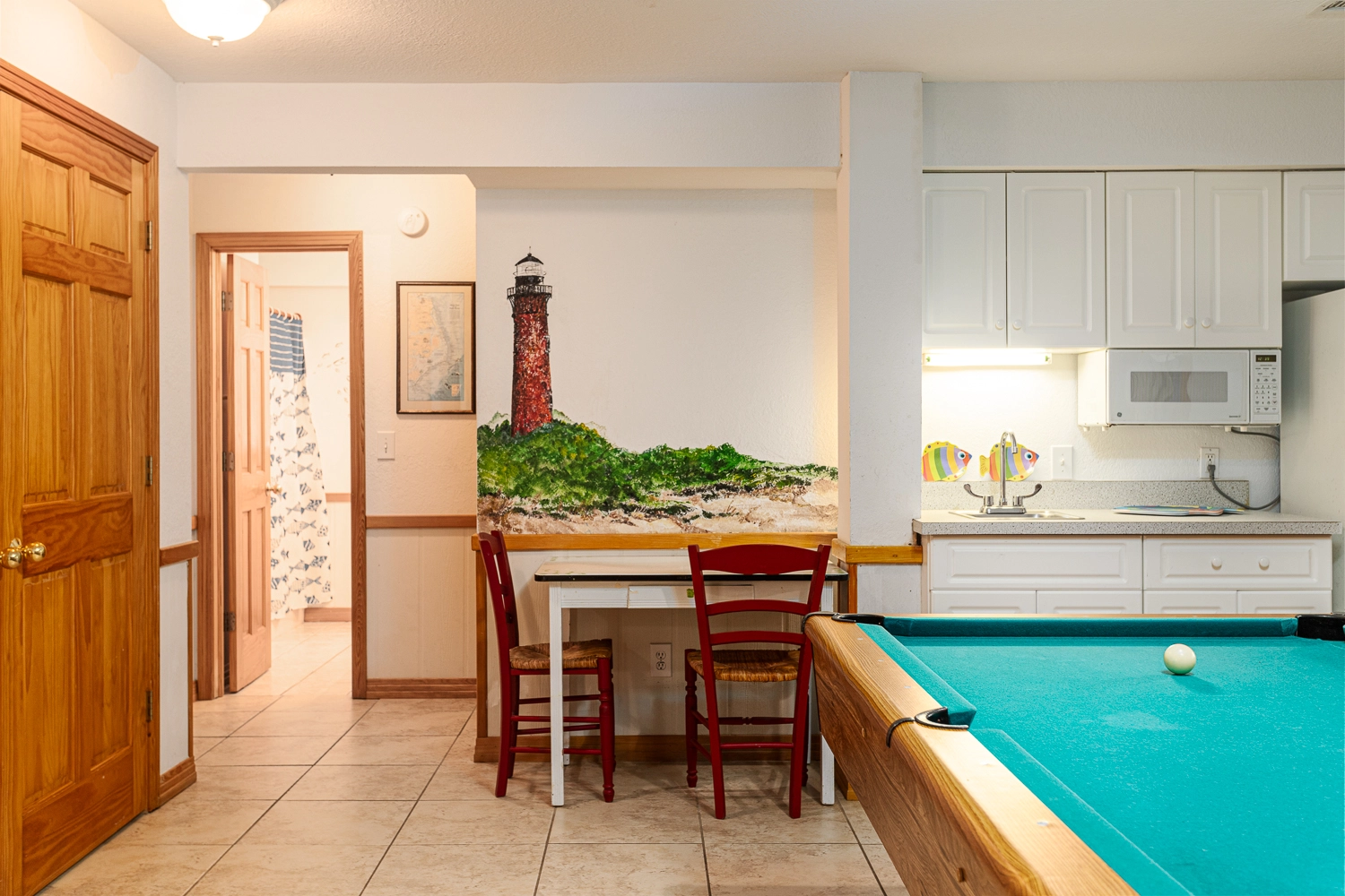 Rec room with pool table, wet bar, microwave and refrigerator; laundry; access to private pool and hot tub.