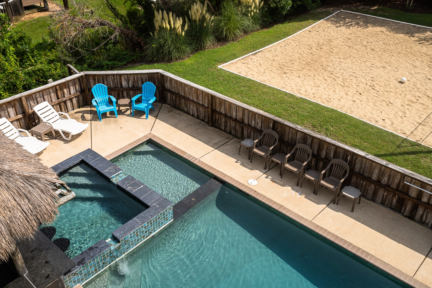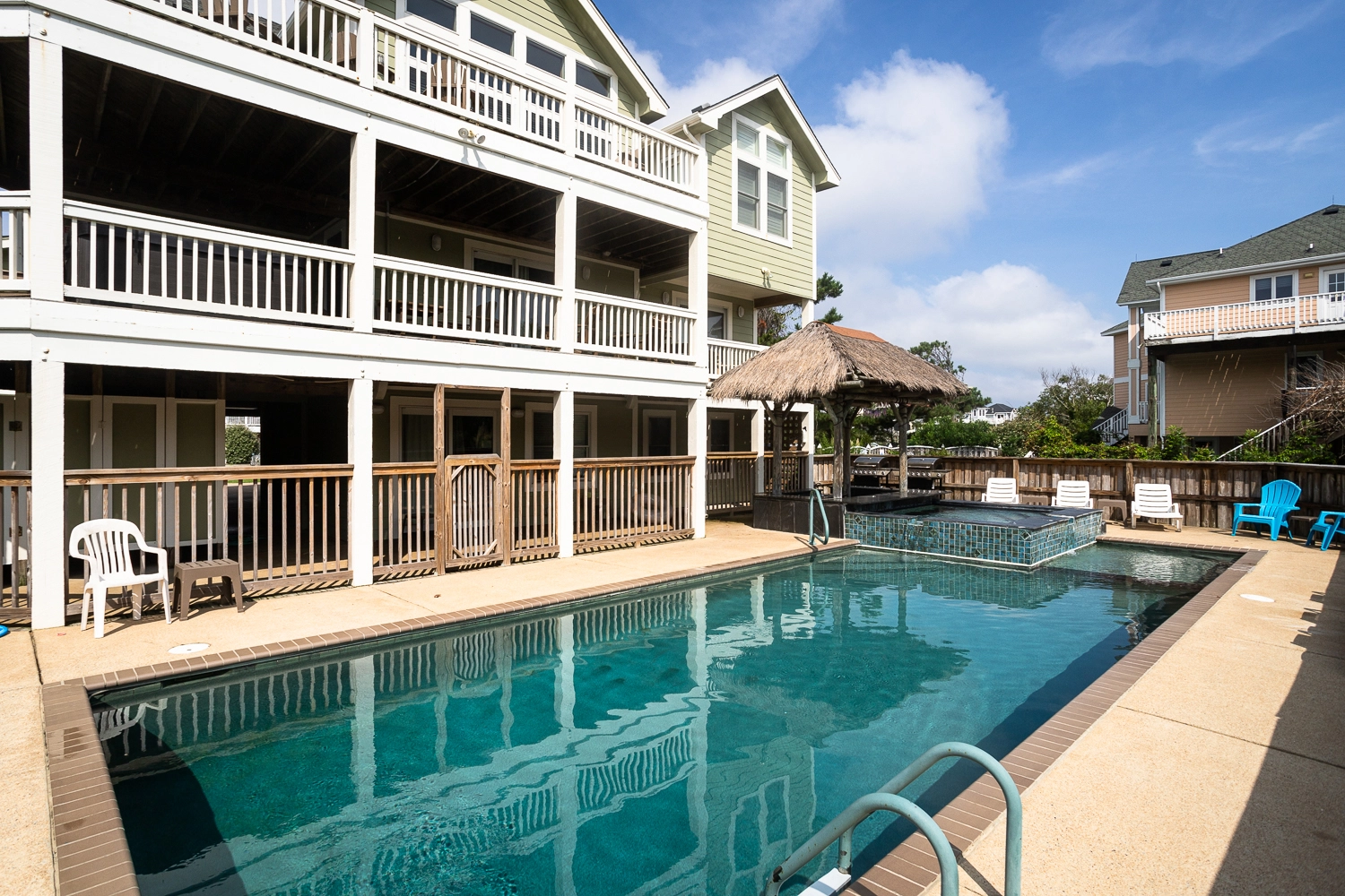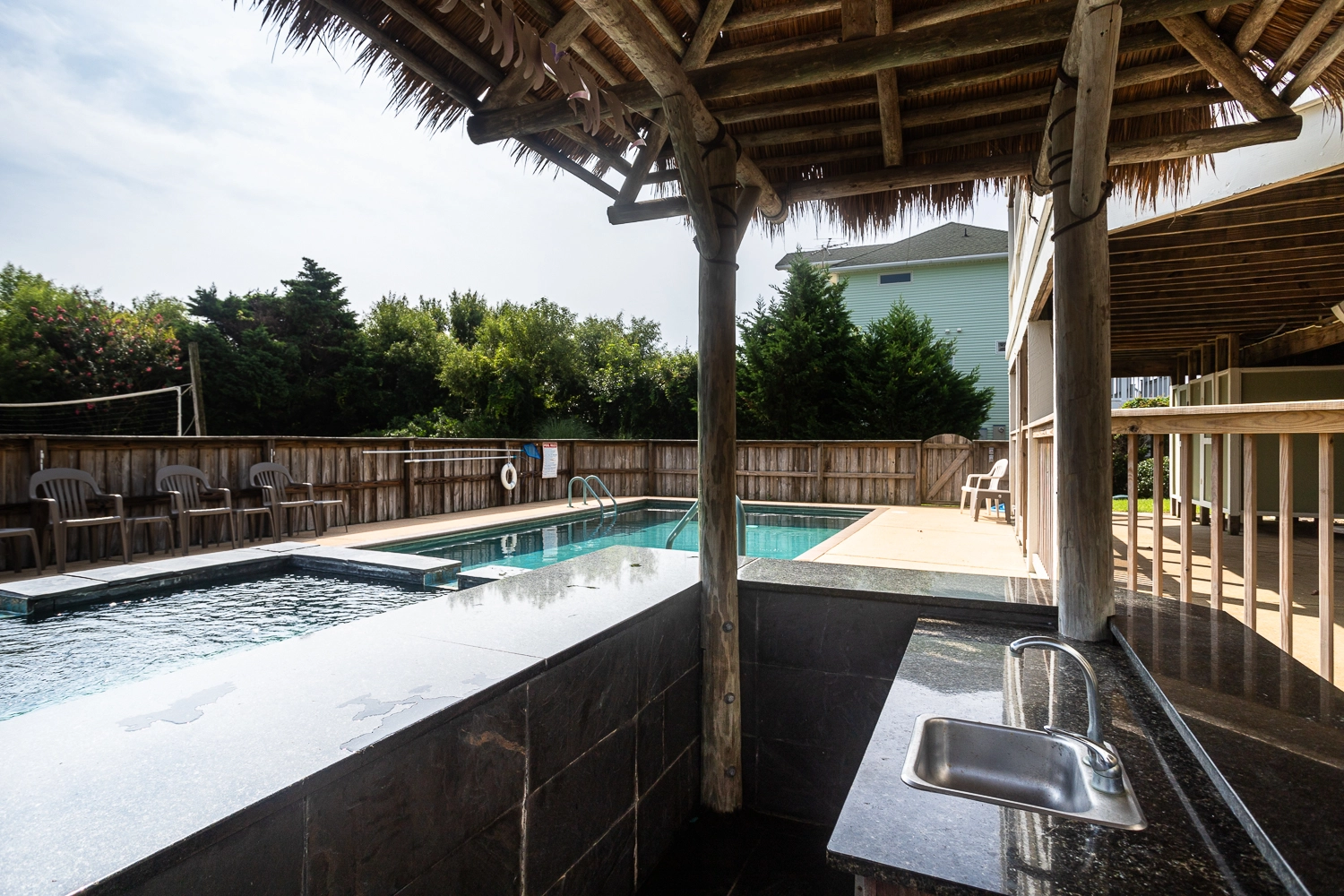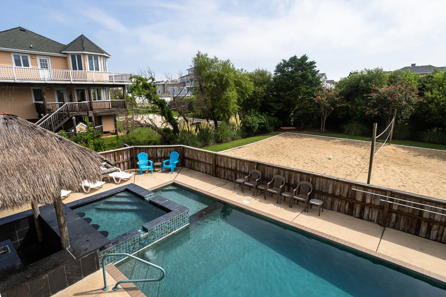 Gated private pool, hot tub, poolside tiki bar, basketball goal, volleyball set, gas grill.