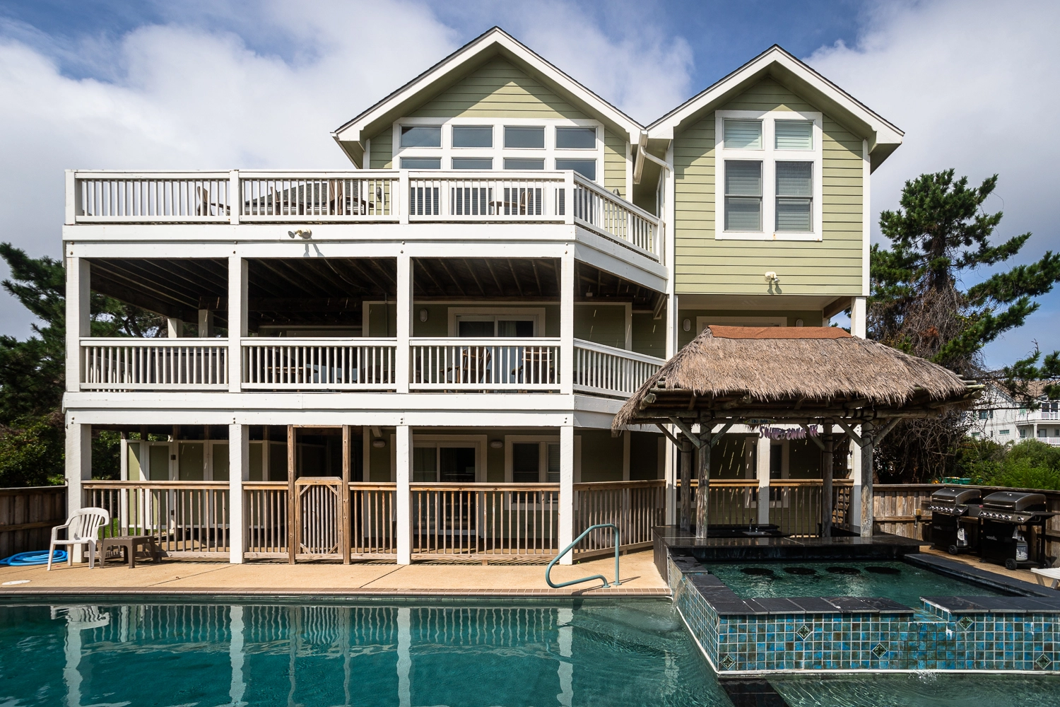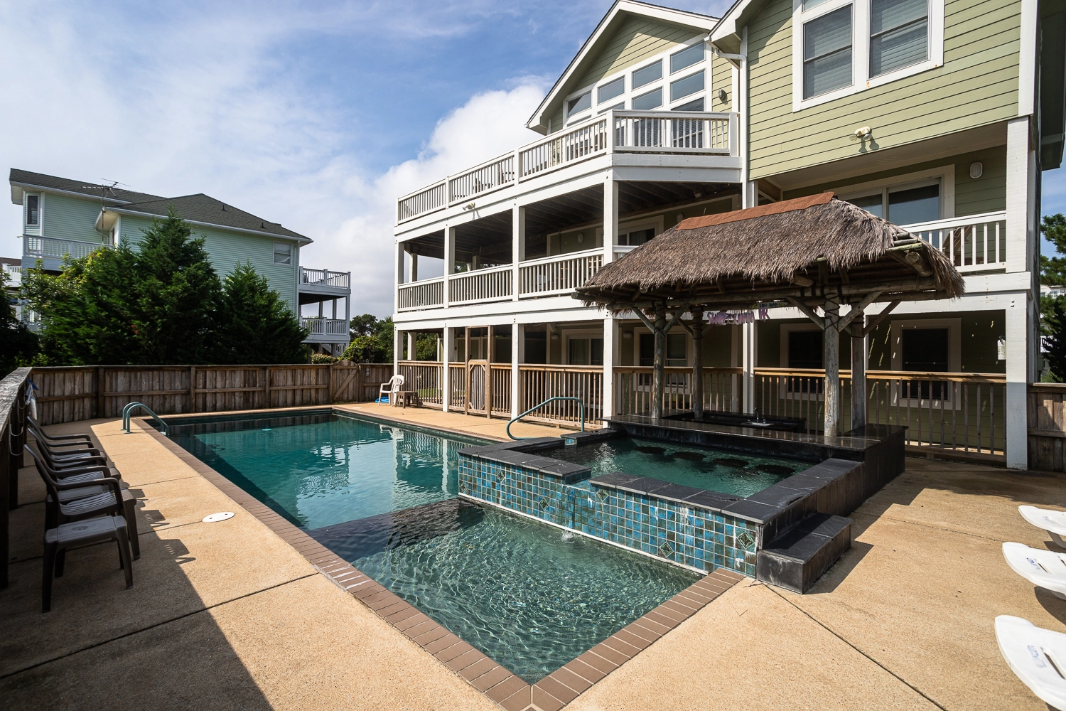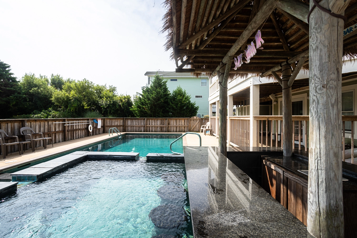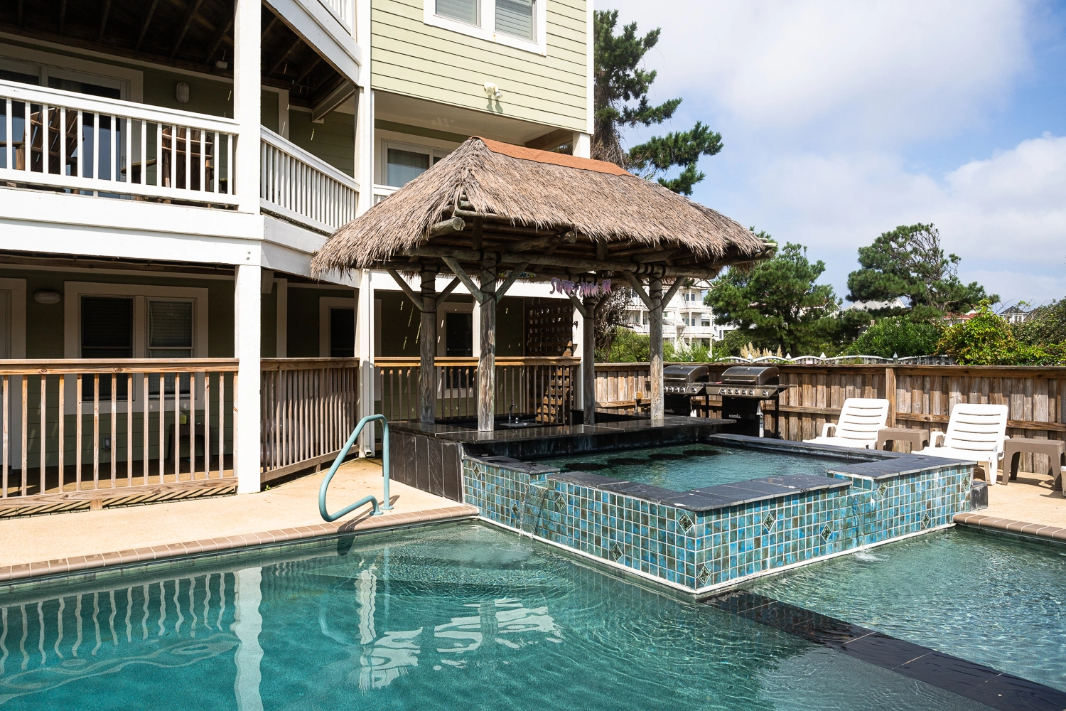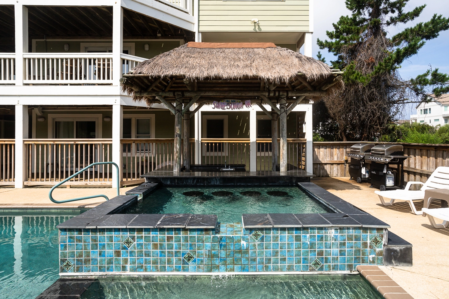 Gated private pool, hot tub, poolside tiki bar, basketball goal, volleyball set, gas grill.