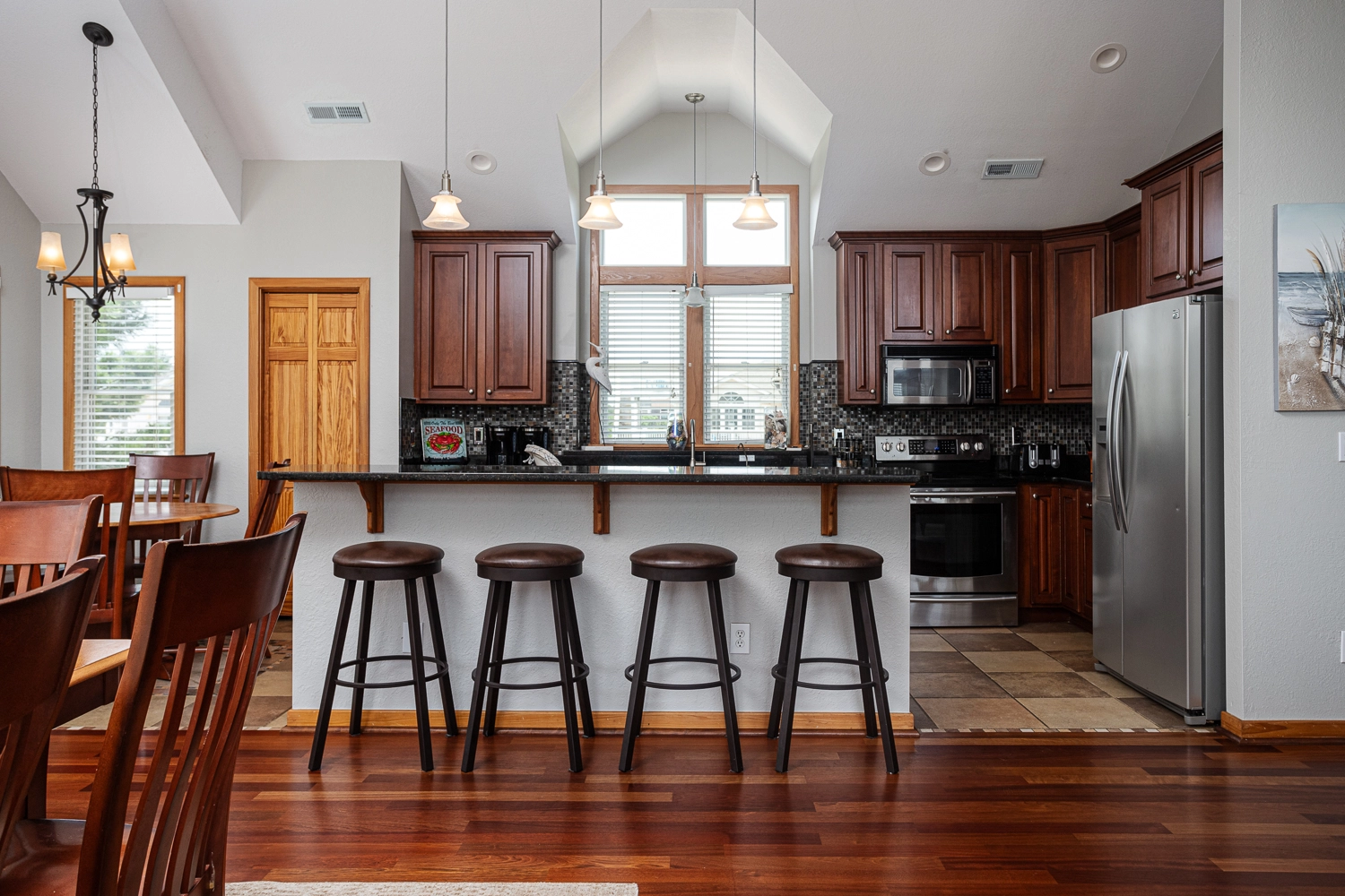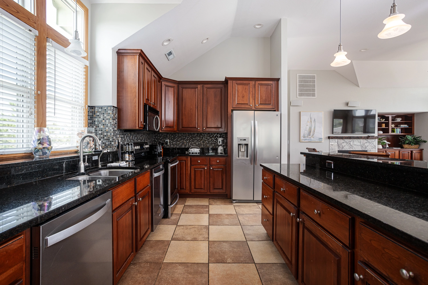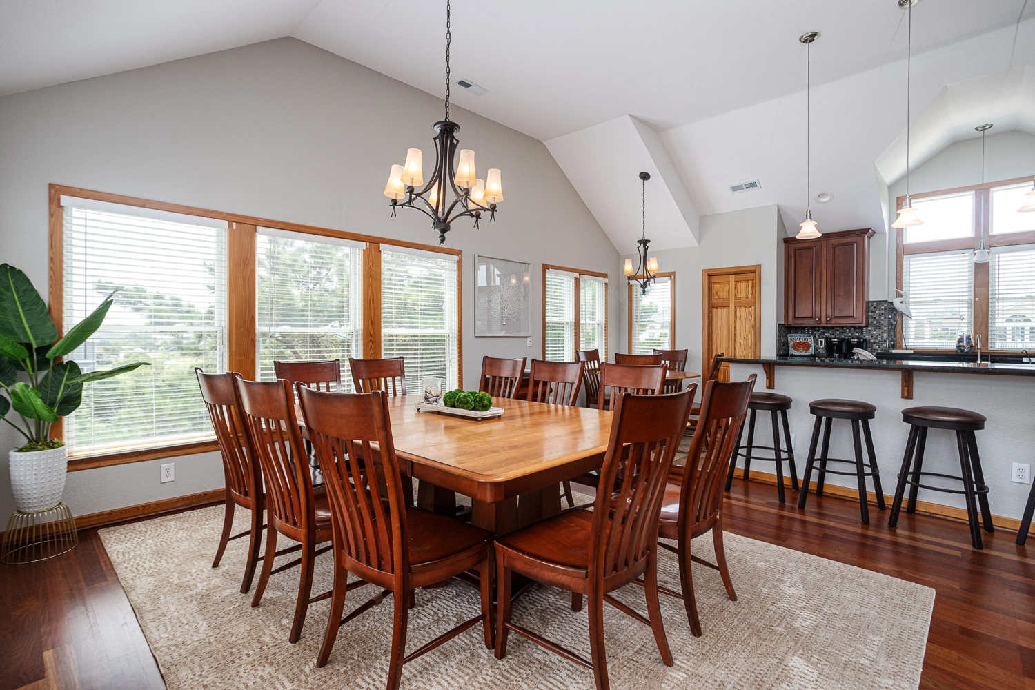 Great room; kitchen with two dishwashers; dining area.
