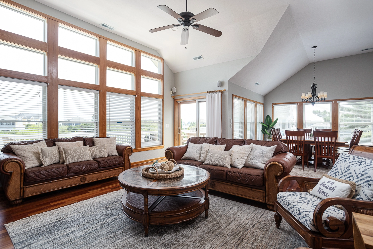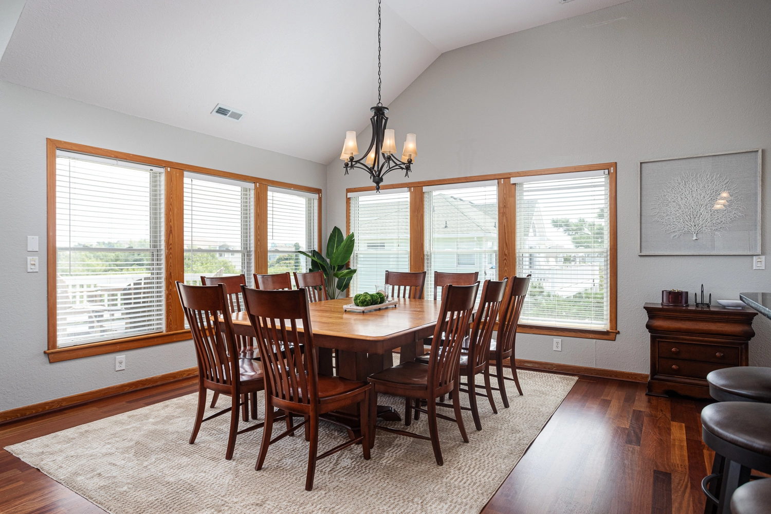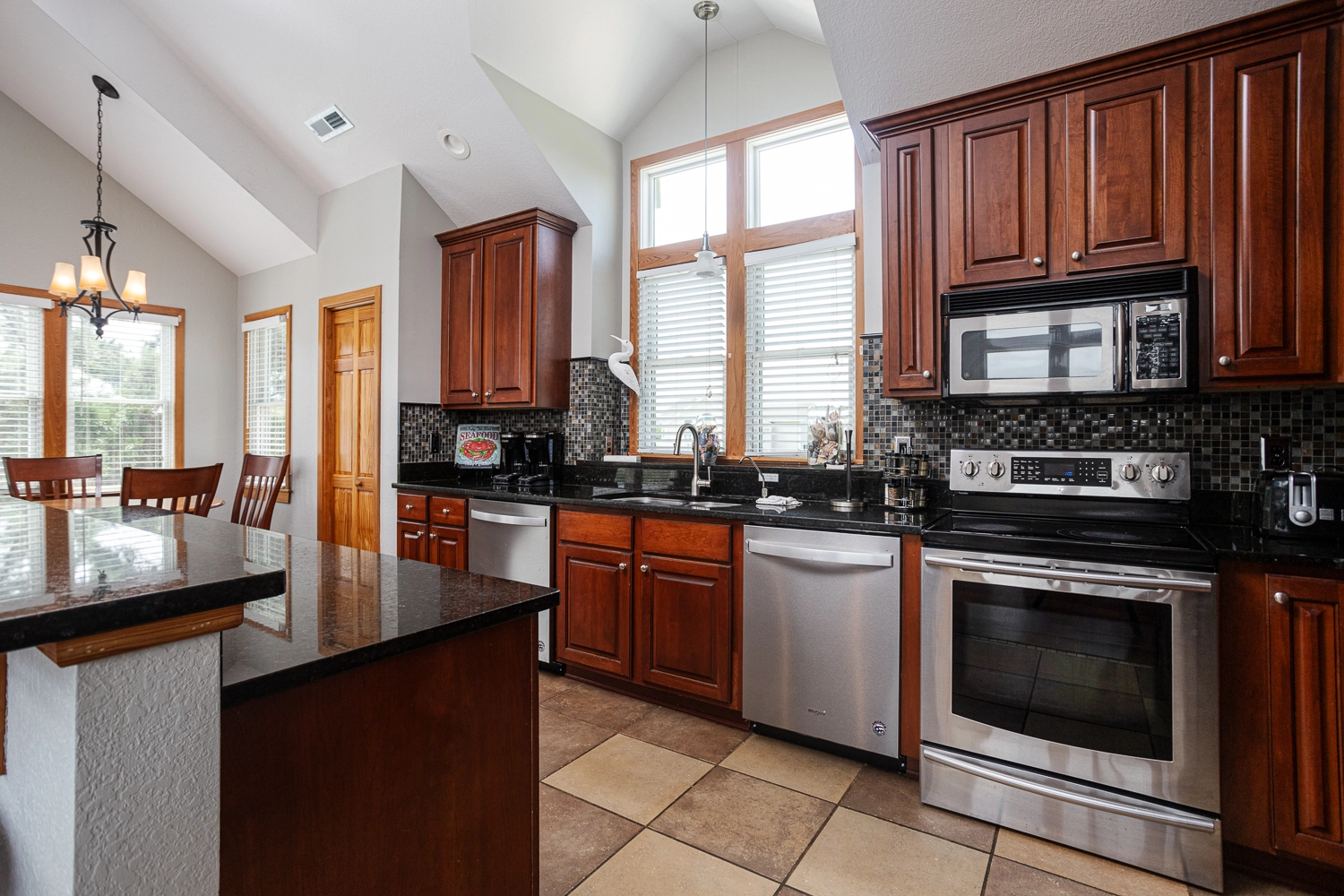 Great room; kitchen with two dishwashers; dining area.