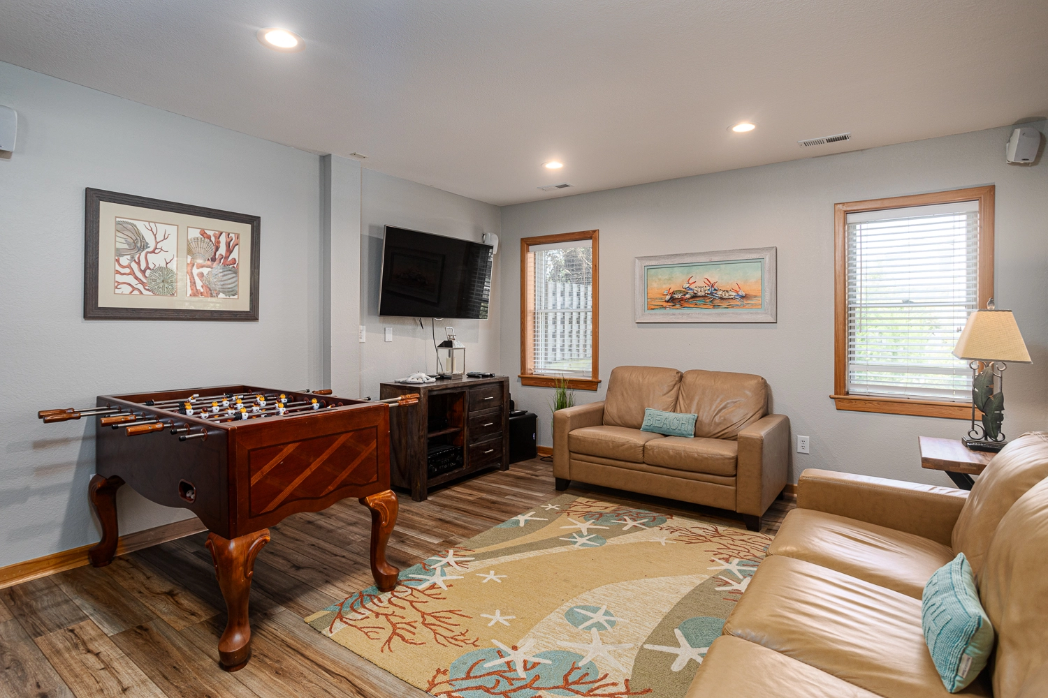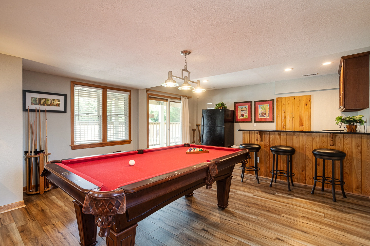 Rec room with pool table, foosball, and wet bar with refrigerator and dishwasher.