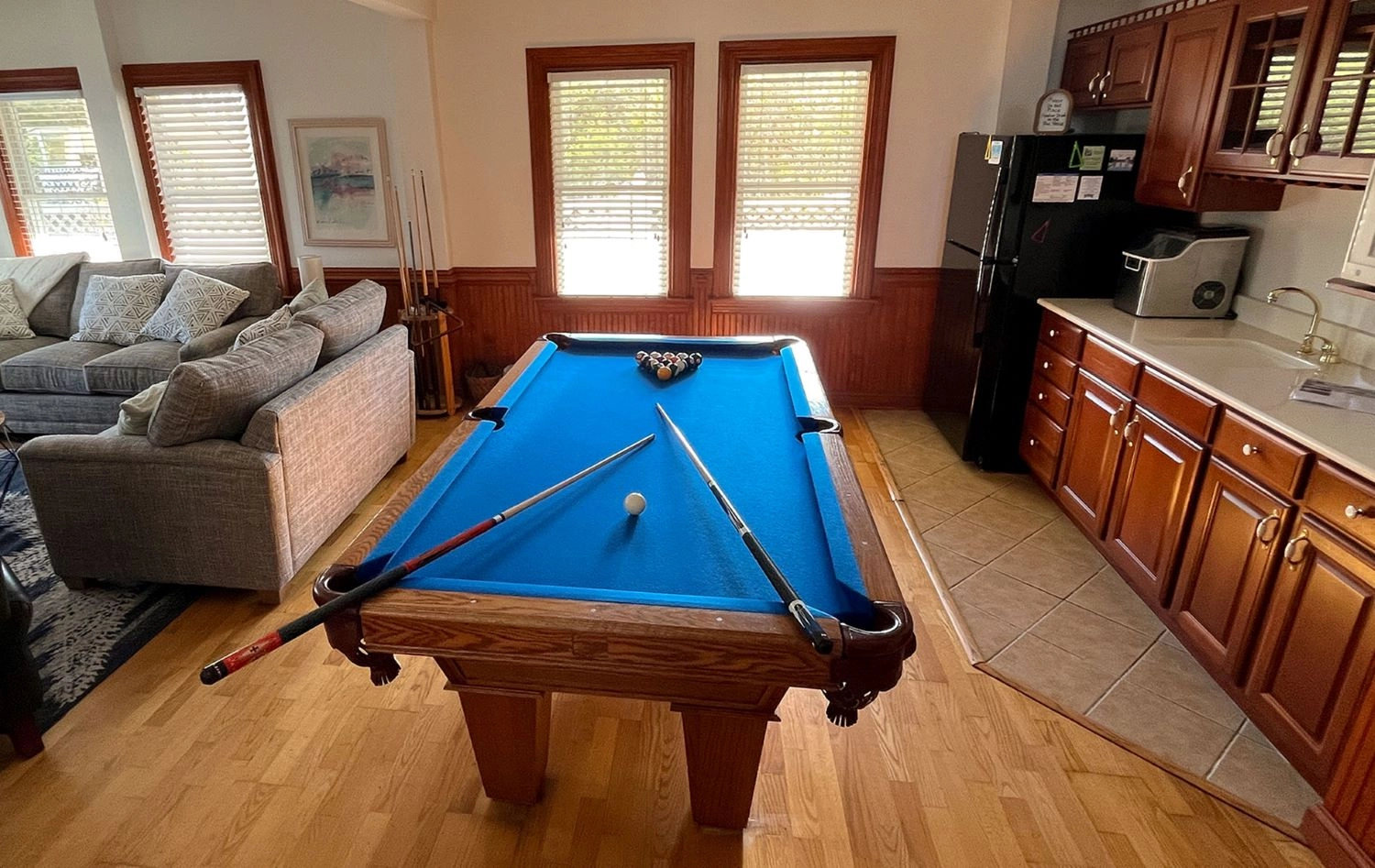 Rec room with pool table, kitchenette and full size refrigerator; laundry.