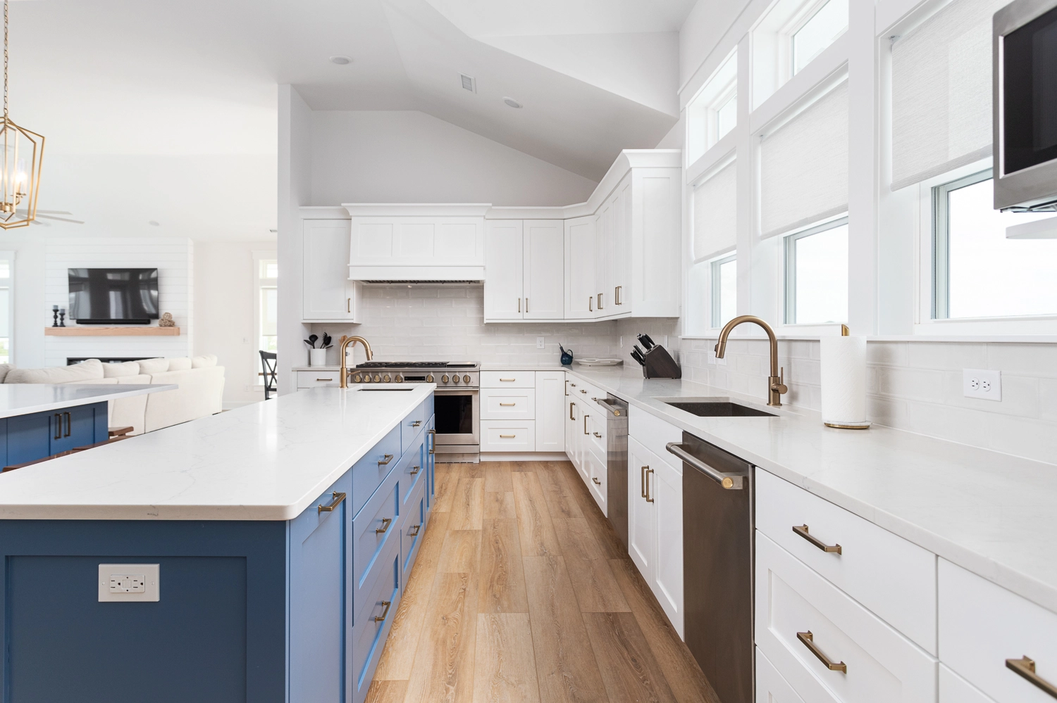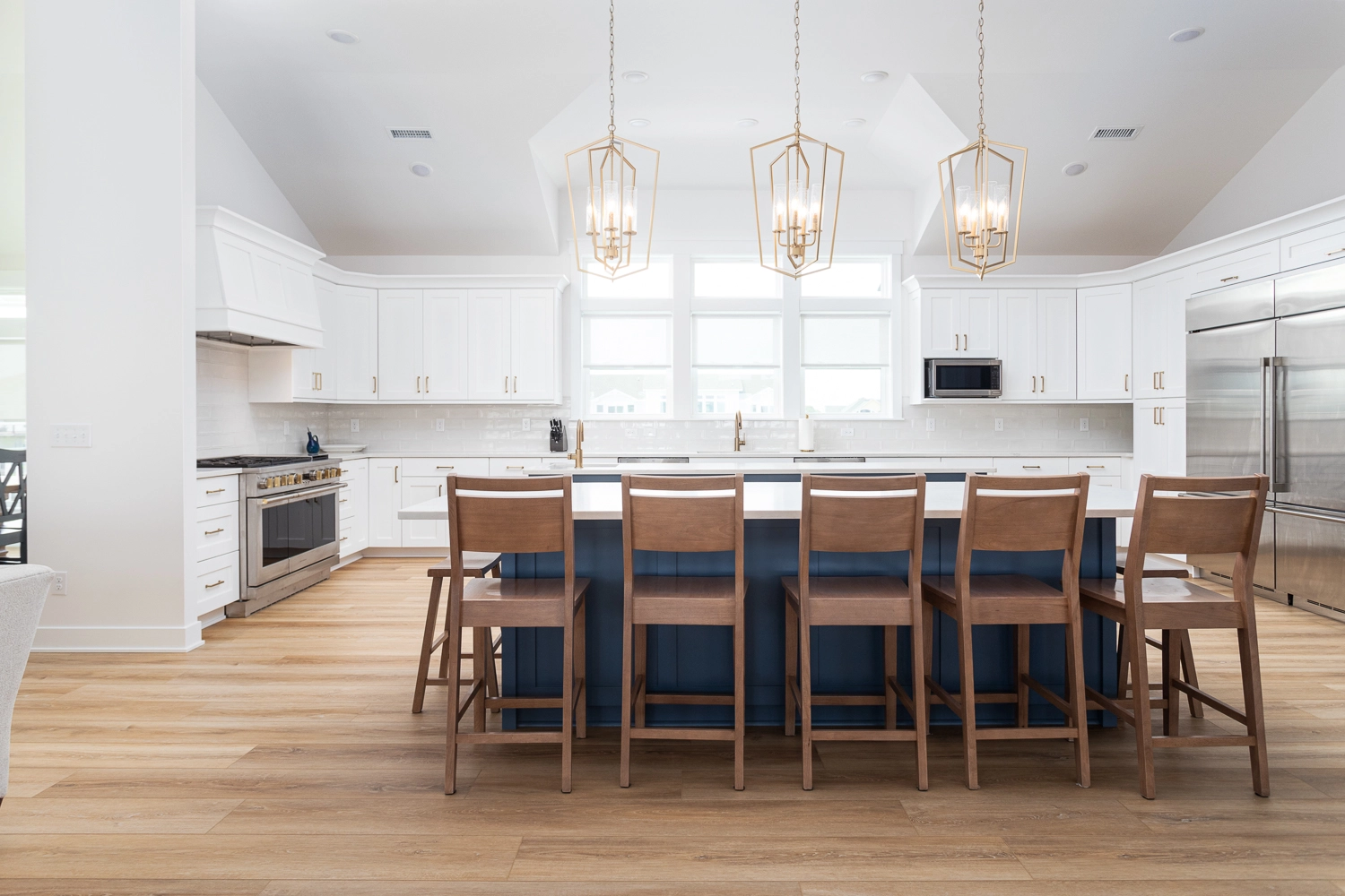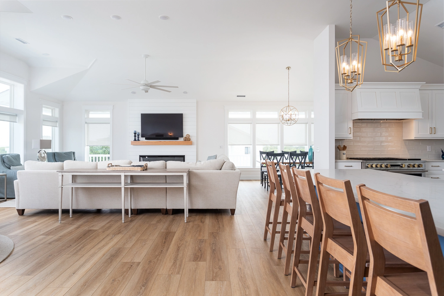Great room with electric fireplace; kitchen with two refrigerators and a 48"professional dual gas range with 6 burners and a griddle; dining area with wet bar and wine refrigerator.