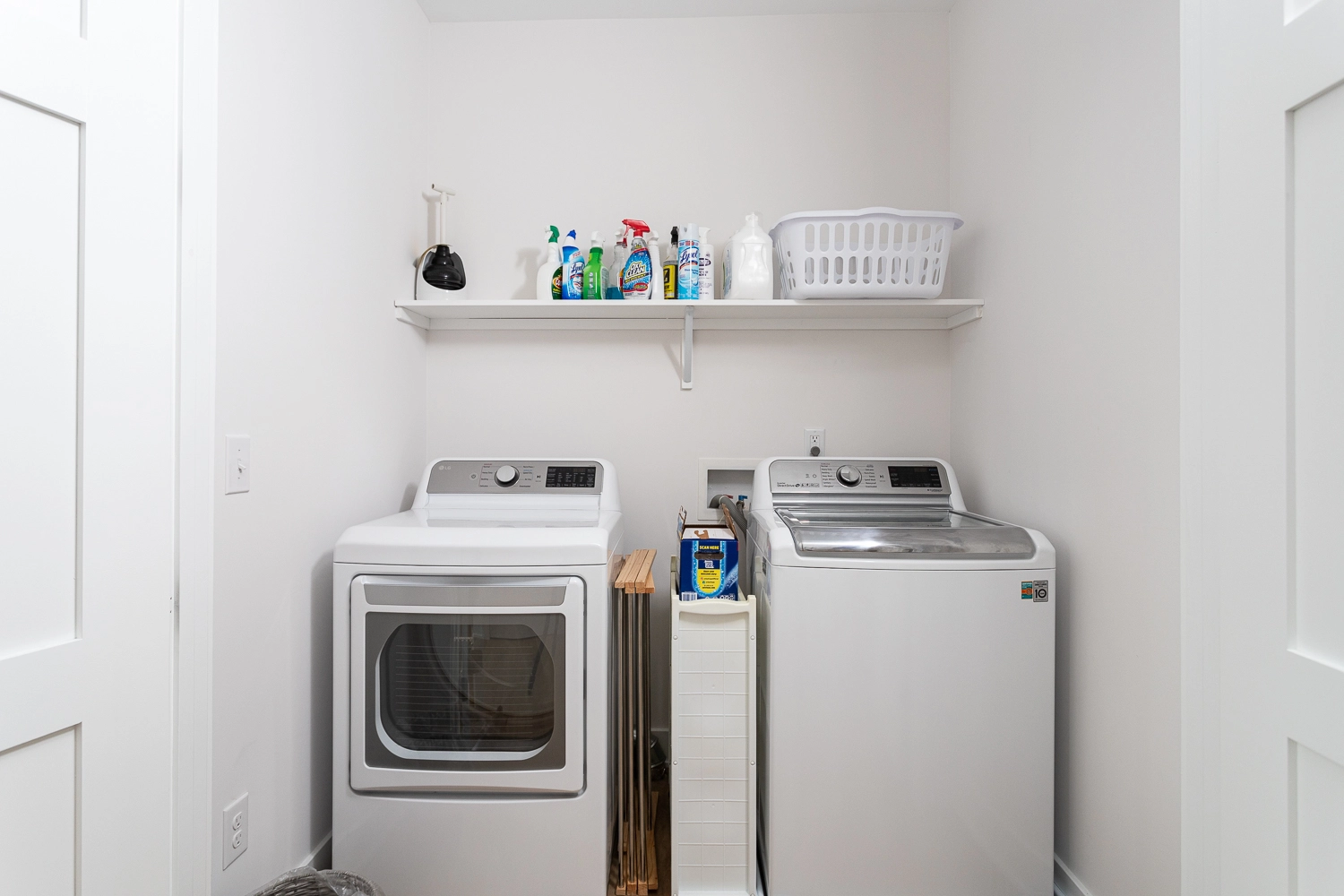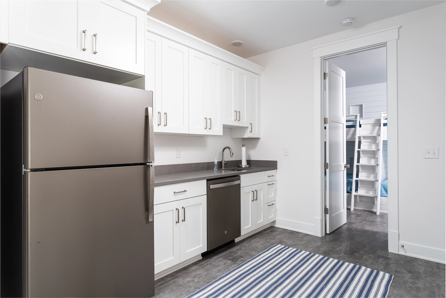 Rec room with pool table and kitchenette with dishwasher and refrigerator; laundry.
