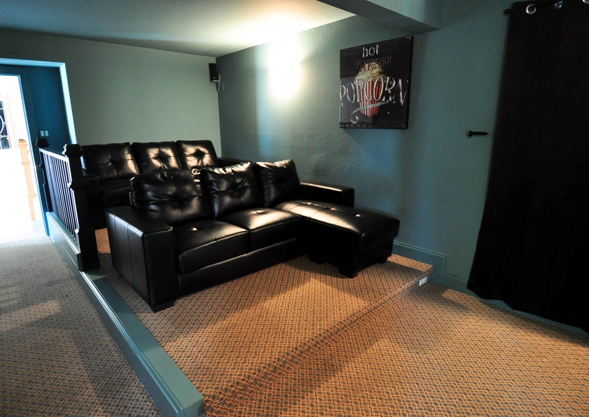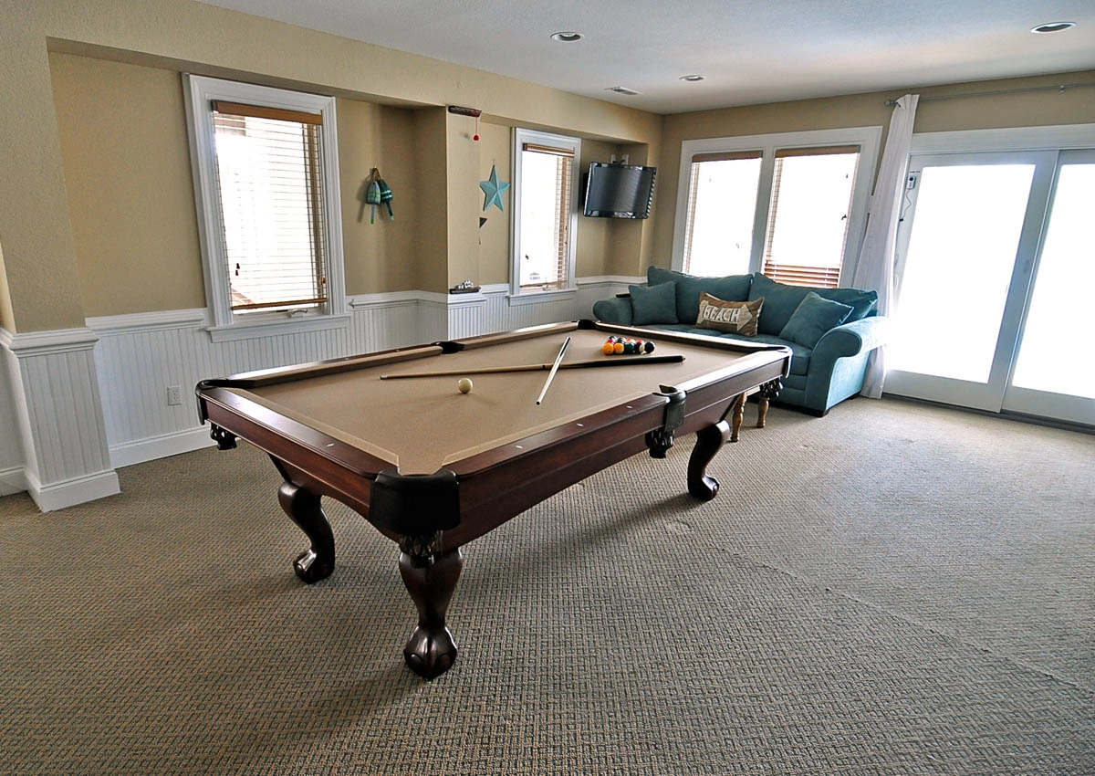 Rec room with pool table, ping pong, foosball and kitchenette; theater room with stadium seating.
