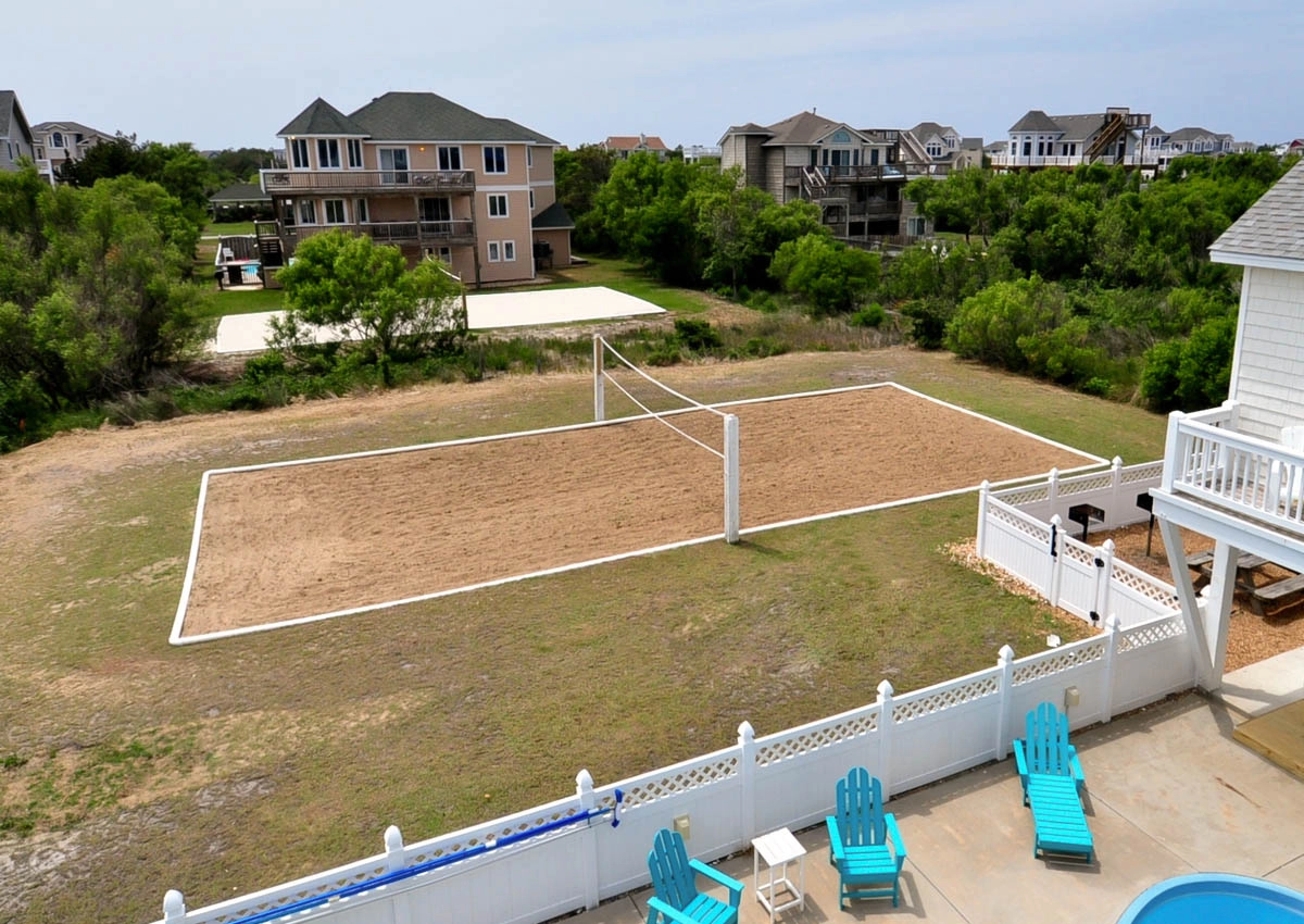 Multiple TVs, hot tub, elevator, volleyball court, basketball goal.