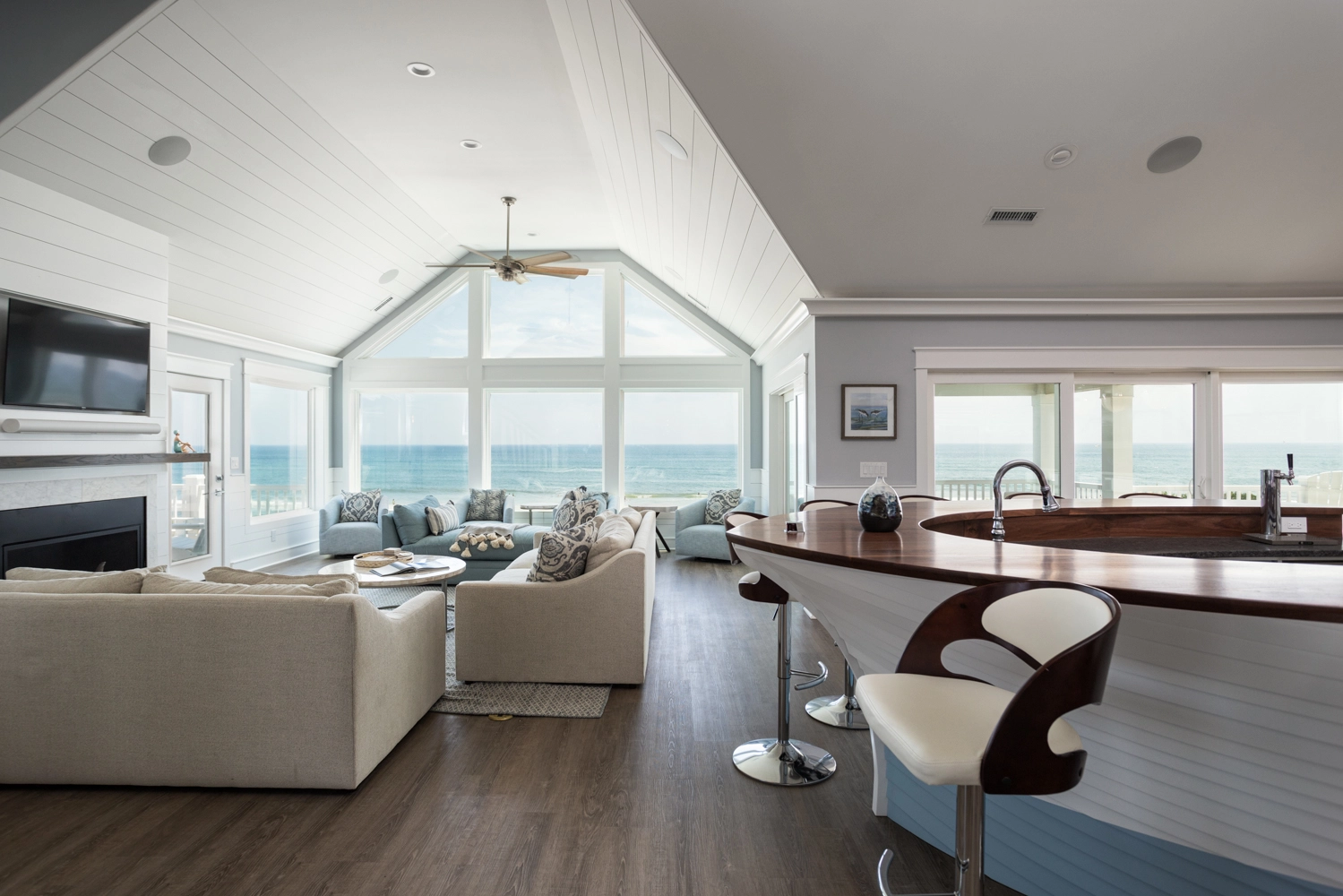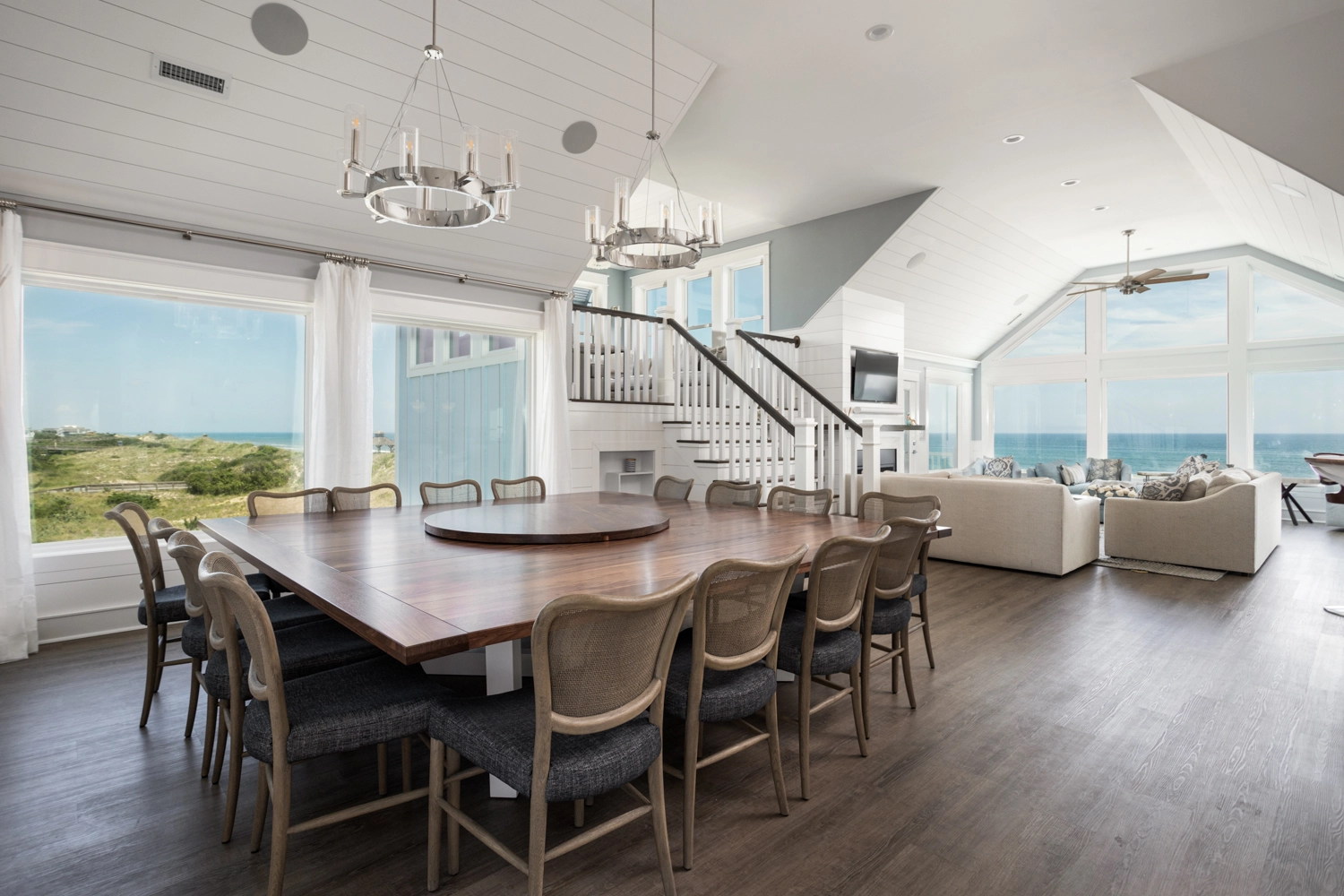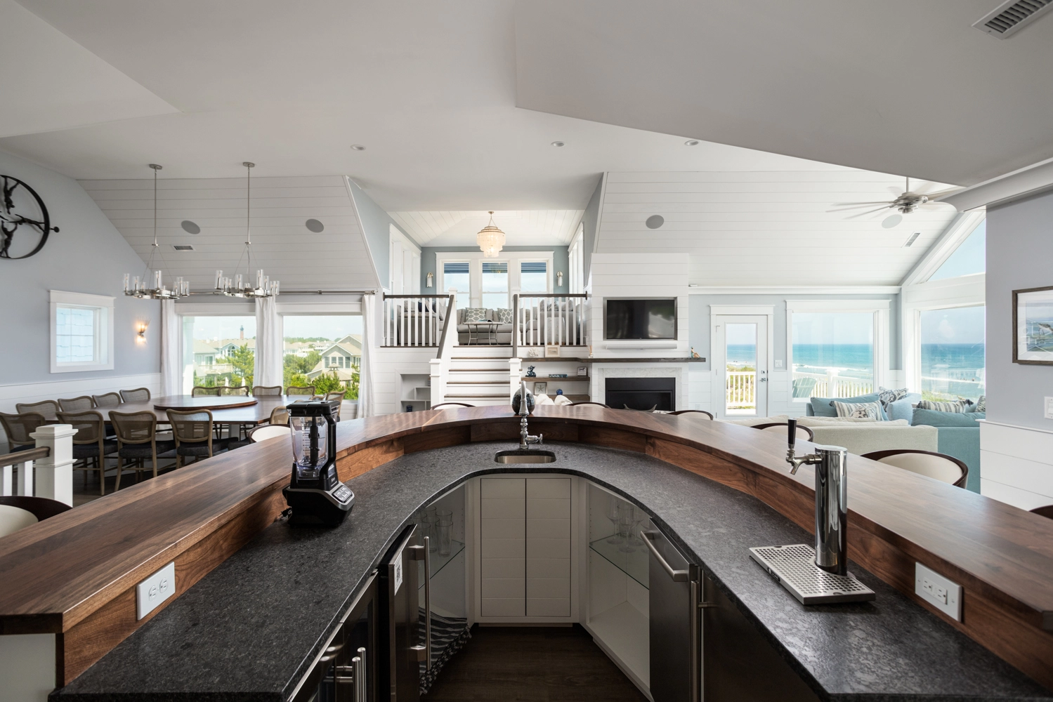 Great room with gas fireplace; kitchen with two refrigerators, two dishwashers, and boat bar; dining area.