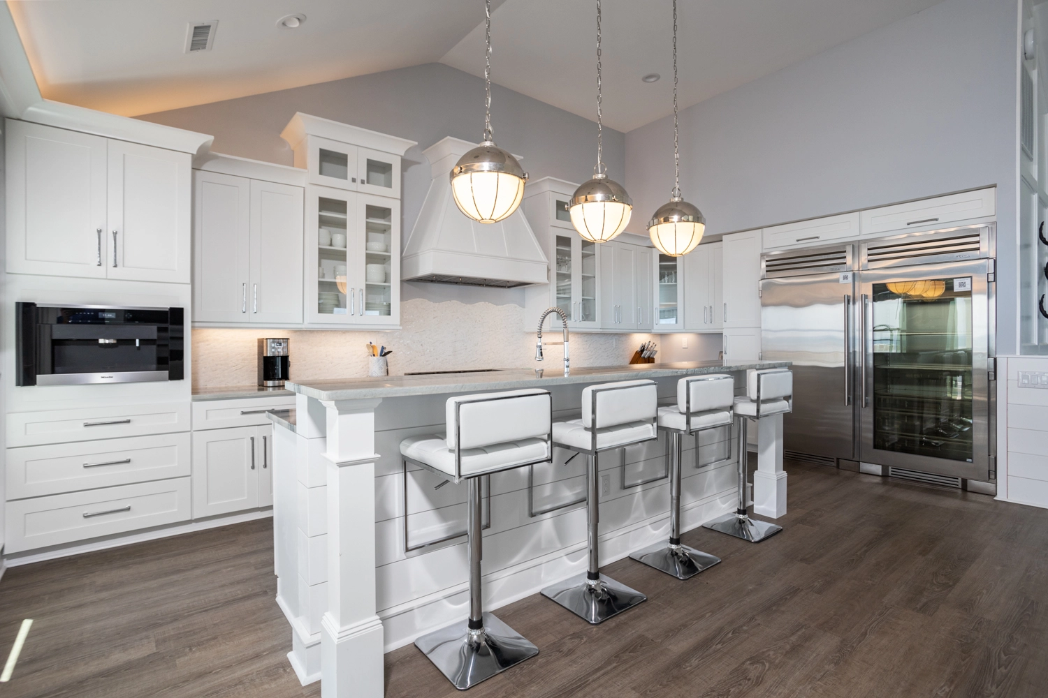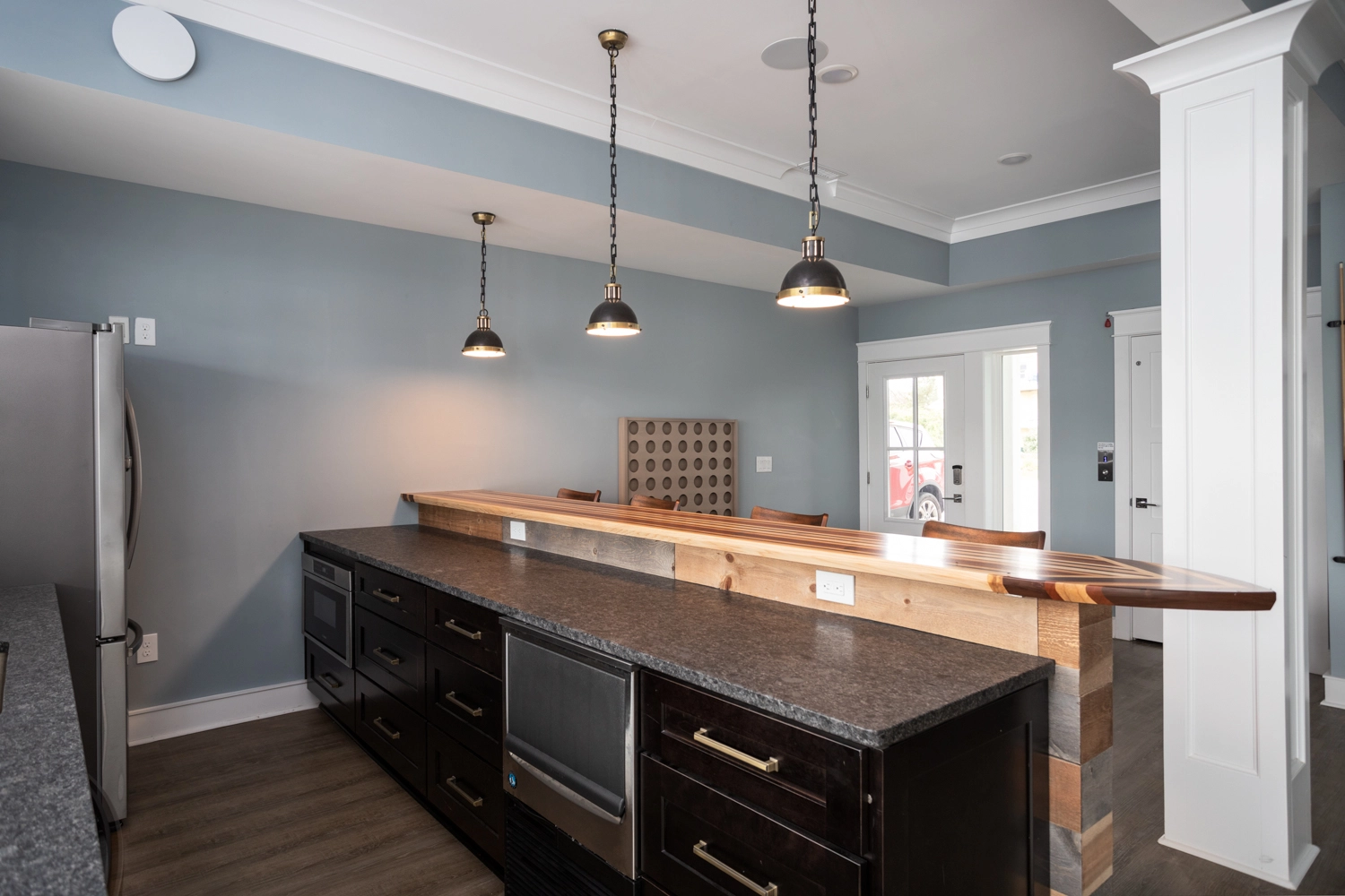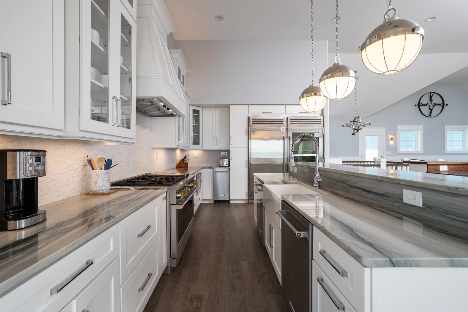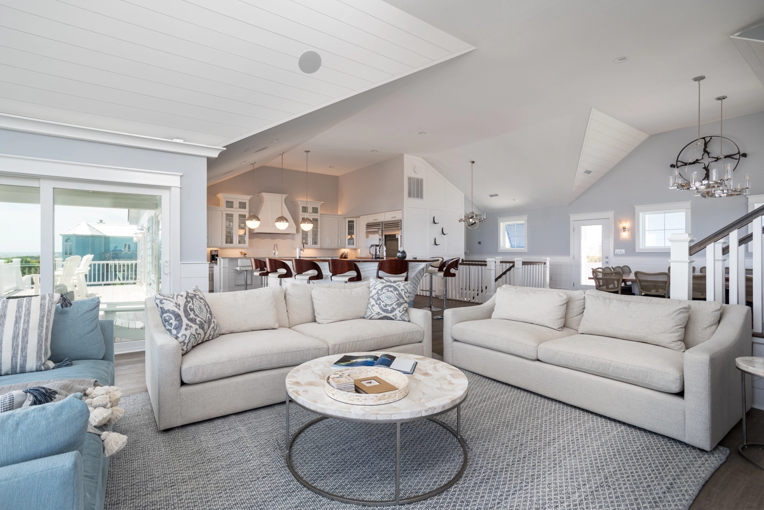 Great room with gas fireplace; kitchen with two refrigerators, two dishwashers, and boat bar; dining area.
