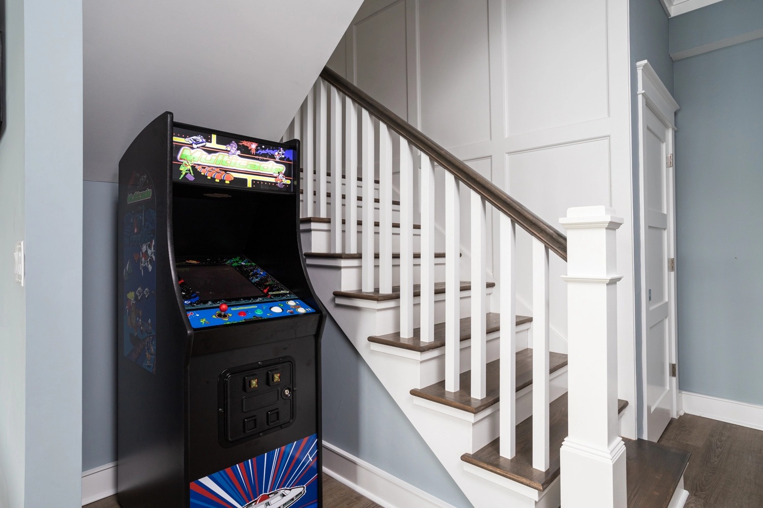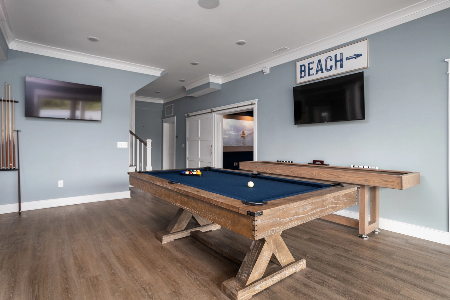 Theater room; rec room with arcade game, game table, bar, and game table.