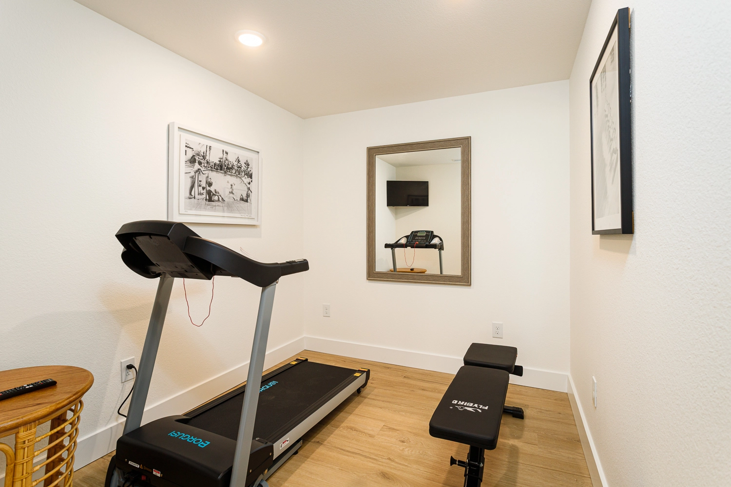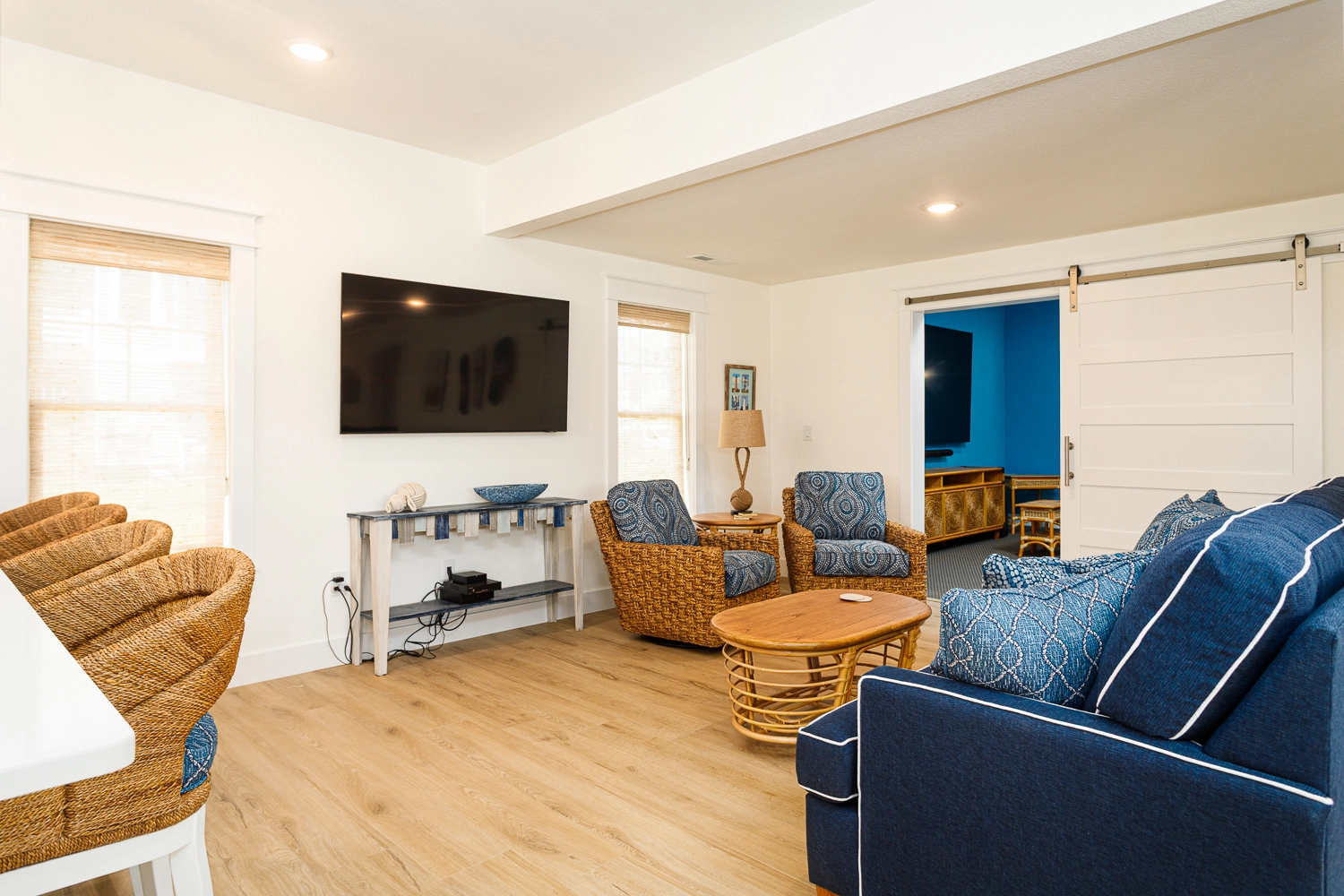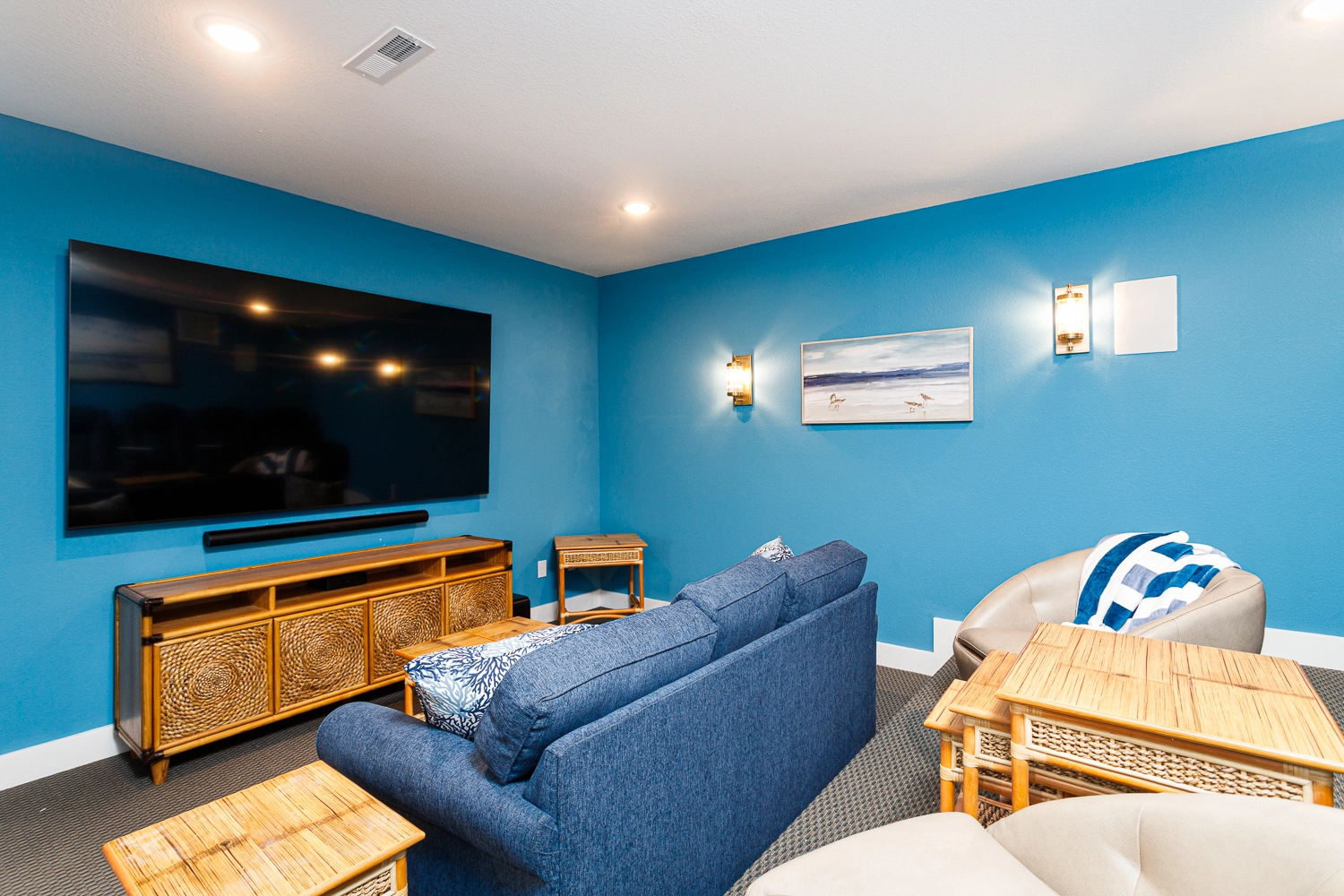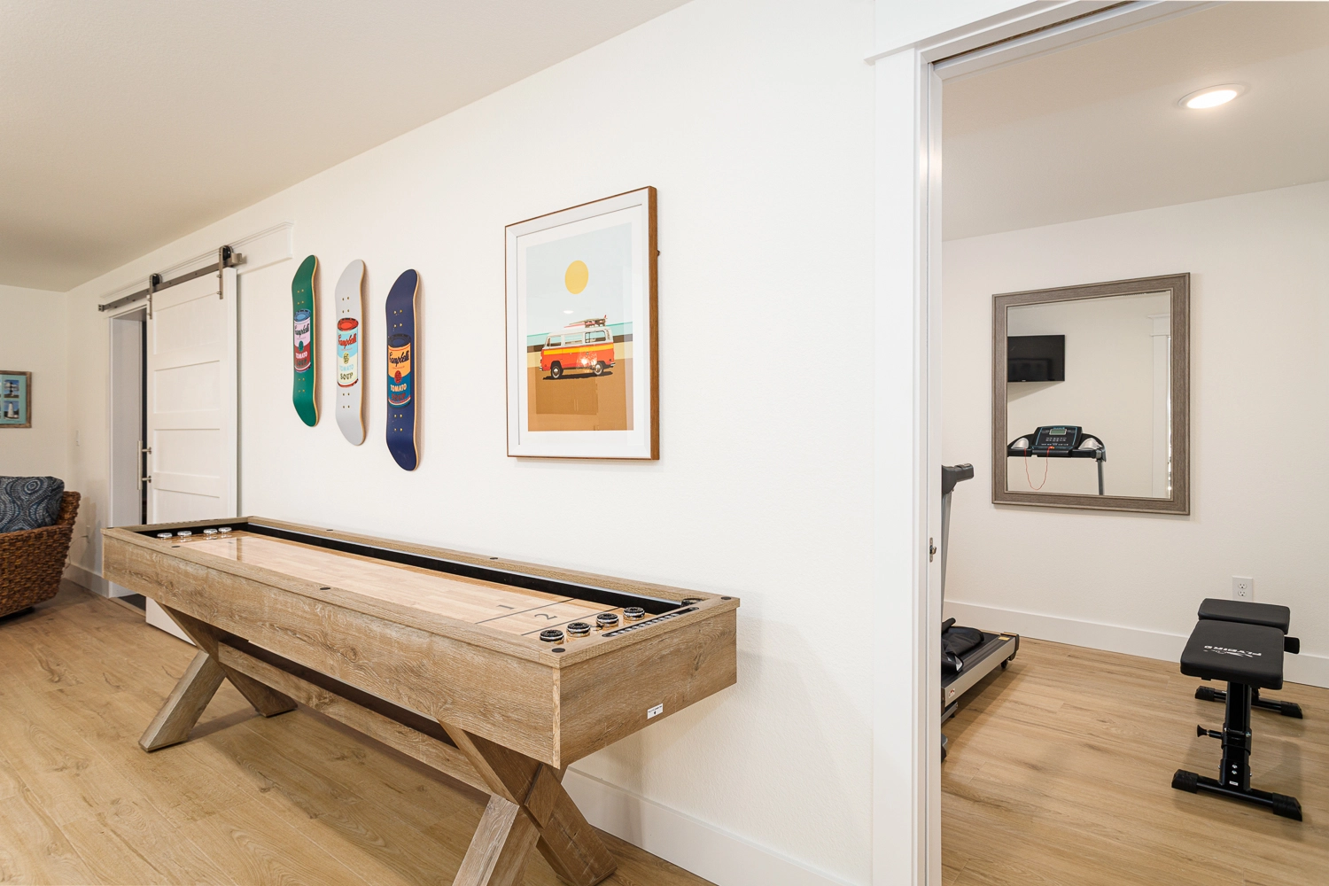 Theater room; rec room with pool table, arcade game, shuffleboard and kitchenette with wet bar with refrigerator, dishwasher, and ice machine; home gym; screened porch with TV.