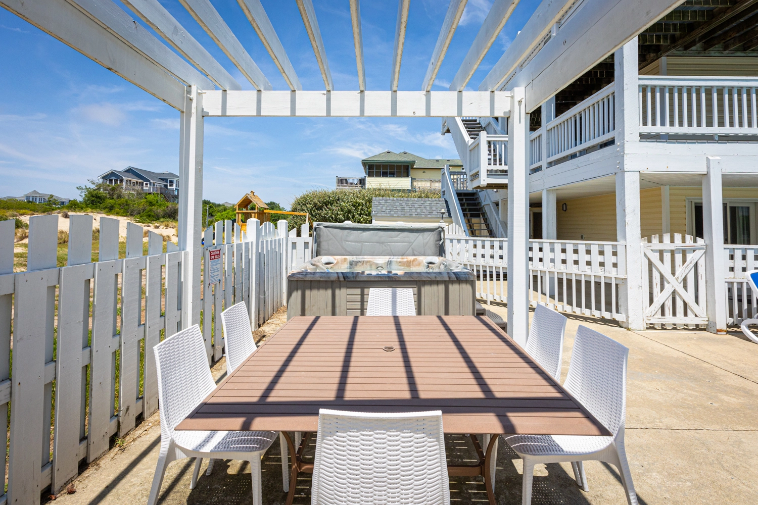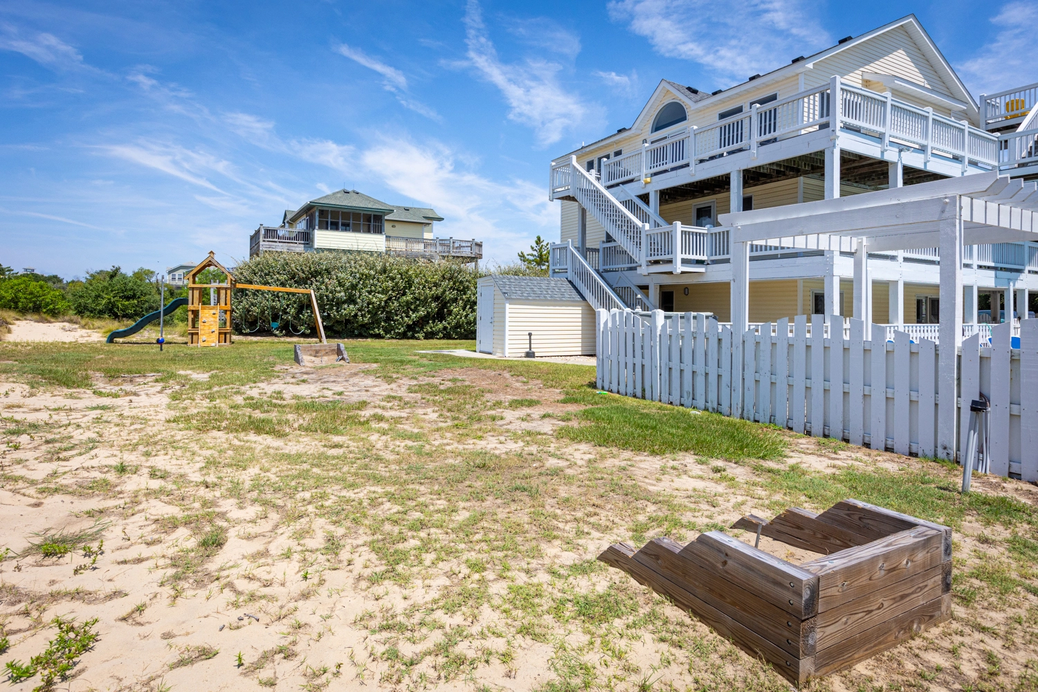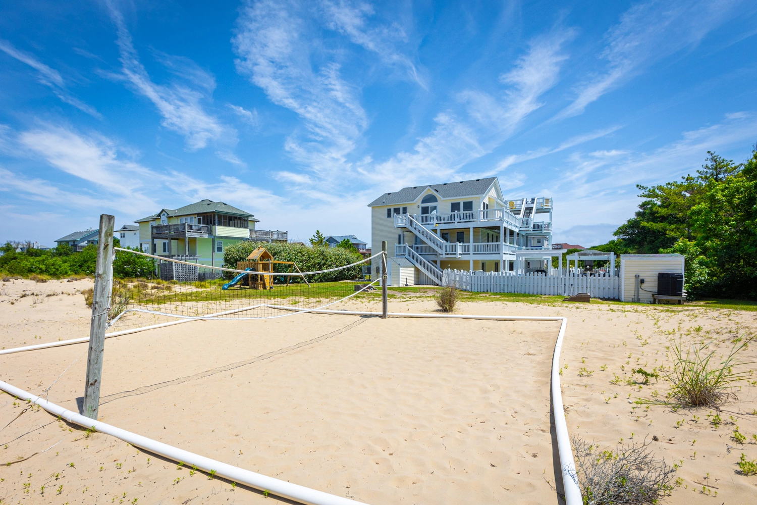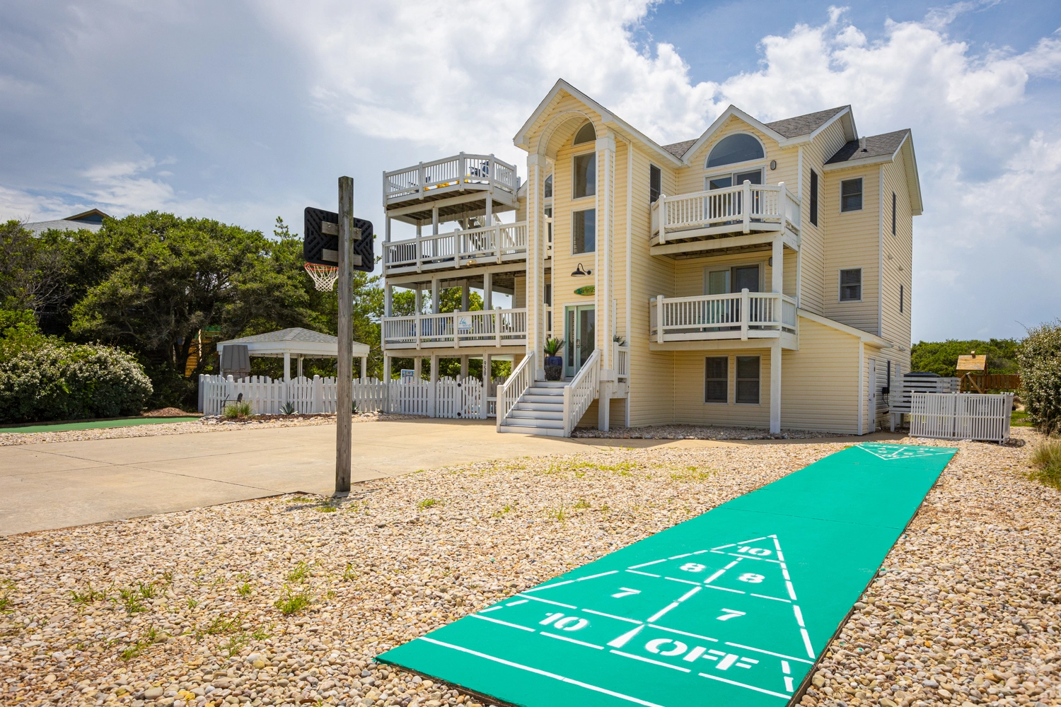 "We loved so many aspects of this home, more than other homes we have stayed at in the OBX. The entire home was beautiful, spacious and clean. The outdoor area was fabulous, we used the pool, the covered area, hot tub, and horseshoes and all of the many decks with so many seating options. The kitchen was well stocked so we had everything we needed. We loved that the upper level was a space where everyone could be together but sill allowed for different areas to hang out in, so no-one was on top of each other, and liked that there was no bedroom on that floor. It was bright and welcoming! We also loved that the midlevel had only bedrooms in it and the lower level was perfect for the kids and parents to be all together. We thought that the den with the additional trundle bed was a nice touch if we had more people. The additional beverage fridge was so great to have, as well. The location was ideal, a short walk to the beach or bike ride if you wanted. The gift certificate for free bagels was also such a nice perk! Would highly recommend! Thank you!"
