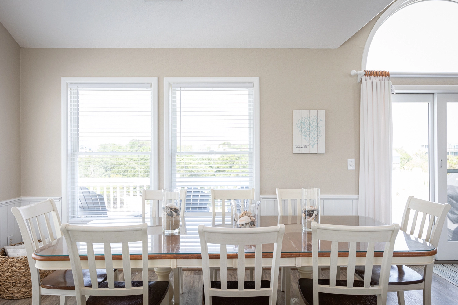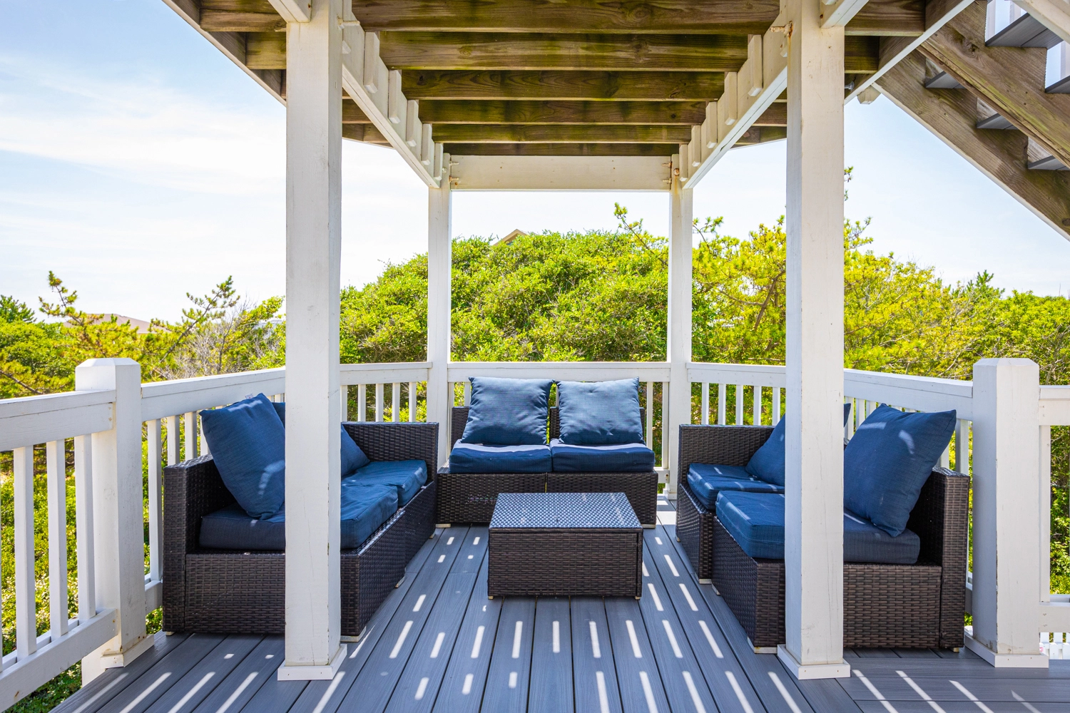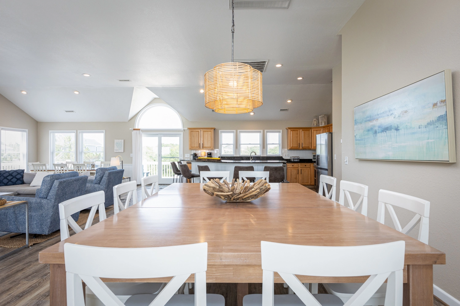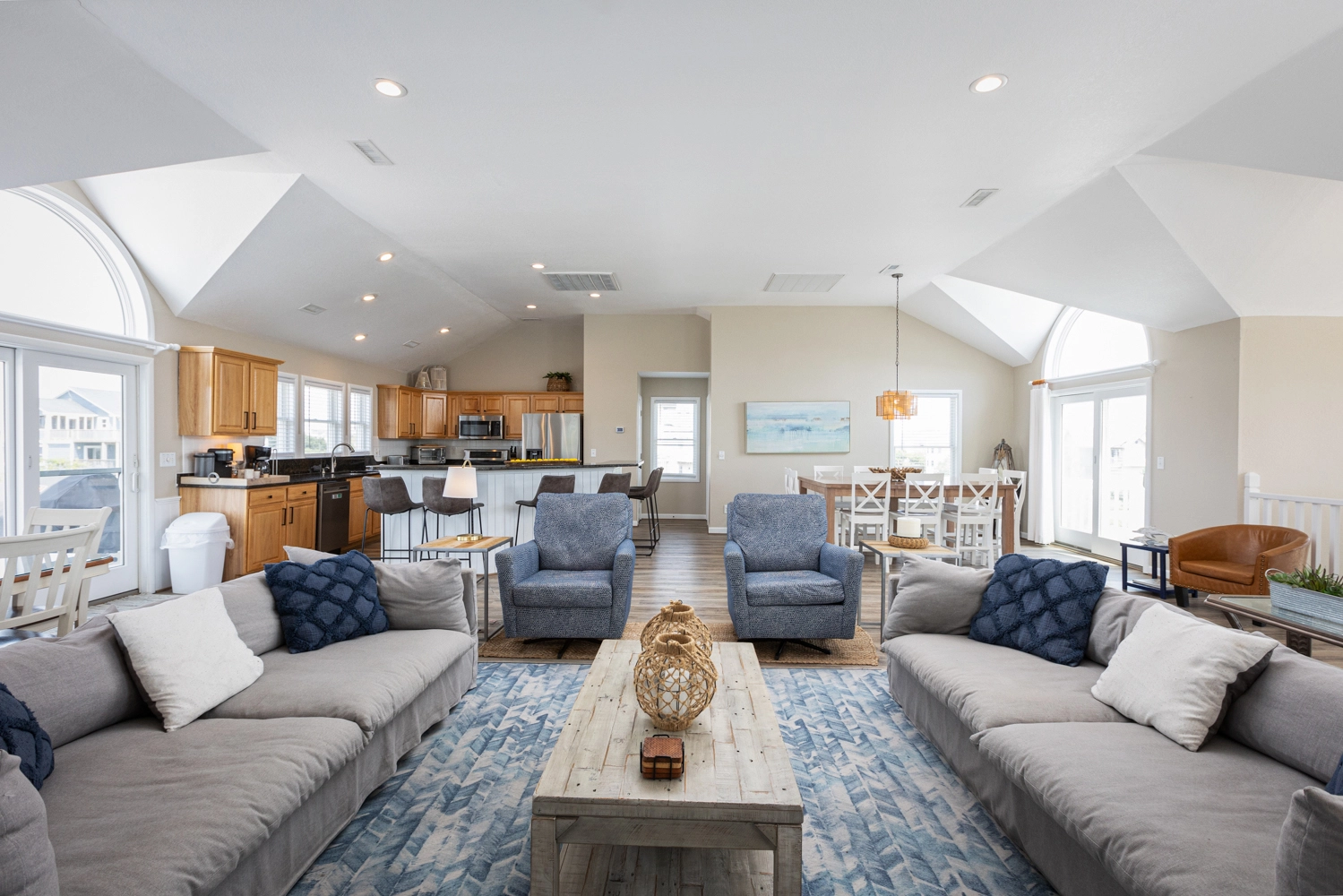 "We loved so many aspects of this home, more than other homes we have stayed at in the OBX. The entire home was beautiful, spacious and clean. The outdoor area was fabulous, we used the pool, the covered area, hot tub, and horseshoes and all of the many decks with so many seating options. The kitchen was well stocked so we had everything we needed. We loved that the upper level was a space where everyone could be together but sill allowed for different areas to hang out in, so no-one was on top of each other, and liked that there was no bedroom on that floor. It was bright and welcoming! We also loved that the midlevel had only bedrooms in it and the lower level was perfect for the kids and parents to be all together. We thought that the den with the additional trundle bed was a nice touch if we had more people. The additional beverage fridge was so great to have, as well. The location was ideal, a short walk to the beach or bike ride if you wanted. The gift certificate for free bagels was also such a nice perk! Would highly recommend! Thank you!"