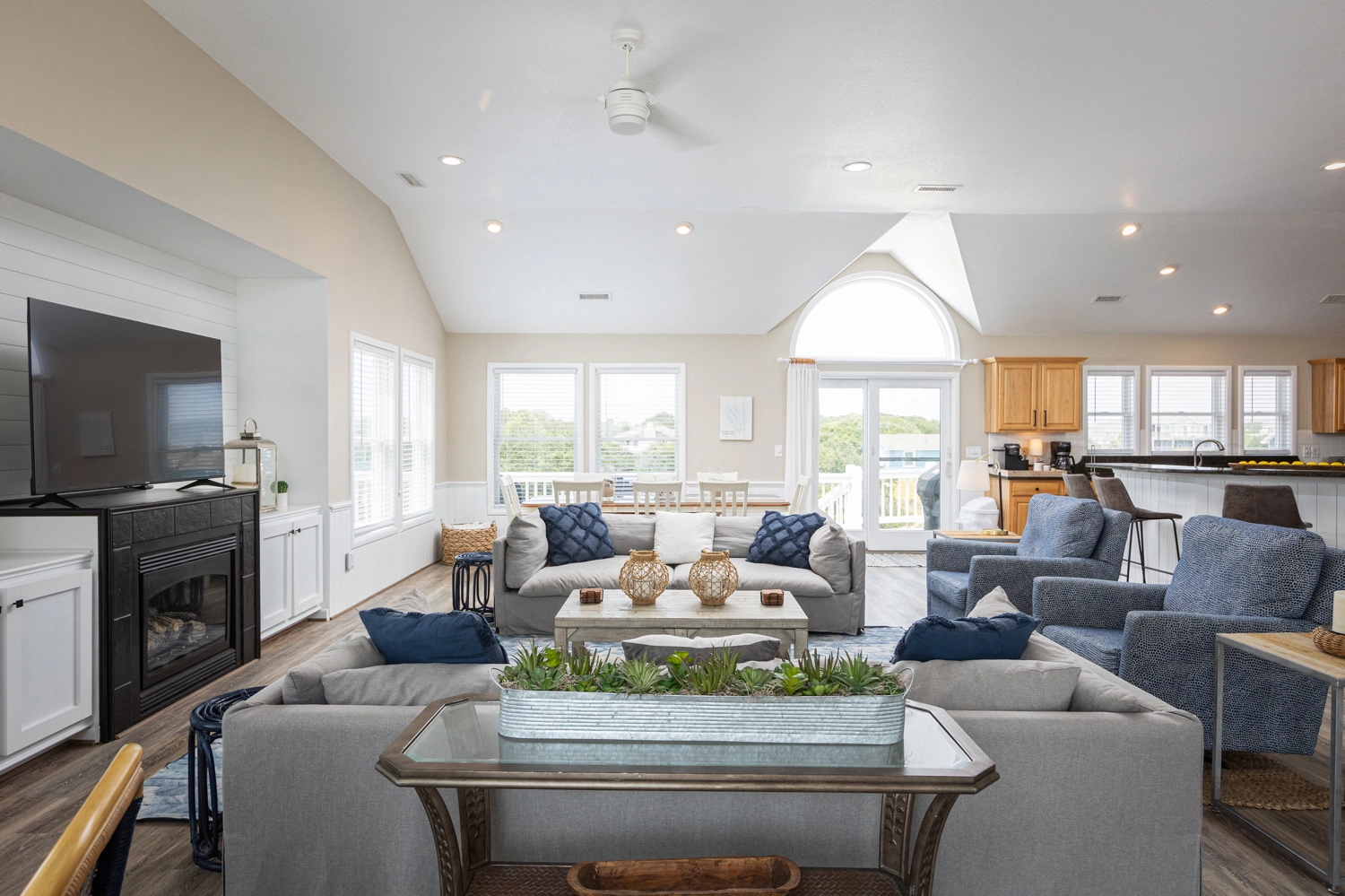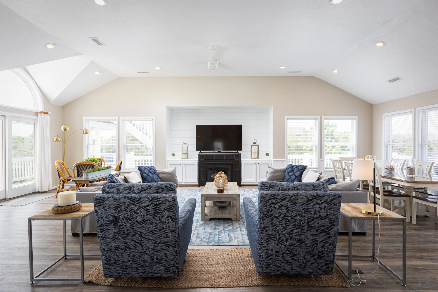 Great room (gas fireplace is decorative, not functional); kitchen with double oven and two dishwashers; dining area.