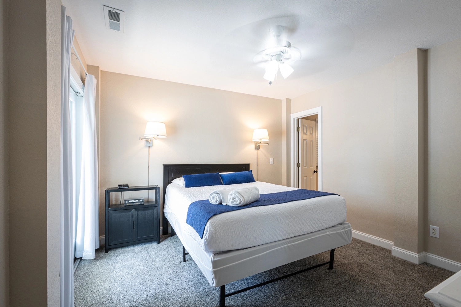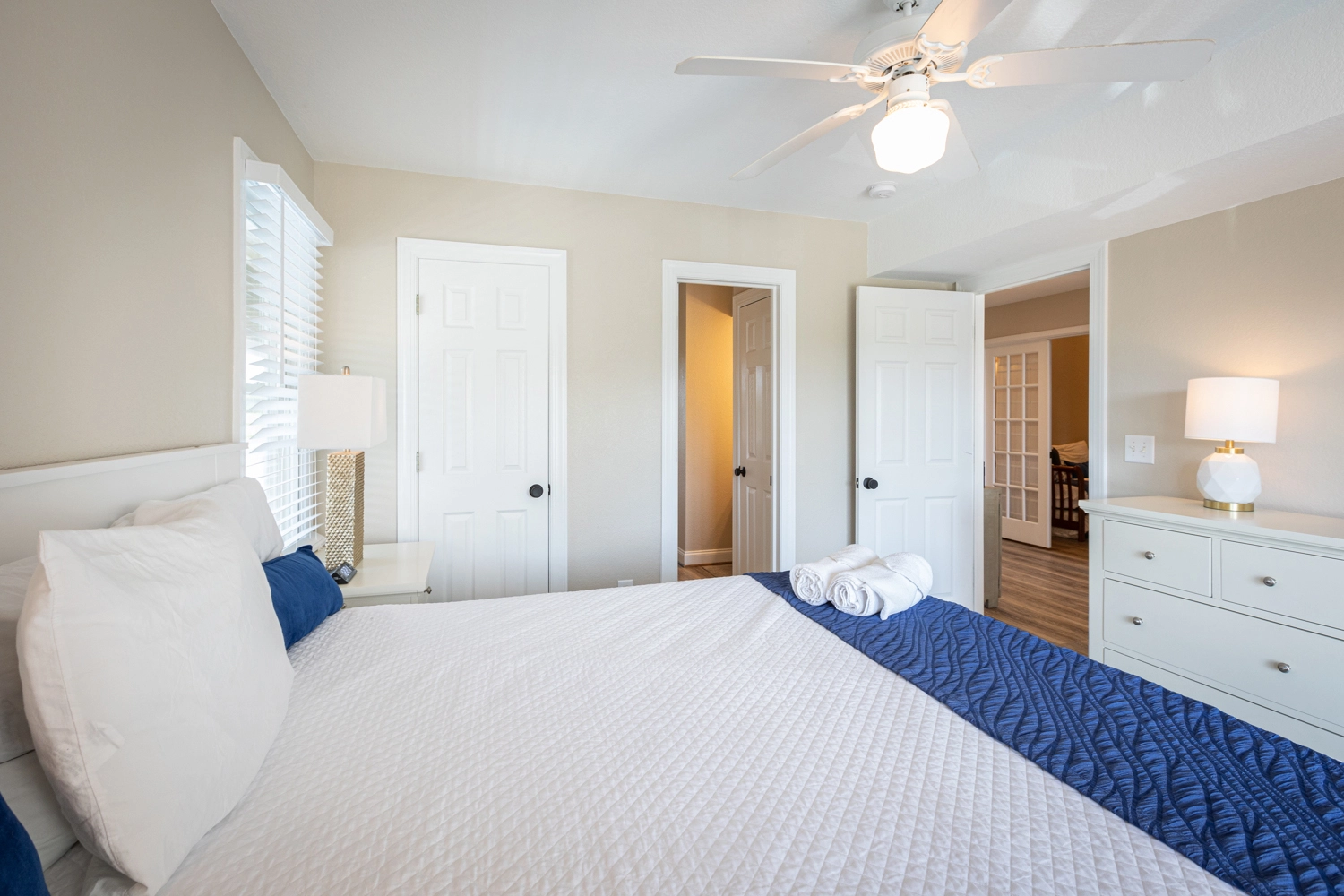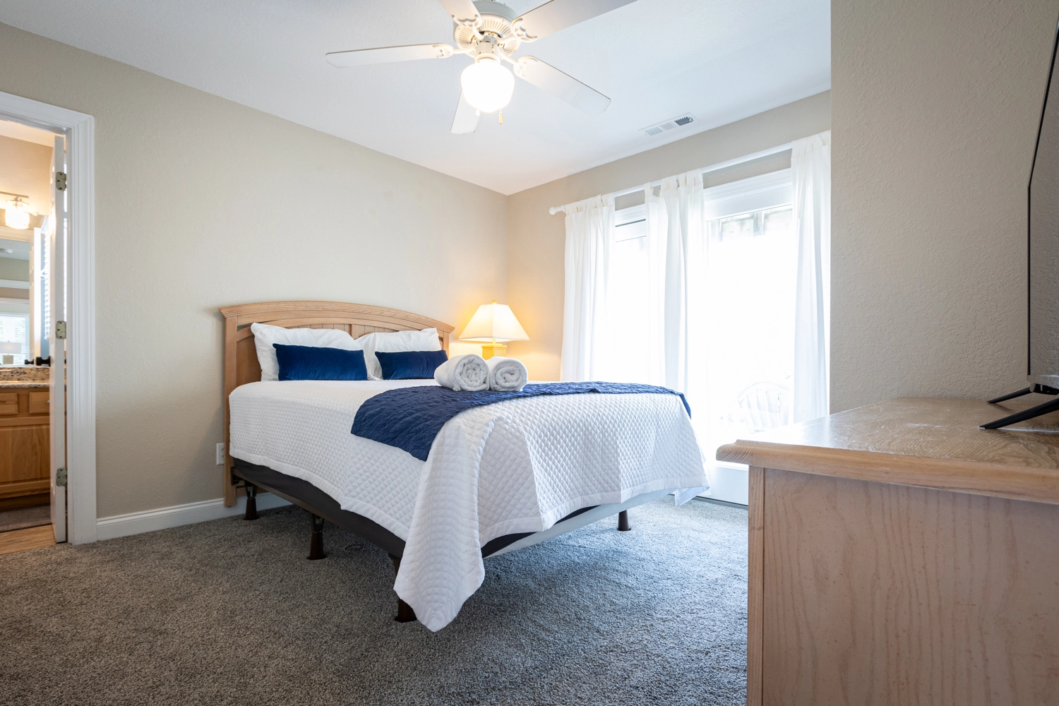 Queen, Shared bath with Den, Shower/tub combo, Deck access